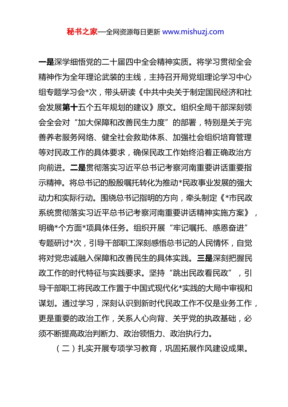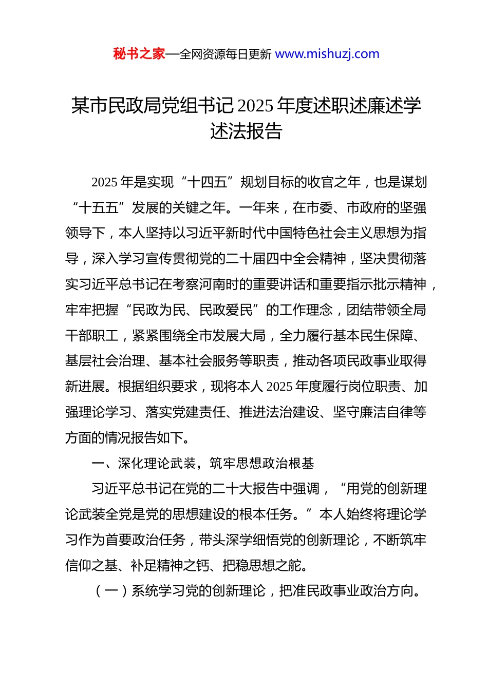 秘书之家—全网资源每日更新 www.mishuzj.com某市民政局党组书记 2025 年度述职述廉述学述法报告 2025 年是实现“十四五”规划目标的收官之年,也是谋划“十五五”发展的关键之年。一年来,在市委、市政府的坚强领导下,本人坚持以习近平新时代中国特色社会主义思想为指导,深入学习宣传贯彻党的二十届四中全会精神,坚决贯彻落实习近平总书记在考察河南时的重要讲话和重要指示批示精神,牢牢把握“民政为民、民政爱民”的工作理念,团结带领全局干部职工,紧紧围绕全市发展大局,全力履行基本民生保障、基层社会治理、基本社会服务等职责,推动各项民政事业取得新进展。根据组织要求,现将本人 2025 年度履行岗位职责、加强理论学习、落实党建责任、推进法治建设、坚守廉洁自律等方面的情况报告如下。一、深化理论武装,筑牢思想政治根基习近平总书记在党的二十大报告中强调,“用党的创新理论武装全党是党的思想建设的根本任务。”本人始终将理论学习作为首要政治任务,带头深学细悟党的创新理论,不断筑牢信仰之基、补足精神之钙、把稳思想之舵。(一)系统学习党的创新理论,把准民政事业政治方向。秘书之家—全网资源每日更新 www.mishuzj.com一是深学细悟党的二十届四中全会精神实质。将学习贯彻全会精神作为全年理论武装的主线,主持召开局党组理论学习中心组专题学习会*次,带头研读《中共中央关于制定国民经济和社会发展第十五个五年规划的建议》原文。组织全局干部深刻领会全会对“加大保障和改善民生力度”的部署,特别是关于完善养老服务网络、健全社会救助体系、加强社会组织培育管理等对民政工作的具体要求,确保民政工作始终沿着正确政治方向前进。二是贯彻落实习近平总书记考察河南重要讲话重要指示精神。将总书记的殷殷嘱托转化为推动*民政事业发展的强大动力和实际行动。围绕总书记指明的方向,牵头制定《*市民政系统贯彻落实习近平总书记考察河南重要讲话精神实施方案》,明确*个方面*项具体任务。组织开展“牢记嘱托、感恩奋进”专题研讨*次,引导干部职工深刻感悟总书记的人民情怀,自觉将对党忠诚融入保障和改善民生的具体实践。三是深刻把握民政工作的时代特征与实践要求。坚持“跳出民政看民政”,引导干部职工将民政工作置于中国式现代化*实践的大局中审视和谋划。通过学习,深刻认识到新时代民政工作不仅是业务工作,更是重要的政治工作,关系人心向背、关乎党的执政基础,必须不断提高政治判断力、政治领悟力、政治执行力。(二)扎实开展专项学习教育,巩固拓展作风建设成果。秘书之家—全网资源每日更新 www.mishuzj.com一是高标准开展深入贯彻中央八项规定精神学习教育。严格履行第一责任人职责,主持制定局学习教育方案并动员部署。带头深入学习习近平总书记关于作风建设的重要论述和中央八项规定及其实施细则精神,组织专题学习*场,本人讲授专题党课*次。通过学习教育,全局党员干部对作风建设的极端重要性认识更加深刻,纠治“四风”的思想自觉和行动自觉显著增强。二是推动学习教育与为民实践深度融合。坚决反对形式主义,将学习教育的落脚点放在解决群众急难愁盼问题上。部署开展民政领域殡葬、养老、救助、慈善等群众身边不正之风和腐败问题集中整治。推动“高效办成一件事”改革,优化服务流程*项,群众满意度提升至*%。三是健全作风建设常态长效机制。主持修订完善局内控制度*项,重点规范公务接待、会议活动、调查研究等方面。建立作风建设定期分析研判机制,每季度听取一次专题汇报。学习教育期间查摆出的*个问题已全部整改完毕,并转化为制度成果,推动作风建设常态化长效化。(三)坚决扛起政治责任,全面落实意识形态与巡视整改一是严格履行意识形态工作责任制。主持召开局党组会专题研究意识形态工作*次,将意识形态工作纳入领导班子民主生活会、述职评议和干部考核的重要内容。加强对局门户网站、微信公众号等阵地的建设与管理,全年发布信息**篇,未发生重大负秘书之家—全网资源每日更新 www.mishuzj.com面舆情。组织对直属单位意识形态工作开展专项督查*次,对发现的*个薄弱环节督促整改到位。二是不折不扣抓牢巡视巡...