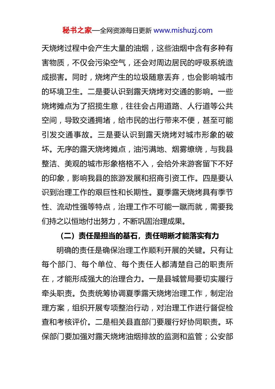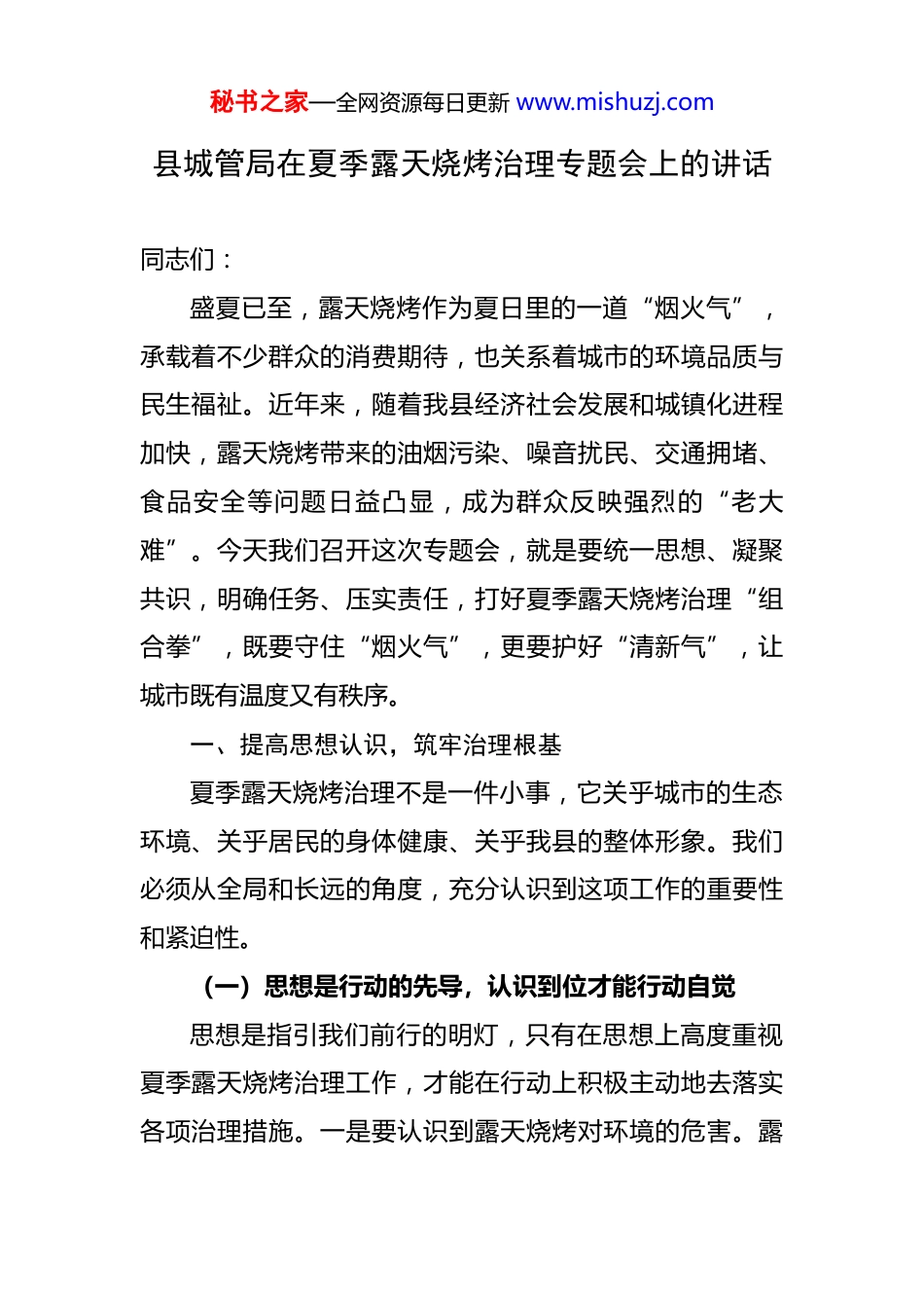 秘书之家—全网资源每日更新 www.mishuzj.com县城管局在夏季露天烧烤治理专题会上的讲话 同志们:盛夏已至,露天烧烤作为夏日里的一道“烟火气”,承载着不少群众的消费期待,也关系着城市的环境品质与民生福祉。近年来,随着我县经济社会发展和城镇化进程加快,露天烧烤带来的油烟污染、噪音扰民、交通拥堵、食品安全等问题日益凸显,成为群众反映强烈的“老大难”。今天我们召开这次专题会,就是要统一思想、凝聚共识,明确任务、压实责任,打好夏季露天烧烤治理“组合拳”,既要守住“烟火气”,更要护好“清新气”,让城市既有温度又有秩序。一、提高思想认识,筑牢治理根基夏季露天烧烤治理不是一件小事,它关乎城市的生态环境、关乎居民的身体健康、关乎我县的整体形象。我们必须从全局和长远的角度,充分认识到这项工作的重要性和紧迫性。(一)思想是行动的先导,认识到位才能行动自觉思想是指引我们前行的明灯,只有在思想上高度重视夏季露天烧烤治理工作,才能在行动上积极主动地去落实各项治理措施。一是要认识到露天烧烤对环境的危害。露秘书之家—全网资源每日更新 www.mishuzj.com天烧烤过程中会产生大量的油烟,这些油烟中含有多种有害物质,不仅会污染空气,还会对周边居民的呼吸系统造成损害。同时,烧烤产生的垃圾随意丢弃,也会影响城市的环境卫生。二是要认识到露天烧烤对交通的影响。一些烧烤摊点为了招揽生意,往往会占用道路、人行道等公共空间,导致交通拥堵,给市民的出行带来不便,甚至可能引发交通事故。三是要认识到露天烧烤对城市形象的破坏。无序的露天烧烤摊点,油污满地、烟雾缭绕,与我县整洁、美观的城市形象格格不入,会给外来游客留下不好的印象,影响我县的旅游发展和招商引资工作。四是要认识到治理工作的艰巨性和长期性。夏季露天烧烤具有季节性、流动性强等特点,治理工作不可能一蹴而就,需要我们持之以恒地付出努力,不断巩固治理成果。(二)责任是担当的基石,责任明晰才能落实有力明确的责任是确保治理工作顺利开展的关键。只有让每个部门、每个单位、每个责任人都清楚自己的职责所在,才能形成强大的治理合力。一是县城管局要切实履行牵头职责。负责统筹协调夏季露天烧烤治理工作,制定治理方案,组织开展专项整治行动,对治理工作进行督促检查和考核评价。二是相关县直部门要履行好协同职责。环保部门要加强对露天烧烤油烟排放的监测和监管;公安部秘书之家—全网资源每日更新 www.mishuzj.com门要维护好烧烤摊点周边的交通秩序和社会治安;市场监管部门要规范烧烤店的经营行为,查处无照经营等违法违规行为。三是乡镇(街道)要履行好属地管理职责。负责本辖区内露天烧烤摊点的排查、登记和日常管理工作,及时发现和制止违法违规经营行为,配合相关部门开展专项整治行动。四是烧烤店经营者要履行好主体责任。自觉遵守法律法规和相关规定,规范经营行为,保持经营场所的环境卫生,减少油烟排放和噪音污染。(三)群众是力量的源泉,群众支持才能事半功倍群众是城市的主人,夏季露天烧烤治理工作与群众的切身利益息息相关,只有得到群众的支持和参与,治理工作才能取得事半功倍的效果。一是要广泛听取群众意见。在制定治理方案、开展整治行动等过程中,要通过问卷调查、座谈会等多种形式,广泛征求群众的意见和建议,使治理工作更加符合群众的需求。二是要及时回应群众关切。对于群众反映的露天烧烤污染环境、影响交通等问题,要及时进行调查处理,并将处理结果向群众反馈,让群众感受到治理工作的成效。三是要引导群众参与监督。建立健全群众监督机制,公布举报电话和邮箱,鼓励群众对违法违规的露天烧烤摊点进行举报,形成全社会共同参与治理的良好氛围。四是要加强对群众的宣传教育。通过秘书之家—全网资源每日更新 www.mishuzj.com多种渠道向群众宣传露天烧烤的危害和治理工作的重要性,提高群众的环保意识和文明意识,引导群众自觉抵制违法违规露天烧烤。(四)长效是治理的目标,机制健全才能持续见效夏季露天烧烤治理工作不能只停留在表面,更要建立健全长效机制,确保治理成果能够得到长期巩固。一是要建立健全常态化...