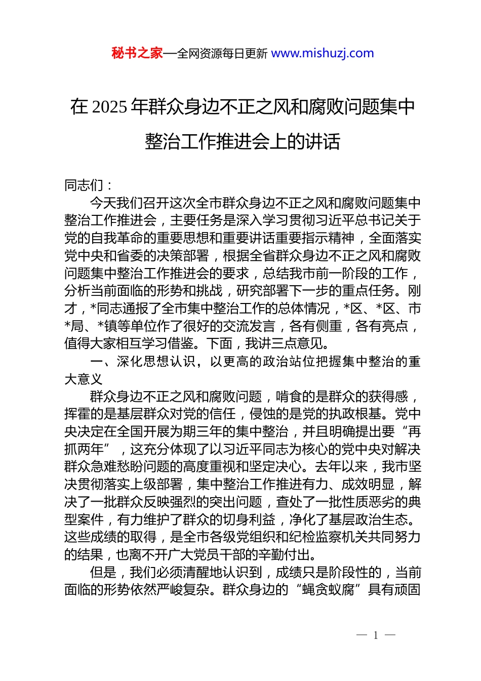秘书之家—全网资源每日更新 www.mishuzj.com在 2025 年群众身边不正之风和腐败问题集中整治工作推进会上的讲话同志们:今天我们召开这次全市群众身边不正之风和腐败问题集中整治工作推进会,主要任务是深入学习贯彻习近平总书记关于党的自我革命的重要思想和重要讲话重要指示精神,全面落实党中央和省委的决策部署,根据全省群众身边不正之风和腐败问题集中整治工作推进会的要求,总结我市前一阶段的工作,分析当前面临的形势和挑战,研究部署下一步的重点任务。刚才,*同志通报了全市集中整治工作的总体情况,*区、*区、市*局、*镇等单位作了很好的交流发言,各有侧重,各有亮点,值得大家相互学习借鉴。下面,我讲三点意见。一、深化思想认识,以更高的政治站位把握集中整治的重大意义群众身边不正之风和腐败问题,啃食的是群众的获得感,挥霍的是基层群众对党的信任,侵蚀的是党的执政根基。党中央决定在全国开展为期三年的集中整治,并且明确提出要“再抓两年”,这充分体现了以习近平同志为核心的党中央对解决群众急难愁盼问题的高度重视和坚定决心。去年以来,我市坚决贯彻落实上级部署,集中整治工作推进有力、成效明显,解决了一批群众反映强烈的突出问题,查处了一批性质恶劣的典型案件,有力维护了群众的切身利益,净化了基层政治生态。这些成绩的取得,是全市各级党组织和纪检监察机关共同努力的结果,也离不开广大党员干部的辛勤付出。但是,我们必须清醒地认识到,成绩只是阶段性的,当前面临的形势依然严峻复杂。群众身边的“蝇贪蚁腐”具有顽固— 1 —秘书之家—全网资源每日更新 www.mishuzj.com性、反复性,一些问题在一些地方和领域仍然易发多发,整治的深度和广度还需要进一步拓展,常态长效的制度机制还有待健全。对此,我们绝不能有丝毫的松懈和自满。全市上下必须进一步提高政治站位,从全局和战略的高度,深刻认识深化集中整治工作的极端重要性和现实紧迫性。第一,深化集中整治是践行“两个维护”的实际行动。党的十八大以来,习近平总书记反复强调,民心是最大的政治。人民群众反对什么、痛恨什么,我们就要坚决防范和纠正什么。开展集中整治,直接回应了人民群众的关切,是把以人民为中心的发展思想落到实处的具体体现。我们抓好这项工作,就是要通过解决好群众身边的一个个具体问题,让群众真切感受到党中央的关心就在身边、正风肃纪反腐就在眼前,从而更加坚定地拥护党的领导,更加自觉地同以习近平同志为核心的党中央保持高度一致。这既是重要的民生工作,更是严肃的政治任务。第二,深化集中整治是推进全面从严治党的关键抓手。全面从严治党,最关键的就是要向基层延伸,打通“最后一公里”。群众看反腐,不仅看查处了多少大案要案,更看身边的小事、急事、难事有没有人管、能不能解决好。如果基层干部作风不正、处事不公、以权谋私,就会让群众对我们党的全部工作产生怀疑。因此,我们必须以“零容忍”的态度,坚决整治群众身边的腐败和作风问题,推动全面从严治党向基层一线、向群众身边有效覆盖。这不仅是净化基层政治生态的需要,更是厚植党的执政基础、巩固党的执政地位的必然要求。第三,深化集中整治是保障和改善民生的重要举措。我们推进高质量发展,最终目的是为了让人民群众过上更加幸福美好的生活。然而,在一些民生领域,截留挪用、虚报冒领、优亲厚友等问题时有发生,这些问题直接侵害群众的切身利益,严重影响党和政府惠民政策的落地见效。深化集中整治,就是要聚焦这些痛点、堵点、难点问题,以雷霆之势清除障碍,确保改革发展的成果更多更公平地惠及— 2 —秘书之家—全网资源每日更新 www.mishuzj.com全体人民。这不仅是一场反腐败的斗争,更是一场维护社会公平正义、提升群众获得感、幸福感、安全感的民心守护战。二、聚焦关键环节,以更实的过硬举措推动集中整治向纵深发展打蛇打七寸,做事抓关键。面对新形势新任务,我们必须坚持问题导向、效果导向,拿出超常的决心、采取超常的举措、付出超常的努力,确保集中整治工作取得群众更加可感可及的新成效。我们必须在现有工作基础上,保持力度不减、尺度不松、标准不降,...