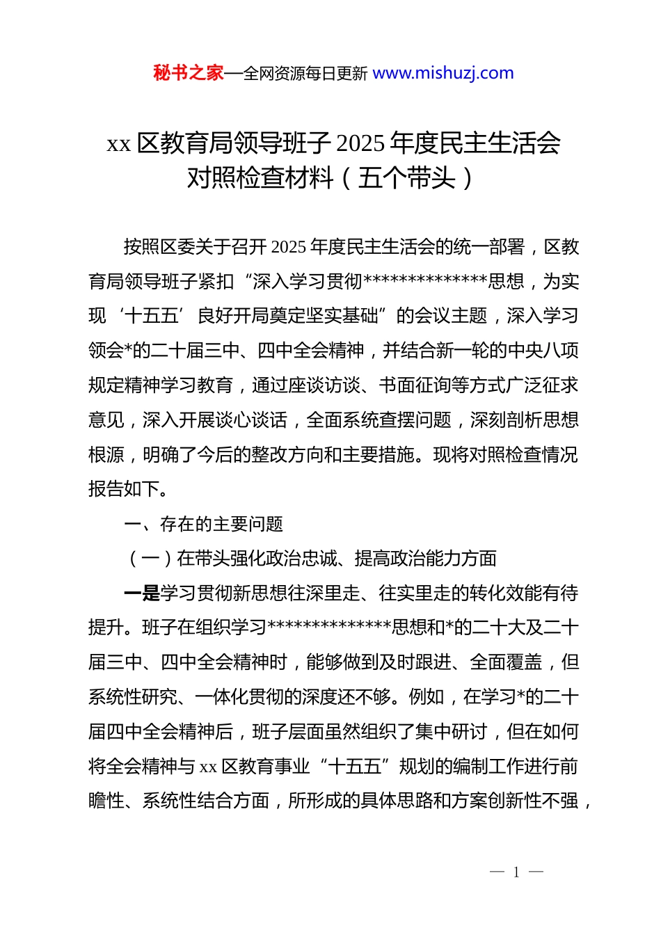 秘书之家—全网资源每日更新 www.mishuzj.comxx 区教育局领导班子 2025 年度民主生活会对照检查材料(五个带头)按照区委关于召开 2025 年度民主生活会的统一部署,区教育局领导班子紧扣“深入学习贯彻**************思想,为实现‘十五五’良好开局奠定坚实基础”的会议主题,深入学习领会*的二十届三中、四中全会精神,并结合新一轮的中央八项规定精神学习教育,通过座谈访谈、书面征询等方式广泛征求意见,深入开展谈心谈话,全面系统查摆问题,深刻剖析思想根源,明确了今后的整改方向和主要措施。现将对照检查情况报告如下。一、存在的主要问题(一)在带头强化政治忠诚、提高政治能力方面一是学习贯彻新思想往深里走、往实里走的转化效能有待提升。班子在组织学习**************思想和*的二十大及二十届三中、四中全会精神时,能够做到及时跟进、全面覆盖,但系统性研究、一体化贯彻的深度还不够。例如,在学习*的二十届四中全会精神后,班子层面虽然组织了集中研讨,但在如何将全会精神与 xx 区教育事业“十五五”规划的编制工作进行前瞻性、系统性结合方面,所形成的具体思路和方案创新性不强,— 1 —秘书之家—全网资源每日更新 www.mishuzj.com存在一定程度的就理论学理论现象,导致理论学习成果向推动教育高质量发展的实际政策和具体项目转化的效能未能最大化。二是应对复杂局面、防范化解风险的政治敏锐性和判断力需进一步增强。面对教育改革发展进入深水区,班子对一些潜在的风险和苗头性问题,有时存在研判不够及时、应对不够果断的情况。比如,在 2025 年推进部分学校招生片区优化调整工作中,虽然方案本身符合政策导向和教育公平原则,但对调整可能引发的社会舆论和家长情绪的复杂性预判不足,初期更多地是从政策技术层面进行解读,未能第一时间从维护社会稳定和争取群众理解的政治高度去主动引导、有效沟通,导致在工作推进过程中遇到了一些不必要的阻力。三是推动中央决策部署与区域教育实际创造性结合的力度仍有不足。班子在执行上级决策部署时,政治站位是坚定的,行动是迅速的,但有时存在机械执行、上下一般粗的现象,结合 xx 区区情、校情进行差异化、特色化落实的探索不够。例如,在推进教育数字化转型战略过程中,一度存在将上级文件和要求直接转发至各学校的情况,对于城区和乡镇学校之间在信息化基础设施、教师数字素养等方面存在的显著差异,未能及时出台更具针对性的分类指导意见和配套支持措施,影响了数字化战略在基层的均衡、有效落地。— 2 —秘书之家—全网资源每日更新 www.mishuzj.com(二)在带头固本培元、增强*性方面一是运用*的创新理论改造主观世界的内化程度尚有差距。班子成员能够自觉加强理论学习,但在将学习成果内化为坚定的*性修养、解决好世界观人生观价值观“总开关”问题上,下的功夫还不够深。在日常工作中,有时谈具体业务工作多,联系思想实际、深入进行*性分析少。比如,在组织 dj 学习教育和警示教育时,虽然剖析了典型案例,但班子成员在对照反思时,较少触及自身在价值观、权力观上存在的细微偏差,未能完全做到见人见事见思想,导致*性锤炼的“熔炉”温度略显不足。二是砥砺斗争精神、勇于攻坚克难的锐气有所弱化。面对教育领域长期积累的一些历史遗留问题和改革中难啃的“硬骨头”,班子有时存在求稳怕乱的思想,敢于斗争、善于斗争的劲头和魄力未能始终如一。例如,在集团化办学改革中,虽然组建了多个教育集团,但在推动集团内教师编制打通、绩效一体化、课程体系深度融合等核心环节上,因涉及复杂的利益调整和传统壁垒,班子在感到巨大阻力时,一度采取了较为缓和的渐进策略,未能以更大的决心和魄力一鼓作气推动改革向纵深发展,导致部分集团的“形合”大于“神合”。三是坚守理想信念与履行岗位职责的融合度不够紧密。班— 3 —秘书之家—全网资源每日更新 www.mishuzj.com子注重通过红色教育资源加强理想信念教育,但如何将崇高的理想信念与具体的教育教学管理工作、师德师风建设自然融合,方法和载体还有待创新。有时 dj 活动与业务工作存在“两张皮”现象,比如,组织教师到红色教...