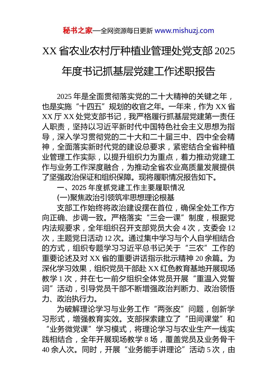 秘书之家—全网资源每日更新 www.mishuzj.comXX 省农业农村厅种植业管理处党支部 2025年度书记抓基层党建工作述职报告2025 年是全面贯彻落实党的二十大精神的关键之年,也是实施“十四五”规划的收官之年。一年来,作为 XX 省XX 厅 XX 处党支部书记,我严格履行抓基层党建第一责任人职责,坚持以习近平新时代中国特色社会主义思想为指导,深入学习贯彻党的二十大和二十届三中、四中全会精神,全面落实新时代党的建设总要求,紧密结合全省种植业管理工作实际,以提升组织力为重点,着力推动党建工作与业务工作深度融合,为推动全省农业高质量发展提供了坚强政治保证和组织保障。现将履职情况报告如下。一、2025 年度抓党建工作主要履职情况(一)聚焦政治引领筑牢思想理论根基支部工作始终将政治建设摆在首位,确保全处工作方向正确、步调一致。严格落实“三会一课”制度,根据党内法规要求,全年组织召开支部党员大会 4 次,支委会 12次,主题党日活动 12 次。通过集中学习与个人自学相结合的方式,组织专题学习习近平总书记关于“三农”工作的重要论述及对 XX 省的重要讲话指示批示精神 20 余篇。为深化学习效果,组织党员干部赴 XX 红色教育基地开展现场教学 1 次,并在七一前夕组织全体党员开展“重温入党誓词”活动,引导党员干部不断增强政治判断力、政治领悟力、政治执行力。为破解理论学习与业务工作“两张皮”问题,创新学习形式,增强教育实效。支部探索建立了“田间课堂”和“业务微党课”学习模式,将理论学习与农业生产一线实践相结合,全年开展现场教学 8 场,覆盖党员及业务骨干40 余人次。同时,开展“业务能手讲理论”活动 5 次,由秘书之家—全网资源每日更新 www.mishuzj.com业务骨干结合具体工作解读党的创新理论,组织政治理论与业务知识综合测试 2 次,党员干部参考率与合格率均达到100%,优秀率达 90%。这些举措确保了党的创新理论入脑入心,为全省种植业发展把准了政治方向。(二)夯实组织基础建强坚实战斗堡垒支部建设是党建工作的基石。为优化组织体系,圆满完成了支部换届选举工作,新一届支委会成员中,业务骨干占比达到 75%,平均年龄 42 岁,本科以上学历占比100%,班子结构更加优化,战斗力显著增强。在党员管理方面,严格遵循发展程序,注重从业务一线和青年骨干中发展党员,年内重点发展业务骨干 1 名成为预备党员,培养入党积极分子 2 名。为激励党员发挥先锋模范作用,建立了党员责任区 3 个、设立党员示范岗 5 个,实现了关键业务岗位党员全覆盖。为提升组织活力,支部高标准建设党员活动室 1 个,购置学习书籍 200 余册,不断完善硬件设施,为组织生活提供了坚实保障。在规范开展组织生活的基础上,支部获评厅级“五星级党支部”荣誉称号,2 名党员同志获评年度“业务标兵”称号。通过持续夯实组织基础,支部的凝聚力和战斗力得到全面提升。(三)深化党建融合赋能农业高质量发展推动党建与业务深度融合是提升工作质效的关键。支部创新建立了“党建+业务”双融机制,将党建工作要求有机嵌入粮食生产、经济作物发展、防灾减灾等核心业务流程,制定了年度融合任务清单 15 项。组织开展“技术攻关党旗红”活动,成立由党员骨干牵头的技术攻关小组 3 个,围绕小麦赤霉病防治、大豆玉米带状复合种植等关键技术难题进行攻关,成功解决了生产技术难题 8 项,预计为全省粮食生产挽回经济损失、创造经济效益超 5000 万元。为汇聚集体智慧,支部开展了“金点子”征集活动,围绕提升粮食产能、优化种植结构等主题,全年收集意见秘书之家—全网资源每日更新 www.mishuzj.com建议 30 余条,经支委会研究讨论,采纳实施 12 条,为科学决策提供了有力支持。同时,实施“党员带徒”计划,安排 10 名经验丰富的党员与青年干部结成对子,帮助青年干部快速成长,年内成功培养业务骨干 5 名。通过党建引领,有效推动了全省种植业管理水平和服务效能的提升。(四)严抓作风纪律营造清正干事环境作风建设永远在路上。支部深入学习教育,组织全体党员专题学习新修订的《中国共产党纪律处分条例》,并结合...