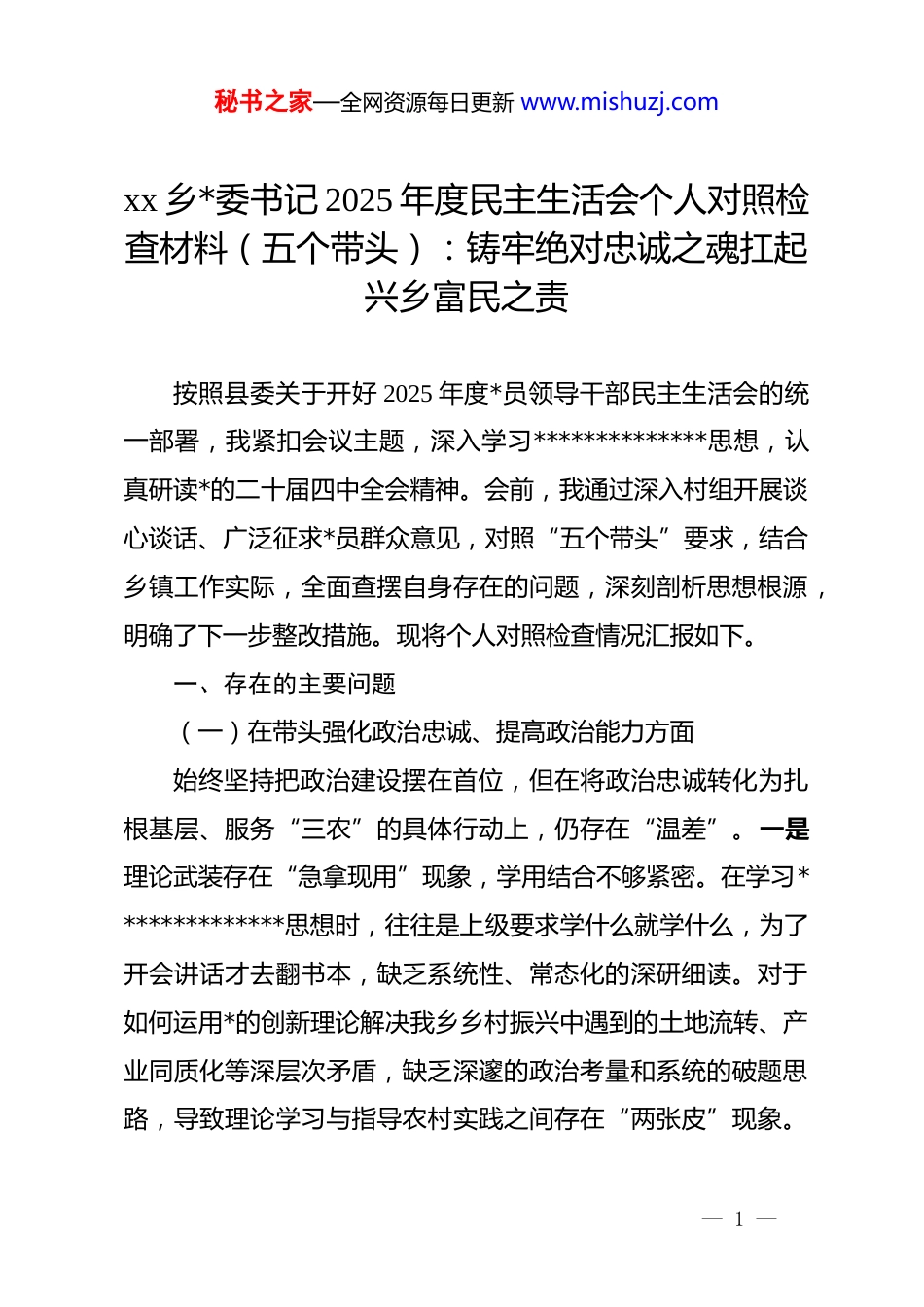 秘书之家—全网资源每日更新 www.mishuzj.comxx 乡*委书记 2025 年度民主生活会个人对照检查材料(五个带头):铸牢绝对忠诚之魂扛起兴乡富民之责按照县委关于开好 2025 年度*员领导干部民主生活会的统一部署,我紧扣会议主题,深入学习**************思想,认真研读*的二十届四中全会精神。会前,我通过深入村组开展谈心谈话、广泛征求*员群众意见,对照“五个带头”要求,结合乡镇工作实际,全面查摆自身存在的问题,深刻剖析思想根源,明确了下一步整改措施。现将个人对照检查情况汇报如下。一、存在的主要问题(一)在带头强化政治忠诚、提高政治能力方面始终坚持把政治建设摆在首位,但在将政治忠诚转化为扎根基层、服务“三农”的具体行动上,仍存在“温差”。一是理论武装存在“急拿现用”现象,学用结合不够紧密。在学习**************思想时,往往是上级要求学什么就学什么,为了开会讲话才去翻书本,缺乏系统性、常态化的深研细读。对于如何运用*的创新理论解决我乡乡村振兴中遇到的土地流转、产业同质化等深层次矛盾,缺乏深邃的政治考量和系统的破题思路,导致理论学习与指导农村实践之间存在“两张皮”现象。— 1 —秘书之家—全网资源每日更新 www.mishuzj.com二是政治执行力不够精准,政策落地存在“衰减”效应。在贯彻落实上级关于农业农村工作的决策部署时,有时存在“机械执行”倾向,缺乏结合本乡实际的创新性转化。例如在推进和美乡村建设中,有时未能充分考虑各村资源禀赋差异,存在“一刀切”布置任务的情况,导致部分惠民政策在“最后一公里”落地时效果打了折扣,政治站位与基层实效之间存在一定“落差”。三是政治敏锐性尚需打磨,对苗头性问题预判不足。面对农村日益复杂的社会治理形势,从政治高度审视信访维稳、网络舆情等风险挑战的意识还不强。有时把一些村民之间的利益诉求单纯看作是“民事纠纷”,未能及时上升到政治安全和社会稳定的高度去认识,导致个别矛盾未能化解在萌芽状态,处置应对较为被动。(二)在带头固本培元、增强*性方面能够坚守共产*人的精神家园,但在繁杂的乡镇事务中,对照*性修养的高标准,内心深处的“大熔炉”火候有时不够旺。一是理想信念的“压舱石”偶有松动。长期身处基层一线,面对千头万绪的琐碎工作和急难险重的任务压力,潜意识里产生过“歇一歇、喘口气”的念头。在遇到拆迁难、资金缺等具体困难时,偶尔会流露出畏难情绪,缺乏革命前辈那种“越是艰险越向前”的钢铁意志,对照先辈先烈,精神之“钙”补得还— 2 —秘书之家—全网资源每日更新 www.mishuzj.com不够足,干事创业的激情有所减退。二是*内政治生活的“炉火”不够旺。虽然能够以普通*员身份参加支部生活,但有时存在“走过场”、“完成任务”的心态,把自己当作“点评者”多,当作“参与者”少。在开展自我批评时,触及灵魂不够深,往往用工作问题代替思想问题,找客观原因多、找主观原因少,未能时刻像“过电影”一样反思自己的言行,*性修养的提升缺乏持续的内生动力。三是艰苦奋斗的本色擦得不够亮。随着经济社会发展和办公条件改善,过“紧日子”的思想弦绷得不够紧。虽然在公务活动中不违规,但在日常节约一度电、一张纸等小事上做得不够到位。在谋划乡村建设项目时,有时过于追求“面子”好看,对“里子”实惠考虑不够,未能完全做到将有限的资金用在刀刃上,距离“勤俭办一切事业”的要求还有差距。(三)在带头敬畏人民、敬畏组织、敬畏法纪方面能够严守底线,但在践行以人民为中心的发展思想和法治思维运用上,还存在“短板”和“盲区”。一是宗旨意识在具体践行中存在“浮在面上”的问题。虽然常讲“为了谁、依靠谁”,但在实际工作中,有时习惯于坐在办公室听汇报、看报表,真正走进田间地头、坐上群众炕头的时间少了。调查研究有时存在“隔窗看景”倾向,对留守老人、困难群众的急难愁— 3 —秘书之家—全网资源每日更新 www.mishuzj.com盼感知不够敏锐,解决群众诉求有时停留在“按程序办”层面,缺乏“马上就办、办就办好”的温度,与群众期待的“零距离”服务还有差距。二是整治“指尖上的形式主义”不够彻底。虽然主观...