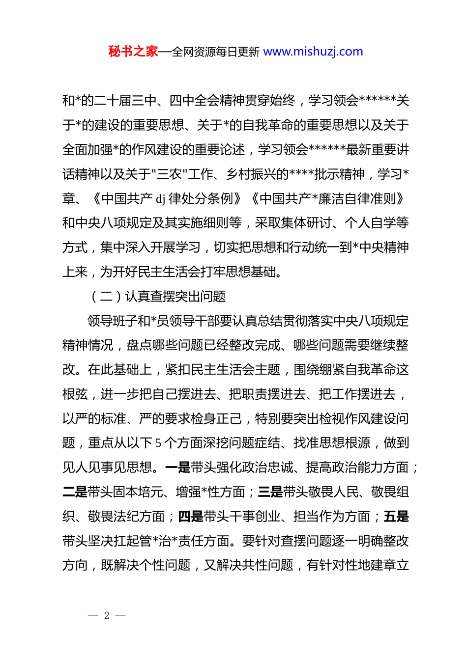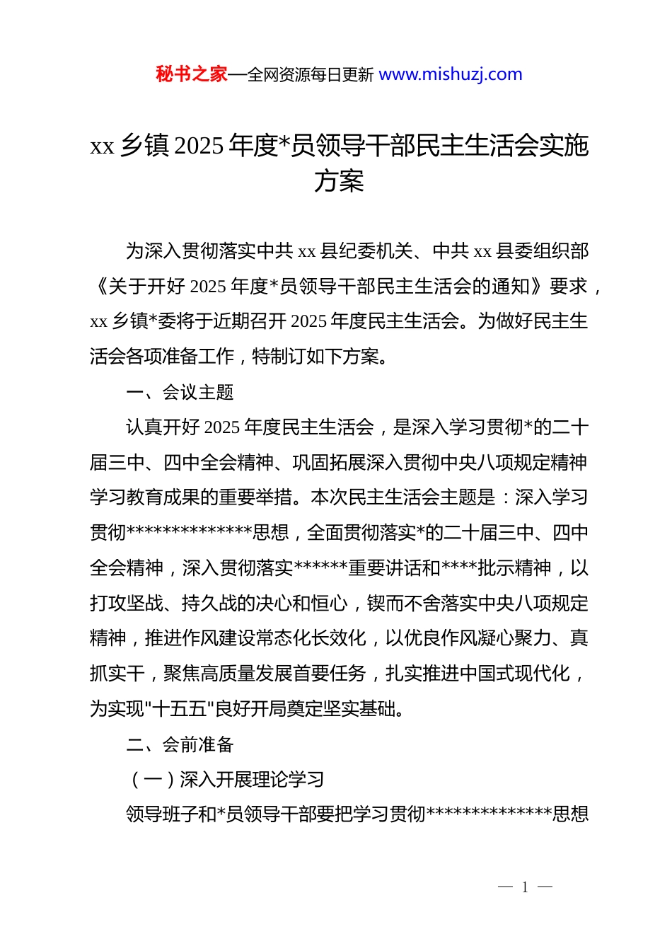 秘书之家—全网资源每日更新 www.mishuzj.comxx 乡镇 2025 年度*员领导干部民主生活会实施方案为深入贯彻落实中共 xx 县纪委机关、中共 xx 县委组织部《关于开好 2025 年度*员领导干部民主生活会的通知》要求,xx 乡镇*委将于近期召开 2025 年度民主生活会。为做好民主生活会各项准备工作,特制订如下方案。一、会议主题认真开好 2025 年度民主生活会,是深入学习贯彻*的二十届三中、四中全会精神、巩固拓展深入贯彻中央八项规定精神学习教育成果的重要举措。本次民主生活会主题是:深入学习贯彻**************思想,全面贯彻落实*的二十届三中、四中全会精神,深入贯彻落实******重要讲话和****批示精神,以打攻坚战、持久战的决心和恒心,锲而不舍落实中央八项规定精神,推进作风建设常态化长效化,以优良作风凝心聚力、真抓实干,聚焦高质量发展首要任务,扎实推进中国式现代化,为实现"十五五"良好开局奠定坚实基础。二、会前准备(一)深入开展理论学习领导班子和*员领导干部要把学习贯彻**************思想— 1 —秘书之家—全网资源每日更新 www.mishuzj.com和*的二十届三中、四中全会精神贯穿始终,学习领会******关于*的建设的重要思想、关于*的自我革命的重要思想以及关于全面加强*的作风建设的重要论述,学习领会******最新重要讲话精神以及关于"三农"工作、乡村振兴的****批示精神,学习*章、《中国共产 dj 律处分条例》《中国共产*廉洁自律准则》和中央八项规定及其实施细则等,采取集体研讨、个人自学等方式,集中深入开展学习,切实把思想和行动统一到*中央精神上来,为开好民主生活会打牢思想基础。(二)认真查摆突出问题领导班子和*员领导干部要认真总结贯彻落实中央八项规定精神情况,盘点哪些问题已经整改完成、哪些问题需要继续整改。在此基础上,紧扣民主生活会主题,围绕绷紧自我革命这根弦,进一步把自己摆进去、把职责摆进去、把工作摆进去,以严的标准、严的要求检身正己,特别要突出检视作风建设问题,重点从以下 5 个方面深挖问题症结、找准思想根源,做到见人见事见思想。一是带头强化政治忠诚、提高政治能力方面;二是带头固本培元、增强*性方面;三是带头敬畏人民、敬畏组织、敬畏法纪方面;四是带头干事创业、担当作为方面;五是带头坚决扛起管*治*责任方面。要针对查摆问题逐一明确整改方向,既解决个性问题,又解决共性问题,有针对性地建章立— 2 —秘书之家—全网资源每日更新 www.mishuzj.com制,坚决防止类似问题再次发生。(三)广泛征求意见建议,深入开展谈心谈话乡镇领导班子要坚持发扬民主、开门纳谏,采取发放征求意见表、座谈交流等方式,围绕民主生活会主题、要求重点查摆的问题等,广泛征求*员、干部和基层群众意见建议;同时,主要负责同志与班子成员之间、班子成员相互之间要进行谈心谈话,谈心谈话要一对一、面对面,既谈收获体会又谈差距不足,既谈自身缺点又谈对方问题,达到加深共识、增进团结目的。(四)认真撰写对照检查材料和个人发言提纲在前期认真组织学习、谈心谈话的基础上,主要负责同志要主持研究起草领导班子对照检查材料,带头动手撰写个人对照检查材料和个人发言材料,并审阅把关班子成员个人发言提纲。要逐项对照 5 个方面、逐条查找、逐项梳理,找准查实存在的突出问题,深入进行*性分析,深刻挖掘问题根源,有针对性地制定整改措施。要直奔主题,不搞官样文章,不硬性纠结于字数。(五)认真开展批评与自我批评班子成员要发扬自我革命精神,严肃认真开展批评与自我批评,打扫政治灰尘,净化政治灵魂,达到坚持真理、修正错— 3 —秘书之家—全网资源每日更新 www.mishuzj.com误、增进团结的目的。(六)做好情况通报及报告民主生活会上,主要负责同志要对上年度查摆问题和整改落实情况进行通报,对群众反映、巡视巡察反馈、组织约谈函询、个人需报告的重大事项和有关问题逐项作出说明,受到谈话函询且存在违纪问题的要作出检讨,受到问责的要作出深刻检查。如无以上情形的,要作出零报告。(七)认真抓好整改落实会后,要针对会前征求的意见建议等,制定问题清单,完善整改措...