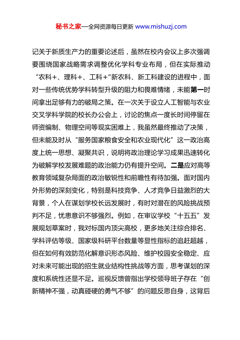 秘书之家—全网资源每日更新 www.mishuzj.com大学 2025 年度民主生活会个人检查材料(五个带头) 根据学校党委关于召开 2025 年度民主生活会的统一安排和部署,我在深入学习习近平新时代中国特色社会主义思想,全面贯彻党的二十届三中、四中全会精神,特别是认真学习领会关于深入贯彻落实中央八项规定精神、推进作风建设常态化长效化的重要论述基础上,广泛征求了班子成员、分管部门和基层师生的意见建议,并与班子成员逐一开展了谈心谈话。在此基础上,我紧扣本次民主生活会主题,对照“带头强化政治忠诚、提高政治能力”“带头固本培元、增强党性”“带头敬畏人民、敬畏组织、敬畏法纪”“带头干事创业、担当作为”“带头坚决扛起管党治党责任”等五个方面,深入查摆自身存在的问题与不足,深刻剖析问题产生的根源,并明确了今后的努力方向和整改措施。现将个人对照检查情况报告如下。一、存在的主要问题(一)在带头强化政治忠忠、提高政治能力方面。一是政治理论学习与学校治理实践的融合转化不够深入。虽然能够坚持参加党委理论学习中心组的各项学习活动但有时在学习的“后半篇文章”上做得还不够到位。比如,在学习习近平总书秘书之家—全网资源每日更新 www.mishuzj.com记关于新质生产力的重要论述后,虽然在校内会议上多次强调要围绕国家战略需求调整优化学科专业布局,但在实际推动“农科+、理科+、工科+”新农科、新工科建设的进程中,面对一些传统优势学科转型升级的阻力和畏难情绪,未能第一时间拿出足够有力的破局之策。在一次关于设立人工智能与农业交叉学科学院的校长办公会上,讨论的焦点一度长时间停留在师资编制、物理空间等现实困难上,我虽然最终推动了决策,但未能及时从“服务国家粮食安全和农业现代化”这一政治高度上统一思想、凝聚共识,说明将政治理论学习成果迅速转化为破解学校发展难题的政治能力仍有提升空间。二是应对高等教育领域复杂局面的政治敏锐性和前瞻性有待加强。面对国内外形势的深刻变化,特别是科技竞争、人才竞争日益激烈的大背景,个人在谋划学校长远发展时,有时对潜在的风险挑战预判不足,忧患意识不够强烈。例如,在审议学校“十五五”发展规划草案时,我对标国内顶尖高校,更多地关注综合排名、学科评估等级、国家级科研平台数量等显性指标的追赶超越,但在如何有效防范化解意识形态风险、维护校园安全稳定、应对未来可能出现的招生就业结构性挑战等方面,思考谋划的深度和系统性还显不足。巡视反馈曾指出学校领导班子存在“创新精神不强,动真碰硬的勇气不够”的问题反思自身,这背后秘书之家—全网资源每日更新 www.mishuzj.com也反映出我在驾驭全局、统筹发展与安全两大任务时的政治能力尚有短板。三是执行党中央决策部署的政治自觉和行动自觉有时存在温差。对党中央的决策部署,我始终在思想上、政治上、行动上保持高度一致,但有时在具体执行环节,存在着“等上级文件、看兄弟院校”的惯性思维,主动作为、创造性落实的劲头不足。比如,在推进“部省合建”工作和“双一流”建设中对于一些需要打破常规、先行先试的改革举措,我有时会因为担心政策不明确、条件不成熟而选择较为稳妥的路径,未能以“时不我待”的紧迫感和“舍我其谁”的担当精神,最大限度地争取政策支持、整合内外资源,导致学校在某些关键领域的改革步伐不够快、成效不够显著,这实质上是在贯彻落实上级决策部署时,政治执行力还没有达到最优状态。(二)在带头固本培元、增强党性方面。一是理论学习的系统性和钻研精神有所弱化。作为学校的行政主要负责人,日常事务性工作千头万绪,导致个人静下心来读原著、学原文、悟原理的时间被挤占,存在“碎片化”学习现象。在参加党委组织的党纪学习教育活动中虽然能够认真完成领学、重点发言等任务,但在个人自学环节,有时对一些理论文章和党内法规的学习满足于“知其然”,对其背后的历史逻辑、理论逻辑和实践逻辑“知其所以然”的深度钻研不够。这种学习上的欠缺,秘书之家—全网资源每日更新 www.mishuzj.com导致在面对一些深层次的矛盾和问题时,运用马克思主义立场、观点、方法分析问题、解决问题的...