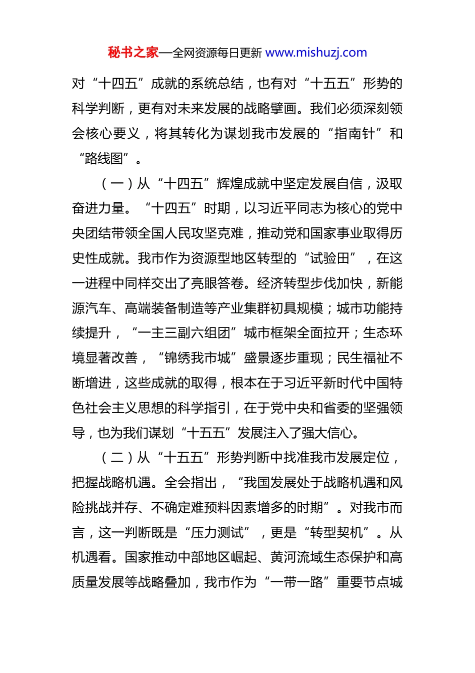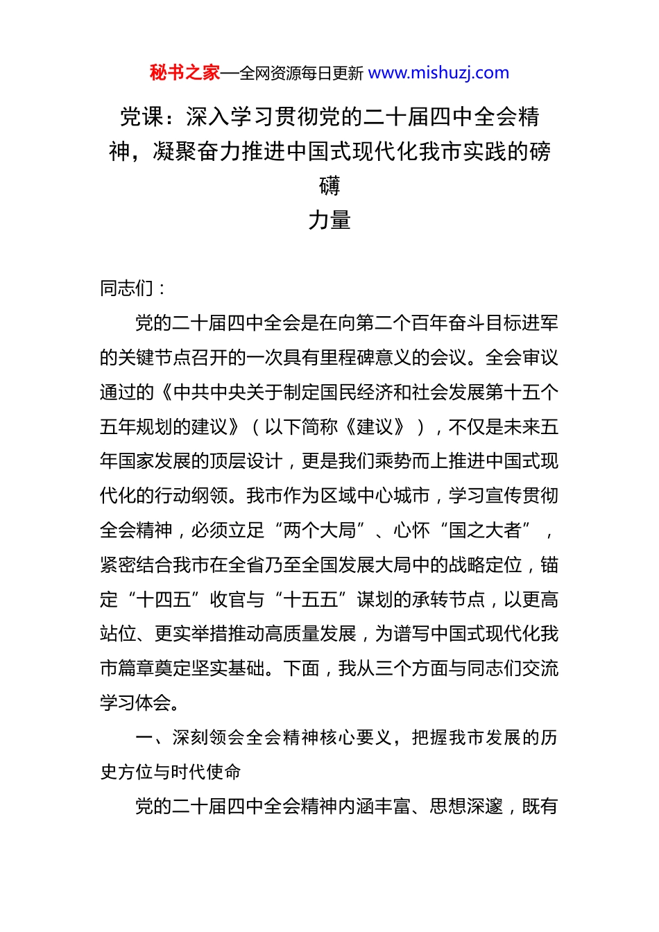 秘书之家—全网资源每日更新 www.mishuzj.com党课:深入学习贯彻党的二十届四中全会精神,凝聚奋力推进中国式现代化我市实践的磅礴力量 同志们:党的二十届四中全会是在向第二个百年奋斗目标进军的关键节点召开的一次具有里程碑意义的会议。全会审议通过的《中共中央关于制定国民经济和社会发展第十五个五年规划的建议》(以下简称《建议》),不仅是未来五年国家发展的顶层设计,更是我们乘势而上推进中国式现代化的行动纲领。我市作为区域中心城市,学习宣传贯彻全会精神,必须立足“两个大局”、心怀“国之大者”,紧密结合我市在全省乃至全国发展大局中的战略定位,锚定“十四五”收官与“十五五”谋划的承转节点,以更高站位、更实举措推动高质量发展,为谱写中国式现代化我市篇章奠定坚实基础。下面,我从三个方面与同志们交流学习体会。一、深刻领会全会精神核心要义,把握我市发展的历史方位与时代使命党的二十届四中全会精神内涵丰富、思想深邃,既有秘书之家—全网资源每日更新 www.mishuzj.com对“十四五”成就的系统总结,也有对“十五五”形势的科学判断,更有对未来发展的战略擘画。我们必须深刻领会核心要义,将其转化为谋划我市发展的“指南针”和“路线图”。(一)从“十四五”辉煌成就中坚定发展自信,汲取奋进力量。“十四五”时期,以习近平同志为核心的党中央团结带领全国人民攻坚克难,推动党和国家事业取得历史性成就。我市作为资源型地区转型的“试验田”,在这一进程中同样交出了亮眼答卷。经济转型步伐加快,新能源汽车、高端装备制造等产业集群初具规模;城市功能持续提升,“一主三副六组团”城市框架全面拉开;生态环境显著改善,“锦绣我市城”盛景逐步重现;民生福祉不断增进,这些成就的取得,根本在于习近平新时代中国特色社会主义思想的科学指引,在于党中央和省委的坚强领导,也为我们谋划“十五五”发展注入了强大信心。(二)从“十五五”形势判断中找准我市发展定位,把握战略机遇。全会指出,“我国发展处于战略机遇和风险挑战并存、不确定难预料因素增多的时期”。对我市而言,这一判断既是“压力测试”,更是“转型契机”。从机遇看。国家推动中部地区崛起、黄河流域生态保护和高质量发展等战略叠加,我市作为“一带一路”重要节点城秘书之家—全网资源每日更新 www.mishuzj.com市和京津冀协同发展“后花园”,战略地位更加凸显;全省“一群两区三圈”城乡区域发展新布局深入推进,我市“一主”辐射作用亟待强化;新能源、新材料、大数据等产业赛道加速重构,为我市培育新质生产力提供了广阔空间。从挑战看。资源型经济转型任务仍未完成,传统产业占比偏高,新兴产业支撑不足;城市能级与省会地位不相匹配,科技创新能力、高端人才储备、营商环境等仍有短板;生态环境保护压力较大,汾河流域治理、大气污染防治等需持续深化。面对“危”与“机”,我们必须保持战略定力,以“转型蹚新路”的闯劲,在服务国家大局中展现我市担当。(三)从“十五五”战略部署中明确我市发展方向,锚定目标任务。《建议》明确了“六个坚持”原则和七方面主要目标,为我们制定了“任务书”。结合我市实际,我们要聚焦“四个关键词”。一是“高质量”,把发展新质生产力作为首要任务,推动产业体系向“高端化、智能化、绿色化”转型;二是“现代化”,以建设国家区域中心城市为目标,提升城市功能品质和治理效能;三是“可持续”,统筹生态保护与经济发展,打造人与自然和谐共生的美丽我市;四是“共富裕”,聚焦“一老一小”、就业增收等民生痛点,让发展成果更多更公平惠及全体市秘书之家—全网资源每日更新 www.mishuzj.com民。具体到目标设定,我们初步考虑。到 2027 年,地区生产总值突破万亿大关,战略性新兴产业增加值占比达到30%以上,常住人口城镇化率超过 85%,空气质量优良天数比例稳定在 75%以上,居民人均可支配收入增速高于经济增速,努力实现在资源型经济转型上走在全国前列、在黄河流域生态保护上走在中游前列、在中部地区省会城市竞争中走在前列、在市域社会治理现代化上走在全省前列。二、锚定“十五五”目标任务,谱写我市高质...