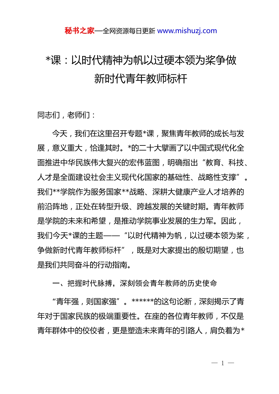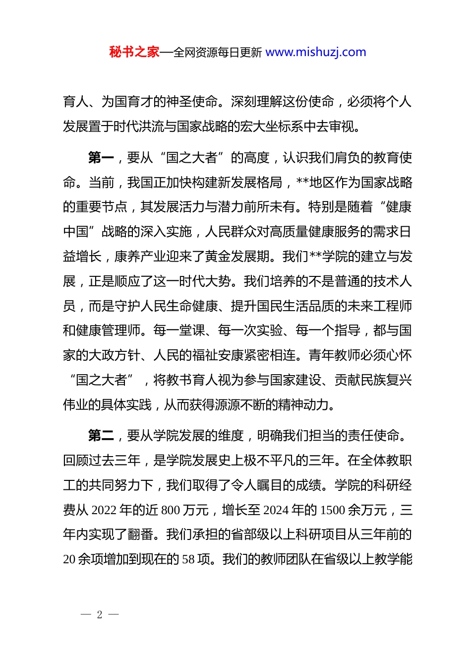 秘书之家—全网资源每日更新 www.mishuzj.com*课:以时代精神为帆以过硬本领为桨争做新时代青年教师标杆同志们,老师们:今天,我们在这里召开专题*课,聚焦青年教师的成长与发展,意义重大,恰逢其时。*的二十大擘画了以中国式现代化全面推进中华民族伟大复兴的宏伟蓝图,明确指出“教育、科技、人才是全面建设社会主义现代化国家的基础性、战略性支撑”。我们**学院作为服务国家**战略、深耕大健康产业人才培养的前沿阵地,正处在转型升级、跨越发展的关键时期。青年教师是学院的未来和希望,是推动学院事业发展的生力军。因此,我们今天*课的主题——“以时代精神为帆,以过硬本领为桨,争做新时代青年教师标杆”,既是对大家提出的殷切期望,也是我们共同奋斗的行动指南。一、把握时代脉搏,深刻领会青年教师的历史使命“青年强,则国家强”。******的这句论断,深刻揭示了青年对于国家民族的极端重要性。在座的各位青年教师,不仅是青年群体中的佼佼者,更是塑造未来青年的引路人,肩负着为*— 1 —秘书之家—全网资源每日更新 www.mishuzj.com育人、为国育才的神圣使命。深刻理解这份使命,必须将个人发展置于时代洪流与国家战略的宏大坐标系中去审视。第一,要从“国之大者”的高度,认识我们肩负的教育使命。当前,我国正加快构建新发展格局,**地区作为国家战略的重要节点,其发展活力与潜力前所未有。特别是随着“健康中国”战略的深入实施,人民群众对高质量健康服务的需求日益增长,康养产业迎来了黄金发展期。我们**学院的建立与发展,正是顺应了这一时代大势。我们培养的不是普通的技术人员,而是守护人民生命健康、提升国民生活品质的未来工程师和健康管理师。每一堂课、每一次实验、每一个指导,都与国家的大政方针、人民的福祉安康紧密相连。青年教师必须心怀“国之大者”,将教书育人视为参与国家建设、贡献民族复兴伟业的具体实践,从而获得源源不断的精神动力。第二,要从学院发展的维度,明确我们担当的责任使命。回顾过去三年,是学院发展史上极不平凡的三年。在全体教职工的共同努力下,我们取得了令人瞩目的成绩。学院的科研经费从 2022 年的近 800 万元,增长至 2024 年的 1500 余万元,三年内实现了翻番。我们承担的省部级以上科研项目从三年前的20 余项增加到现在的 58 项。我们的教师团队在省级以上教学能— 2 —秘书之家—全网资源每日更新 www.mishuzj.com力大赛中斩获一等奖 3 项、二等奖 8 项,发表高水平学术论文200 余篇,授权专利超过 50 项。我们的学生在各类国家级、省级技能大赛和创新创业竞赛中,累计获得奖项超过 150 项,其中国家级奖项达到 35 项,考研升学率连续三年攀升,2025 届毕业生中已有近 15%的同学成功“上岸”。这些数据背后,凝结着每一位教师的心血与汗水,也清晰地标示出学院发展的强劲势头。然而,我们也要清醒地看到,与国内顶尖的同类院校相比,我们在高层次领军人才储备、国家级重大科研项目攻关、产教融合深度等方面依然存在差距。弥补这些短板,实现从“量的积累”到“质的飞跃”,关键就在于我们能否打造一支政治素质过硬、业务能力精湛、育人水平高超的教师队伍,而青年教师正是这支队伍中最具活力、最有潜力的组成部分。学院的未来发展,需要你们勇挑重担,在教学、科研、社会服务等各个战场上冲锋陷阵。第三,要从个人成长的角度,坚定我们奋斗的理想信念。教师是太阳底下最光辉的职业,选择成为一名教师,就是选择了一份沉甸甸的责任。******对广大青年寄予厚望,希望大家“怀抱梦想又脚踏实地,敢想敢为又善作善成,立志做有理想、敢担当、能吃苦、肯奋斗的新时代好青年”。对于青年教师而— 3 —秘书之家—全网资源每日更新 www.mishuzj.com言,这份担当和奋斗,具体体现在对教育事业的无限忠诚和对专业领域的不懈探索。我们学院的青年教师,要坚定不移听*话、跟*走,自觉向*组织靠拢,将个人的职业规划与学院的发展蓝图、国家的战略需求紧密结合起来。要把实现个人价值的过程,融入到培养堪当民族复兴大任的时代新人的伟大事业中去。当你看到自己教导的学生成为行业的栋...