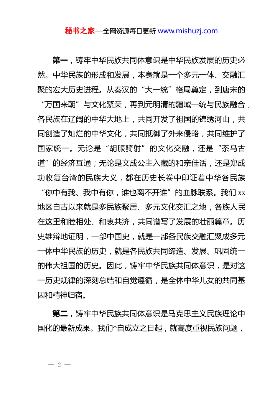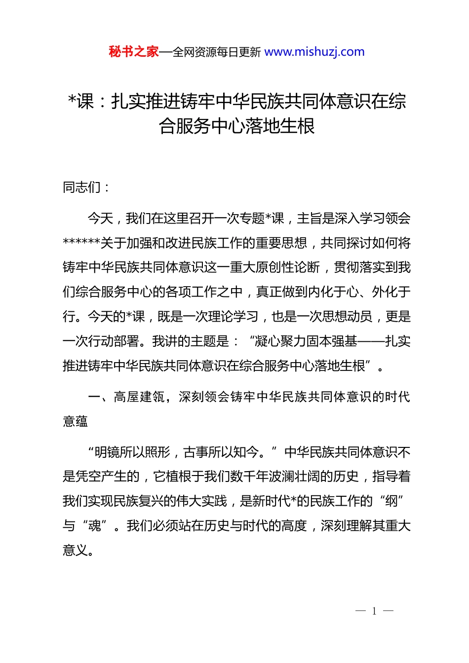秘书之家—全网资源每日更新 www.mishuzj.com*课:扎实推进铸牢中华民族共同体意识在综合服务中心落地生根同志们:今天,我们在这里召开一次专题*课,主旨是深入学习领会******关于加强和改进民族工作的重要思想,共同探讨如何将铸牢中华民族共同体意识这一重大原创性论断,贯彻落实到我们综合服务中心的各项工作之中,真正做到内化于心、外化于行。今天的*课,既是一次理论学习,也是一次思想动员,更是一次行动部署。我讲的主题是:“凝心聚力固本强基——扎实推进铸牢中华民族共同体意识在综合服务中心落地生根”。一、高屋建瓴,深刻领会铸牢中华民族共同体意识的时代意蕴“明镜所以照形,古事所以知今。”中华民族共同体意识不是凭空产生的,它植根于我们数千年波澜壮阔的历史,指导着我们实现民族复兴的伟大实践,是新时代*的民族工作的“纲”与“魂”。我们必须站在历史与时代的高度,深刻理解其重大意义。— 1 —秘书之家—全网资源每日更新 www.mishuzj.com第一,铸牢中华民族共同体意识是中华民族发展的历史必然。中华民族的形成和发展,本身就是一个多元一体、交融汇聚的宏大历史进程。从秦汉的“大一统”格局奠定,到唐宋的“万国来朝”与文化繁荣,再到元明清的疆域一统与民族融合,各民族在辽阔的中华大地上,共同开发了祖国的锦绣河山,共同创造了灿烂的中华文化,共同抵御了外来侵略,共同维护了国家统一。无论是“胡服骑射”的文化交融,还是“茶马古道”的经济互通;无论是文成公主入藏的和亲佳话,还是郑成功收复台湾的民族大义,都在历史长卷中印证着中华各民族“你中有我、我中有你,谁也离不开谁”的血脉联系。我们 xx地区自古以来就是多民族聚居、多元文化交汇之地,各族人民在这里和睦相处、和衷共济,共同谱写了发展的壮丽篇章。历史雄辩地证明,一部中国史,就是一部各民族交融汇聚成多元一体中华民族的历史,就是各民族共同缔造、发展、巩固统一的伟大祖国的历史。因此,铸牢中华民族共同体意识,是对这一历史规律的深刻总结和自觉遵循,是全体中华儿女的共同基因和精神归宿。第二,铸牢中华民族共同体意识是马克思主义民族理论中国化的最新成果。我们*自成立之日起,就高度重视民族问题,— 2 —秘书之家—全网资源每日更新 www.mishuzj.com始终把马克思主义民族理论与中国具体实际相结合,走出了一条中国特色解决民族问题的正确道路。从新中国成立初期的民族平等、团结、互助政策,到改革开放时期的“三个离不开”思想,再到新世纪的“两个共同”主题,*的民族理论在实践中不断丰富和发展。进入新时代,以***同志为核心的*中央,着眼于实现中华民族伟大复兴的战略全局,创造性地提出了“铸牢中华民族共同体意识”这一重大论断。这一论断,深刻回答了新时代民族工作“举什么旗、走什么路”等一系列根本性问题,其核心要义在于引导各族人民牢固树立休戚与共、荣辱与共、生死与共、命运与共的“四个与共”共同体理念。它既坚持了马克思主义关于民族消亡的远大目标,又立足于我国长期处于社会主义初级阶段的基本国情,是**************思想的重要组成部分,是推动新时代民族工作高质量发展的根本遵循和行动指南。第三,铸牢中华民族共同体意识是应对内外风险挑战的现实需要。当今世界正经历百年未有之大变局,国内改革发展稳定任务艰巨繁重。从国际看,一些西方敌对势力从未放弃“以疆治华”“以藏乱华”的图谋,他们利用民族、**等问题大做文章,妄图撕裂我们国家,阻碍中华民族复兴的进程。从国内— 3 —秘书之家—全网资源每日更新 www.mishuzj.com看,我国正处于社会转型期,各种社会矛盾和问题相互交织,民族领域也面临着一些新情况、新挑战。思想防线一旦被攻破,其他防线就守不住。在这样的背景下,我们比以往任何时候都更需要一个坚如磐石的社会共识和强大凝聚力。铸牢中华民族共同体意识,就是要从思想和精神层面构筑起维护国家统一、民族团结的铜墙铁壁,让 56 个民族像石榴籽一样紧紧抱在一起,形成无坚不摧的磅礴力量,有效抵御一切风险挑战,确保中华民族伟大复兴的航船行稳致远。我们综合服务中心作为直接联系和服务群众的第...