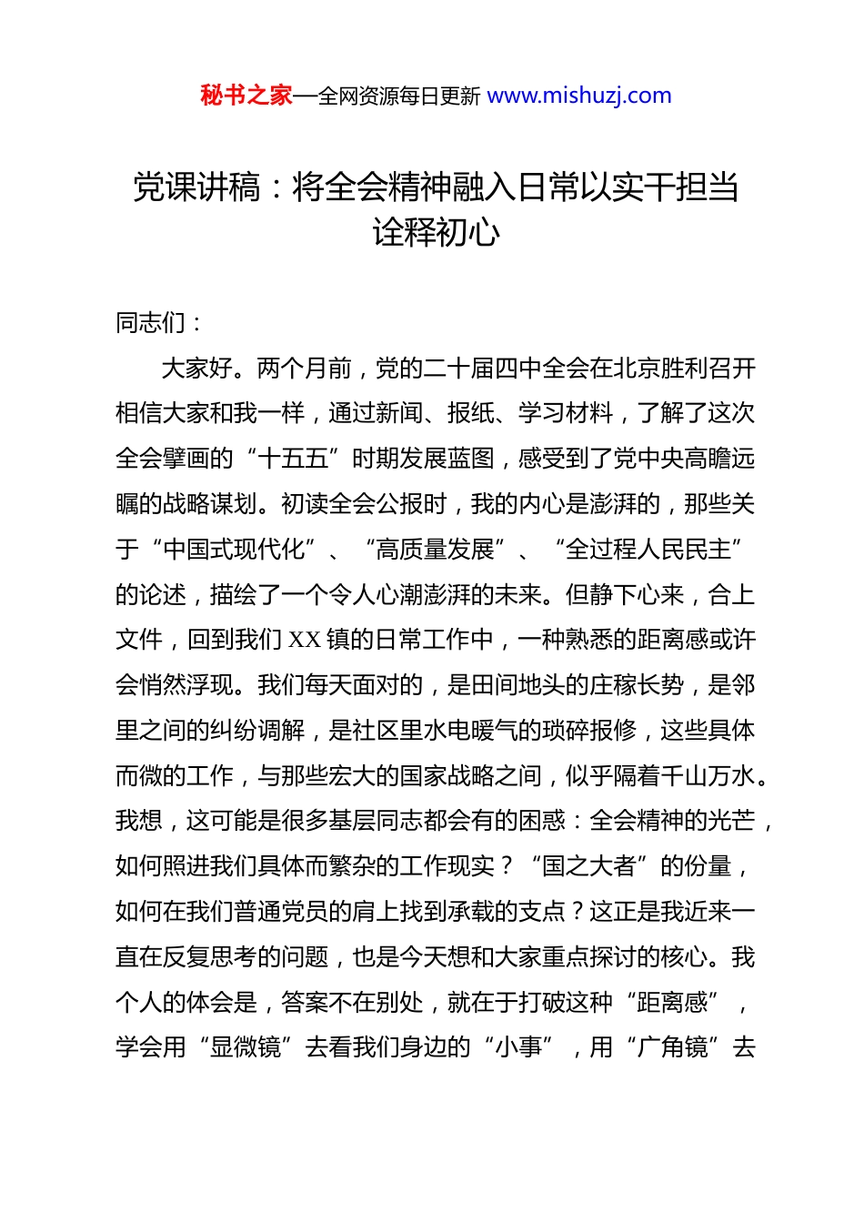 秘书之家—全网资源每日更新 www.mishuzj.com党课讲稿:将全会精神融入日常以实干担当诠释初心 同志们:大家好。两个月前,党的二十届四中全会在北京胜利召开相信大家和我一样,通过新闻、报纸、学习材料,了解了这次全会擘画的“十五五”时期发展蓝图,感受到了党中央高瞻远瞩的战略谋划。初读全会公报时,我的内心是澎湃的,那些关于“中国式现代化”、“高质量发展”、“全过程人民民主”的论述,描绘了一个令人心潮澎湃的未来。但静下心来,合上文件,回到我们 XX 镇的日常工作中,一种熟悉的距离感或许会悄然浮现。我们每天面对的,是田间地头的庄稼长势,是邻里之间的纠纷调解,是社区里水电暖气的琐碎报修,这些具体而微的工作,与那些宏大的国家战略之间,似乎隔着千山万水。我想,这可能是很多基层同志都会有的困惑:全会精神的光芒,如何照进我们具体而繁杂的工作现实?“国之大者”的份量,如何在我们普通党员的肩上找到承载的支点?这正是我近来一直在反复思考的问题,也是今天想和大家重点探讨的核心。我个人的体会是,答案不在别处,就在于打破这种“距离感”,学会用“显微镜”去看我们身边的“小事”,用“广角镜”去秘书之家—全网资源每日更新 www.mishuzj.com理解这些“小事”背后的“大义”。一、从宏大叙事到个人感知全会精神的温度首先,我想分享一个观点:真正深刻的理论,一定是有温度的,是可以触摸和感知的。全会精神的温度,就体现在它对“人民”二字的千钧之重,体现在它对基层治理的高度关注上。全会审议通过的“十五五”规划建议中,明确将“加强党建引领基层治理和基层政权建设”摆在了十分重要的位置。这短短的一句话,对于身处乡镇一线的我们来说,意义非凡。它清晰地告诉我们,乡镇是国家治理体系的“神经末梢”,我们的一举一动,都关系到党和国家方针政策能否真正落地生根,关系到人民群众的切身感受。这个“神经末梢”如果麻木、迟钝,那么再好的顶层设计,传导到最后也会失真、失效。我想起前段时间的一件小事。当时全会刚刚闭幕,学习宣传活动正在逐步展开。我因为工作安排,到 XX 村走访。刚进村口,就看到 XX 阿姨在自家门口来回踱步,满面愁容。我上前询问,原来是她的老伴生病住院,新农合的报销流程她不太懂,手机上又有几个步骤操作不明白,急得团团转。看着她焦急无助的眼神,我什么都没多想,就坐在她家门槛上,一步一步地教她操作,帮她联系相关部门确认信息。等所有事情都办妥,她长舒一口气,紧紧握着我的手说:“真是太谢谢你了,秘书之家—全网资源每日更新 www.mishuzj.com不然我真不知道该怎么办。”在回来的路上,我心里反复回味着这件事。帮助 XX 阿姨解决医保报销的难题,这难道不就是“基层治理”最生动的体现吗?全会报告中提到的“健全社会保障体系”、“提升公共服务水平”,不就是通过这样一件件具体的小事,最终落实到每一个老百姓身上的吗?那一刻,我豁然开朗。全会精神不再是文件上抽象的铅字,它变成了 XX 阿姨脸上舒展的皱纹,变成了她那句朴素的“谢谢你”。它的温度,透过我的手,传递到了群众的心里,也温暖了我作为一名共产党员的初心。这让我深刻地认识到,“基层治理”不是一个悬浮在空中的理论词汇,它就是我们脚下这片土地,是我们每天打交道的张家长、李家短,是我们努力去解决的一个个具体问题。我们工作的价值,恰恰就在于此。把中央的精神,通过我们具体、细致、充满人情味的工作,转化为群众看得见、摸得着、享受得到的实惠。这个过程,就是我们基层党员践行全会精神最直接、最有效的方式。我们每一个岗位,都是承载这份宏大叙事最坚实的基座。截至 2025 年底的官方数据显示,我们党拥有超过 1 亿名党员和 525 万个基层党组织。这个庞大的数字背后,是一个个鲜活的个体和一个个坚强的战斗堡垒。我们 XX 镇党委,就是这秘书之家—全网资源每日更新 www.mishuzj.com525 万分之一;在座的每一位同志,就是这 1 亿分之一。当我们把自己的工作放到这个宏大的坐标系中去审视,就会发现,个人的力量虽然微小,但汇聚起来,就是推动国家前进的磅礴伟力。我们为 XX 镇的发展...