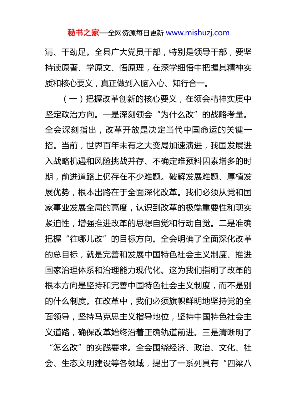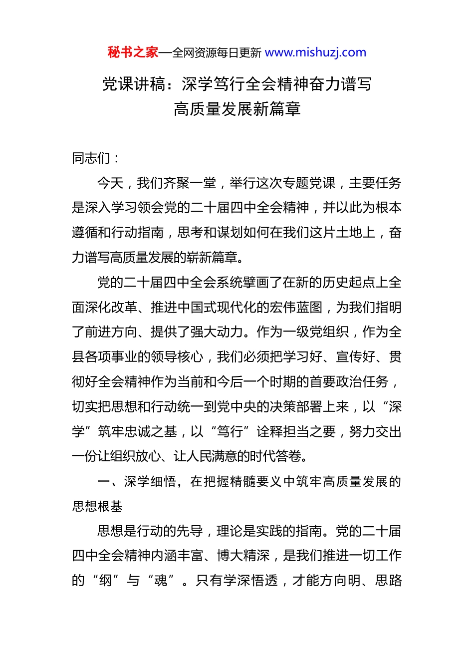 秘书之家—全网资源每日更新 www.mishuzj.com党课讲稿:深学笃行全会精神奋力谱写高质量发展新篇章 同志们:今天,我们齐聚一堂,举行这次专题党课,主要任务是深入学习领会党的二十届四中全会精神,并以此为根本遵循和行动指南,思考和谋划如何在我们这片土地上,奋力谱写高质量发展的崭新篇章。党的二十届四中全会系统擘画了在新的历史起点上全面深化改革、推进中国式现代化的宏伟蓝图,为我们指明了前进方向、提供了强大动力。作为一级党组织,作为全县各项事业的领导核心,我们必须把学习好、宣传好、贯彻好全会精神作为当前和今后一个时期的首要政治任务,切实把思想和行动统一到党中央的决策部署上来,以“深学”筑牢忠诚之基,以“笃行”诠释担当之要,努力交出一份让组织放心、让人民满意的时代答卷。一、深学细悟,在把握精髓要义中筑牢高质量发展的思想根基思想是行动的先导,理论是实践的指南。党的二十届四中全会精神内涵丰富、博大精深,是我们推进一切工作的“纲”与“魂”。只有学深悟透,才能方向明、思路秘书之家—全网资源每日更新 www.mishuzj.com清、干劲足。全县广大党员干部,特别是领导干部,要坚持读原著、学原文、悟原理,在深学细悟中把握其精神实质和核心要义,真正做到入脑入心、知行合一。(一)把握改革创新的核心要义,在领会精神实质中坚定政治方向。一是深刻领会“为什么改”的战略考量。全会深刻指出,改革开放是决定当代中国命运的关键一招。当前,世界百年未有之大变局加速演进,我国发展进入战略机遇和风险挑战并存、不确定难预料因素增多的时期,前进道路上仍存在不少难题。破解发展难题、厚植发展优势,根本出路在于全面深化改革。我们必须从党和国家事业发展全局的高度,认识到改革的极端重要性和现实紧迫性,增强推进改革的思想自觉和行动自觉。二是准确把握“往哪儿改”的目标方向。全会明确了全面深化改革的总目标,就是完善和发展中国特色社会主义制度、推进国家治理体系和治理能力现代化。这为我们指明了改革的根本方向是坚持和完善中国特色社会主义制度,而不是别的什么制度。在改革中,我们必须旗帜鲜明地坚持党的全面领导,坚持马克思主义指导地位,坚持中国特色社会主义道路,确保改革始终沿着正确轨道前进。三是清晰明了“怎么改”的实践要求。全会围绕经济、政治、文化、社会、生态文明建设等各领域,提出了一系列具有“四梁八秘书之家—全网资源每日更新 www.mishuzj.com柱”性质的重大改革举措。这些举措问题导向鲜明,系统集成性强,充分体现了党中央对新时代改革规律的深刻洞察。我们要做的,就是不折不扣地对标对表,将中央的“顶层设计”与我们县域的“基层实践”紧密结合,确保中央的改革精神在基层一线落地生根、开花结果。(二)把握时代赋予的重大使命,在服务国家大局中明确县域坐标。县域作为国民经济的基本单元,是党和国家大政方针贯彻落实的“最后一公里”,也是我们服务国家发展大局的“前沿阵地”。学习贯彻全会精神,必须胸怀“国之大者”,找准自身定位,明确奋斗坐标。一是把县域发展融入中国式现代化的宏大场景。中国式现代化是全体人民共同富裕的现代化。我们县虽然经济体量不大,但同样是这幅宏大画卷中不可或缺的一笔。我们要思考,如何通过发展特色产业,带动群众增收致富,为扎实推进共同富裕贡献县域力量;如何通过优化公共服务,让群众享受到更公平、更优质的教育、医疗和养老,提升人民群众的获得感、幸福感、安全感。二是把县域工作置于区域协调发展战略布局。全会强调要促进区域协调发展。我们要主动审视自身在省、市发展格局中的定位和优势,积极融入国家重大区域发展战略。无论是承接产业转移,还是加强生态共保;无论是推进基础设施互联互通,还是深化秘书之家—全网资源每日更新 www.mishuzj.com公共服务共建共享,都要有主动作为的意识和担当,在服务大局中拓展自身发展空间,实现与周边地区的错位发展、协同发展、联动发展。三是把县域治理作为国家治理体系的实践单元。郡县治,天下安。县域治理是国家治理的基石。全会提出的推进国家治理体系和治理能力现代化,最终要体现在我们每...