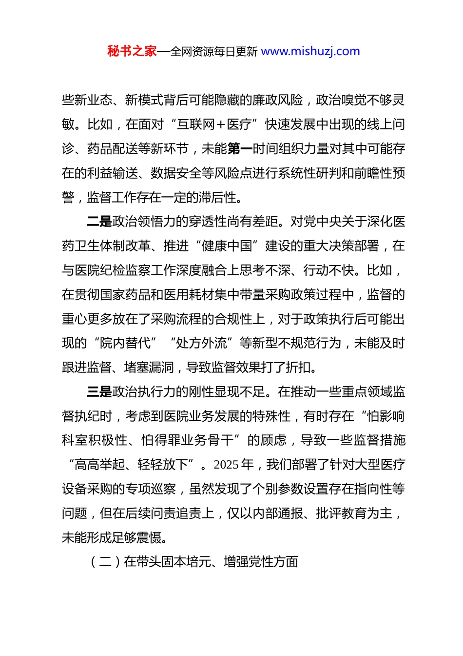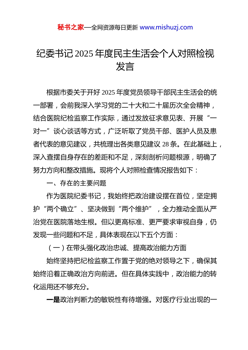 秘书之家—全网资源每日更新 www.mishuzj.com纪委书记 2025 年度民主生活会个人对照检视发言 根据市委关于开好 2025 年度党员领导干部民主生活会的统一部署,会前我深入学习党的二十大和二十届历次全会精神,结合医院纪检监察工作实际,通过发放征求意见表、开展“一对一”谈心谈话等方式,广泛听取了党员干部、医护人员及患者代表的意见建议,共梳理出各类意见建议 28 条。在此基础上,深入查摆自身存在的差距和不足,深刻剖析问题根源,明确了努力方向和整改措施。现将个人对照检查情况报告如下:一、存在的主要问题作为医院纪委书记,我始终把政治建设摆在首位,坚定拥护“两个确立”、坚决做到“两个维护”,全力推动全面从严治党在医院落地生根。但以更高标准、更严要求审视自身,仍发现一些问题和不足,具体表现在以下五个方面:(一)在带头强化政治忠诚、提高政治能力方面始终坚持把纪检监察工作置于党的绝对领导之下,确保其始终沿着正确政治方向前进。但在具体实践中,政治能力的转化运用还不够充分。一是政治判断力的敏锐性有待增强。对医疗行业出现的一秘书之家—全网资源每日更新 www.mishuzj.com些新业态、新模式背后可能隐藏的廉政风险,政治嗅觉不够灵敏。比如,在面对“互联网+医疗”快速发展中出现的线上问诊、药品配送等新环节,未能第一时间组织力量对其中可能存在的利益输送、数据安全等风险点进行系统性研判和前瞻性预警,监督工作存在一定的滞后性。二是政治领悟力的穿透性尚有差距。对党中央关于深化医药卫生体制改革、推进“健康中国”建设的重大决策部署,在与医院纪检监察工作深度融合上思考不深、行动不快。比如,在贯彻国家药品和医用耗材集中带量采购政策过程中,监督的重心更多放在了采购流程的合规性上,对于政策执行后可能出现的“院内替代”“处方外流”等新型不规范行为,未能及时跟进监督、堵塞漏洞,导致监督效果打了折扣。三是政治执行力的刚性显现不足。在推动一些重点领域监督执纪时,考虑到医院业务发展的特殊性,有时存在“怕影响科室积极性、怕得罪业务骨干”的顾虑,导致一些监督措施“高高举起、轻轻放下”。2025 年,我们部署了针对大型医疗设备采购的专项巡察,虽然发现了个别参数设置存在指向性等问题,但在后续问责追责上,仅以内部通报、批评教育为主,未能形成足够震慑。(二)在带头固本培元、增强党性方面秘书之家—全网资源每日更新 www.mishuzj.com能够坚持参加党委理论学习中心组学习和所在支部组织生活,自觉加强党性修养。但对标新时代党员干部的标准,自我锤炼的“熔炉”温度还不够高。一是理论武装的“消化吸收”不够彻底。学习党的创新理论,有时满足于读原著、学原文,但在“内化于心、外化于行”上做得不够。比如,学习《论党的自我革命》时,虽然对其中的重要论述能够熟记,但如何将其精髓要义转化为破解医院内部“熟人社会”监督难题的有效方法,缺乏系统性思考和创造性实践,理论与实践存在“两张皮”现象。二是斗争精神的“锋芒锐气”有所钝化。面对医院内部一些根深蒂固的陈规陋习,如节假日收受“小红包”、接受药械代表宴请等“微腐败”问题,虽然三令五申、常抓不懈,但有时斗争的韧劲和狠劲不足,存在“抓一批、停一阵、又反弹”的循环。在处理一名资深专家违规接受宴请问题时,考虑到其业务权威和行业影响,在处理上有所保留,未能做到“一寸不让”。三是党性锤炼的“日常坚守”偶有松懈。在繁重的工作压力下,有时不自觉地将主要精力投入到案件查办、线索处置等“显性”工作上,对参加支部主题党日活动、与普通党员医生谈心谈话等“隐性”的党性锤炼有所放松。2025 年,因公务繁秘书之家—全网资源每日更新 www.mishuzj.com忙,缺席了 2 次所在支部的组织生活会,反映出在处理业务工作和党建活动关系上,统筹得还不够好。(三)在带头敬畏人民、敬畏组织、敬畏法纪方面始终牢记权力是党和人民赋予的,坚持秉公用权、依法用权、廉洁用权。但对照“三个敬畏”的更高要求,仍存在一些薄弱环节。一是敬畏人民的立场站得不够稳。虽然将整治群众身边腐败和不正之风作为工作重点,但有时更多的...