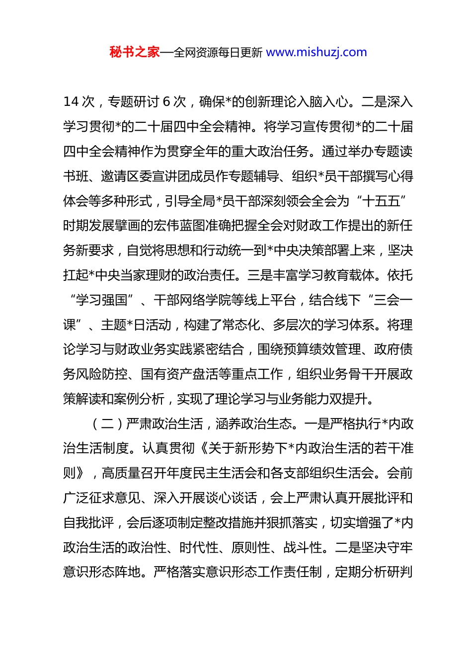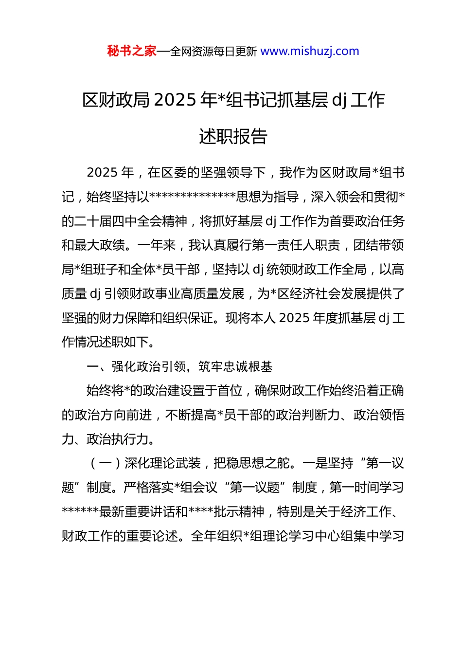 秘书之家—全网资源每日更新 www.mishuzj.com区财政局 2025 年*组书记抓基层 dj 工作述职报告2025 年,在区委的坚强领导下,我作为区财政局*组书记,始终坚持以**************思想为指导,深入领会和贯彻*的二十届四中全会精神,将抓好基层 dj 工作作为首要政治任务和最大政绩。一年来,我认真履行第一责任人职责,团结带领局*组班子和全体*员干部,坚持以 dj 统领财政工作全局,以高质量 dj 引领财政事业高质量发展,为*区经济社会发展提供了坚强的财力保障和组织保证。现将本人 2025 年度抓基层 dj 工作情况述职如下。一、强化政治引领,筑牢忠诚根基始终将*的政治建设置于首位,确保财政工作始终沿着正确的政治方向前进,不断提高*员干部的政治判断力、政治领悟力、政治执行力。(一)深化理论武装,把稳思想之舵。一是坚持“第一议题”制度。严格落实*组会议“第一议题”制度,第一时间学习******最新重要讲话和****批示精神,特别是关于经济工作、财政工作的重要论述。全年组织*组理论学习中心组集中学习秘书之家—全网资源每日更新 www.mishuzj.com14 次,专题研讨 6 次,确保*的创新理论入脑入心。二是深入学习贯彻*的二十届四中全会精神。将学习宣传贯彻*的二十届四中全会精神作为贯穿全年的重大政治任务。通过举办专题读书班、邀请区委宣讲团成员作专题辅导、组织*员干部撰写心得体会等多种形式,引导全局*员干部深刻领会全会为“十五五”时期发展擘画的宏伟蓝图准确把握全会对财政工作提出的新任务新要求,自觉将思想和行动统一到*中央决策部署上来,坚决扛起*中央当家理财的政治责任。三是丰富学习教育载体。依托“学习强国”、干部网络学院等线上平台,结合线下“三会一课”、主题*日活动,构建了常态化、多层次的学习体系。将理论学习与财政业务实践紧密结合,围绕预算绩效管理、政府债务风险防控、国有资产盘活等重点工作,组织业务骨干开展政策解读和案例分析,实现了理论学习与业务能力双提升。(二)严肃政治生活,涵养政治生态。一是严格执行*内政治生活制度。认真贯彻《关于新形势下*内政治生活的若干准则》,高质量召开年度民主生活会和各支部组织生活会。会前广泛征求意见、深入开展谈心谈话,会上严肃认真开展批评和自我批评,会后逐项制定整改措施并狠抓落实,切实增强了*内政治生活的政治性、时代性、原则性、战斗性。二是坚决守牢意识形态阵地。严格落实意识形态工作责任制,定期分析研判秘书之家—全网资源每日更新 www.mishuzj.com财政领域意识形态风险,加强对局门户网站、微信公众号等宣传阵地的管理。围绕积极财政政策、减税降费、惠企利民等主题,主动发声,讲好财政故事,传播财政声音,牢牢掌握意识形态工作领导权。(三)深入贯彻中央八项规定精神,持续净化政治风气。将深入贯彻中央八项规定精神学习教育作为一项长期而重大政治任务常抓不懈。组织全局*员干部系统学习《*政机关厉行节约反对浪费条例》等法规制度,及时传达学习中央及省、市、区纪委监委通报的违反中央八项规定精神典型案例,以案为鉴,以案明纪。坚持学查改一体推进,对照“四风”问题新表现新动向,深入开展自查自纠,教育引导*员干部将“习惯过紧日子”的思想内化于心、外化于行在全局上下营造了风清气正、崇廉尚实的浓厚氛围。二、压实主体责任,凝聚共抓合力牢固树立“抓好 dj 是本职、不抓 dj 是失职、抓不好 dj 是渎职”的责任意识,构建了层层负责、人人担当、齐抓共管的dj 工作格局。(一)坚持书记带头履责。作为*组书记,我始终坚持把 dj工作抓在手上、扛在肩上。年初主持召开*组会议专题研究制定《*区财政局 2025 年 dj 工作要点》和责任清单,将 dj 任务细秘书之家—全网资源每日更新 www.mishuzj.com化分解到人到岗。坚持 dj 工作与财政业务工作同谋划、同部署、同推进。每季度至少听取 1 次 dj 工作汇报,及时研究解决基层 dj 工作中遇到的困难和问题。带头落实双重组织生活制度,以普通*员身份参加所在支部活动,带头为全局*员干部讲授专题*课 2 次,示范带动 dj 责任落到实处。(二)推动班子协同担责。严格...