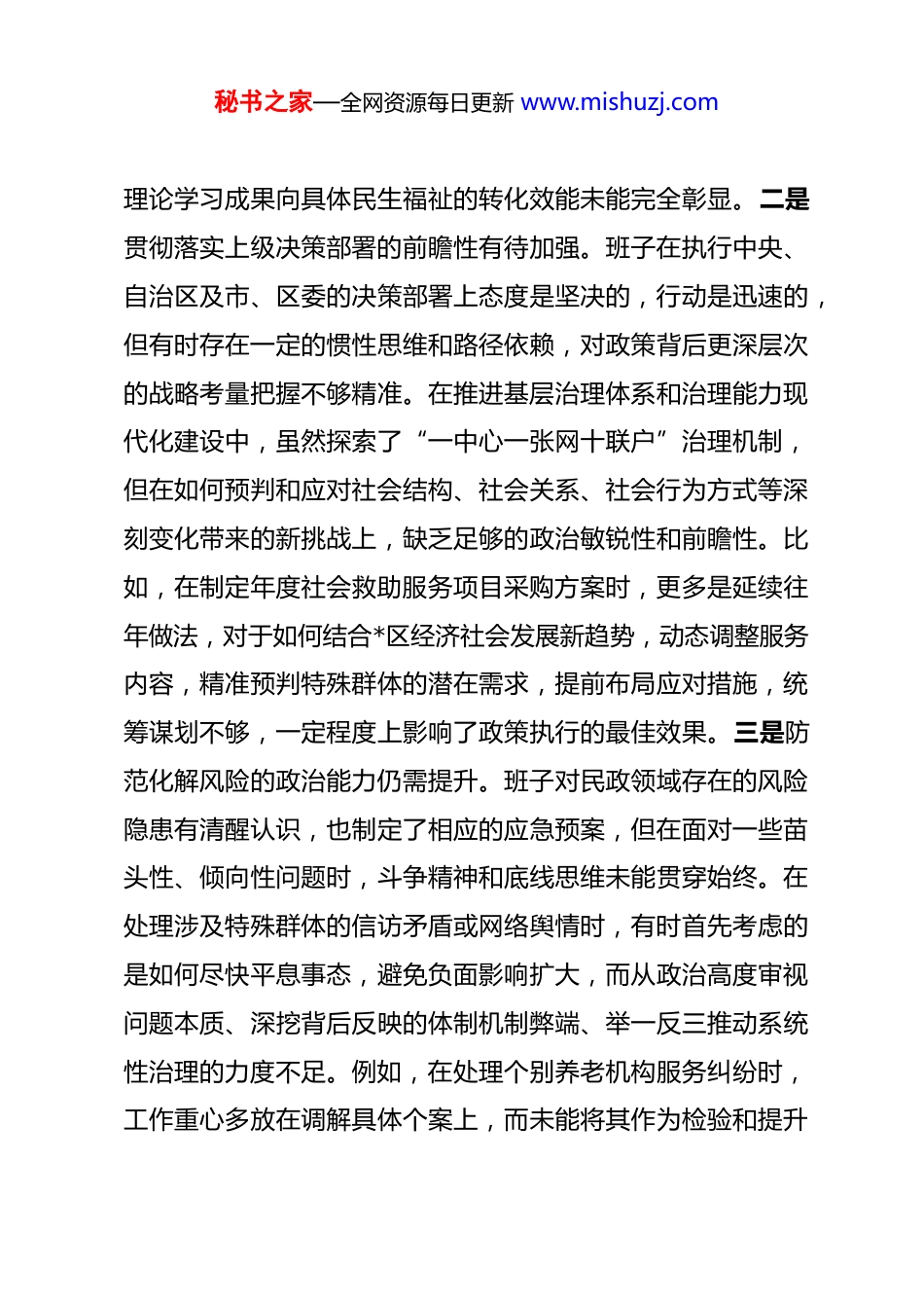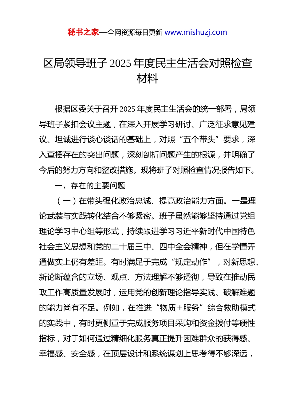 秘书之家—全网资源每日更新 www.mishuzj.com区局领导班子 2025 年度民主生活会对照检查材料 根据区委关于召开 2025 年度民主生活会的统一部署,局领导班子紧扣会议主题,在深入开展学习研讨、广泛征求意见建议、坦诚进行谈心谈话的基础上,对照“五个带头”要求,深入查摆存在的突出问题,深刻剖析问题产生的根源,并明确了今后的努力方向和整改措施。现将班子对照检查情况报告如下。一、存在的主要问题(一)在带头强化政治忠诚、提高政治能力方面。一是理论武装与实践转化结合不够紧密。班子虽然能够坚持通过党组理论学习中心组等形式,持续跟进学习习近平新时代中国特色社会主义思想和党的二十届三中、四中全会精神,但在学懂弄通做实上仍有差距。有时满足于完成“规定动作”,对新思想、新论断蕴含的立场、观点、方法理解不够透彻,导致在推动民政工作高质量发展时,运用党的创新理论指导实践、破解难题的能力尚有不足。例如,在推进“物质+服务”综合救助模式的实践中,有时更侧重于完成服务项目采购和资金拨付等硬性指标,对于如何通过精细化服务真正提升困难群众的获得感、幸福感、安全感,在顶层设计和系统谋划上思考得不够深远,秘书之家—全网资源每日更新 www.mishuzj.com理论学习成果向具体民生福祉的转化效能未能完全彰显。二是贯彻落实上级决策部署的前瞻性有待加强。班子在执行中央、自治区及市、区委的决策部署上态度是坚决的,行动是迅速的,但有时存在一定的惯性思维和路径依赖,对政策背后更深层次的战略考量把握不够精准。在推进基层治理体系和治理能力现代化建设中,虽然探索了“一中心一张网十联户”治理机制,但在如何预判和应对社会结构、社会关系、社会行为方式等深刻变化带来的新挑战上,缺乏足够的政治敏锐性和前瞻性。比如,在制定年度社会救助服务项目采购方案时,更多是延续往年做法,对于如何结合*区经济社会发展新趋势,动态调整服务内容,精准预判特殊群体的潜在需求,提前布局应对措施,统筹谋划不够,一定程度上影响了政策执行的最佳效果。三是防范化解风险的政治能力仍需提升。班子对民政领域存在的风险隐患有清醒认识,也制定了相应的应急预案,但在面对一些苗头性、倾向性问题时,斗争精神和底线思维未能贯穿始终。在处理涉及特殊群体的信访矛盾或网络舆情时,有时首先考虑的是如何尽快平息事态,避免负面影响扩大,而从政治高度审视问题本质、深挖背后反映的体制机制弊端、举一反三推动系统性治理的力度不足。例如,在处理个别养老机构服务纠纷时,工作重心多放在调解具体个案上,而未能将其作为检验和提升秘书之家—全网资源每日更新 www.mishuzj.com全区养老服务行业监管水平、完善风险防控体系的契机,未能从源头上彻底消除同类风险隐患。(二)在带头固本培元、增强党性方面。一是理想信念的淬炼不够经常。班子成员大多是长期在民政系统工作的干部,对民政工作怀有深厚感情,但随着工作头绪增多、事务性工作繁忙,有时不自觉地放松了对党性的持续锤炼和对世界观、人生观、价值观这个“总开关”的经常性检视。在繁重的工作压力下,偶尔会产生“歇歇脚”“喘口气”的想法,革命意志和奋斗精神有所减退。例如,在推进困难群众殡葬改革、倡导文明祭祀等触及传统观念的硬骨头工作时,面对部分群众的不理解和阻力,有时会滋生畏难情绪,认为工作推进“过急过快”可能会引发不稳定因素,从而放缓了工作节奏,这正是理想信念不够坚定的具体表现。二是党内政治生活的“熔炉”作用发挥不充分。班子能够严格执行“三会一课”、民主生活会、组织生活会等制度,但有时存在“以工作业务会代替党性分析会”的倾向。在开展批评与自我批评时,有时碍于情面,“辣味”不足,习惯于谈工作多、谈思想少,提希望多、点问题少,导致党内政治生活的政治性、时代性、原则性、战斗性未能完全体现。例如,在某次讨论年度预算安排的党组会上,对资金分配方案的不同意见未能展开充分的辩论,一些同志担心影响秘书之家—全网资源每日更新 www.mishuzj.com班子团结,没有把深层次的顾虑和建议摆到桌面上,使得决策的科学性和民主性打了折扣。三是宗旨意识的...