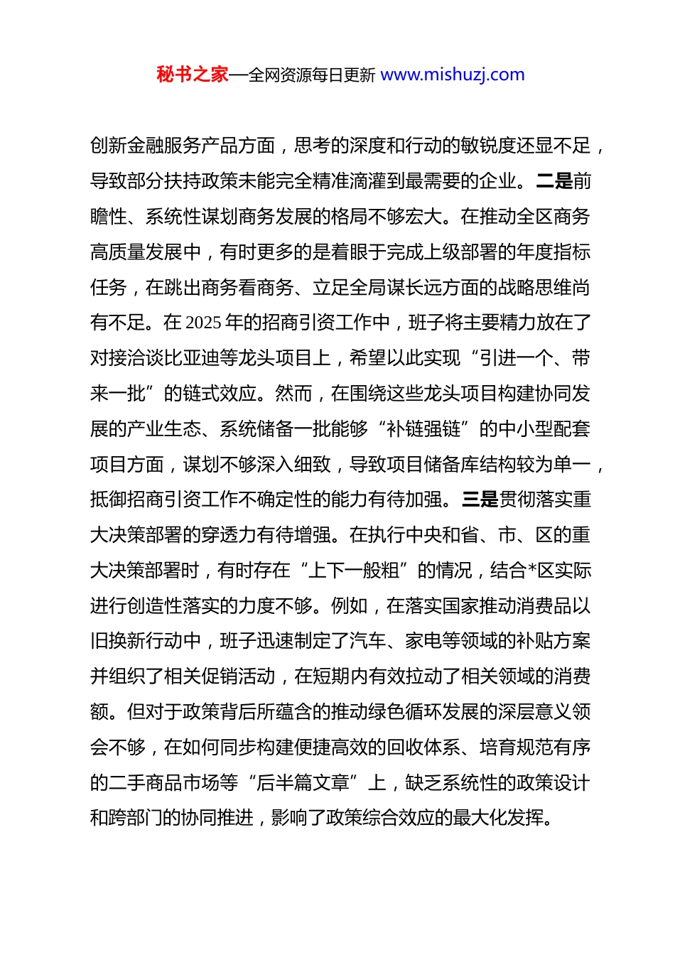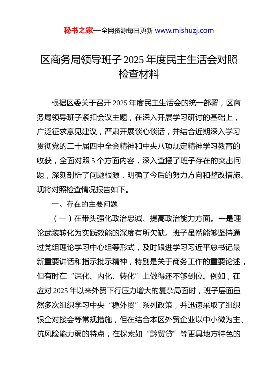 秘书之家—全网资源每日更新 www.mishuzj.com区商务局领导班子 2025 年度民主生活会对照检查材料 根据区委关于召开 2025 年度民主生活会的统一部署,区商务局领导班子紧扣会议主题,在深入开展学习研讨的基础上,广泛征求意见建议,严肃开展谈心谈话,并结合近期深入学习贯彻党的二十届四中全会精神和中央八项规定精神学习教育的收获,全面对照 5 个方面内容,深入查摆了班子存在的突出问题,深刻剖析了问题根源,明确了今后的努力方向和整改措施。现将对照检查情况报告如下。一、存在的主要问题(一)在带头强化政治忠诚、提高政治能力方面。一是理论武装转化为实践效能的深度有所欠缺。班子虽然能够坚持通过党组理论学习中心组等形式,及时跟进学习习近平总书记最新重要讲话和指示批示精神,特别是关于商务工作的重要论述,但有时在“深化、内化、转化”上做得还不够到位。例如,在应对 2025 年以来外贸下行压力增大的复杂局面时,班子层面虽然多次组织学习中央“稳外贸”系列政策,并迅速采取了组织银企对接会等常规措施,但在结合本区外贸企业以中小微为主、抗风险能力弱的特点,在探索如“黔贸贷”等更具地方特色的秘书之家—全网资源每日更新 www.mishuzj.com创新金融服务产品方面,思考的深度和行动的敏锐度还显不足,导致部分扶持政策未能完全精准滴灌到最需要的企业。二是前瞻性、系统性谋划商务发展的格局不够宏大。在推动全区商务高质量发展中,有时更多的是着眼于完成上级部署的年度指标任务,在跳出商务看商务、立足全局谋长远方面的战略思维尚有不足。在 2025 年的招商引资工作中,班子将主要精力放在了对接洽谈比亚迪等龙头项目上,希望以此实现“引进一个、带来一批”的链式效应。然而,在围绕这些龙头项目构建协同发展的产业生态、系统储备一批能够“补链强链”的中小型配套项目方面,谋划不够深入细致,导致项目储备库结构较为单一,抵御招商引资工作不确定性的能力有待加强。三是贯彻落实重大决策部署的穿透力有待增强。在执行中央和省、市、区的重大决策部署时,有时存在“上下一般粗”的情况,结合*区实际进行创造性落实的力度不够。例如,在落实国家推动消费品以旧换新行动中,班子迅速制定了汽车、家电等领域的补贴方案并组织了相关促销活动,在短期内有效拉动了相关领域的消费额。但对于政策背后所蕴含的推动绿色循环发展的深层意义领会不够,在如何同步构建便捷高效的回收体系、培育规范有序的二手商品市场等“后半篇文章”上,缺乏系统性的政策设计和跨部门的协同推进,影响了政策综合效应的最大化发挥。秘书之家—全网资源每日更新 www.mishuzj.com(二)在带头固本培元、增强党性方面。一是党建工作与业务工作融合的紧密度有待提升。班子虽然高度重视党建工作,但在推动党建与商务工作深度融合、互促共进方面,探索的有效路径还不多,有时存在“两张皮”现象。在推动党建引领商务经济发展的过程中更多的是将党建工作作为一项独立的政治任务来完成,未能完全将党组织的战斗堡垒作用和党员的先锋模范作用,具体化为破解招商引资难题、服务外贸企业、优化营商环境等业务工作的强大动力。例如,在服务长城智选等新引进零售企业落地过程中,可以更多地发挥党员干部突击队的作用,建立“一对一”帮扶机制,将解决企业审批、装修、招聘等实际困难作为检验党建成效的试金石,但实践中这种机制化的结合还不够。二是运用批评和自我批评武器的“辣味”略显不足。在民主生活会、组织生活会等党内政治生活中,班子成员之间开展相互批评时,有时存在“与人为善”的思想,多是点出工作层面、业务范围内的表象问题,对于触及思想深处、涉及党性原则的深层次问题,则讲得比较含蓄、比较委婉。在2025 年度的工作总结复盘会议上,班子对取得的成绩,如社会消费品零售总额的增长等数据谈得较多但对工作中存在的短板,如消费场景创新不足、传统商圈活力下降等问题,虽然有所提及,但未能从思想根源、党性修养层面进行深入的自我剖析和秘书之家—全网资源每日更新 www.mishuzj.com相互批评,影响了党内政治生活的严肃性和战斗性。三是坚定理想信念的政治定力...