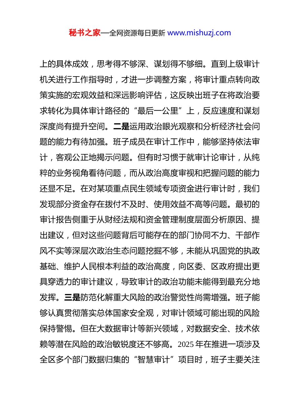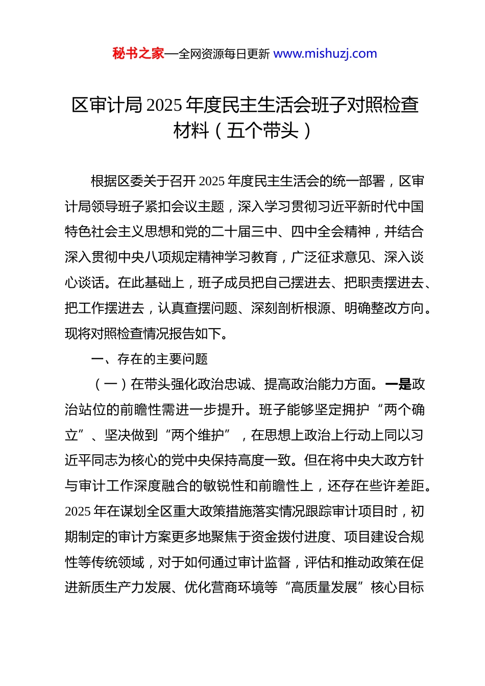 秘书之家—全网资源每日更新 www.mishuzj.com区审计局 2025 年度民主生活会班子对照检查材料(五个带头) 根据区委关于召开 2025 年度民主生活会的统一部署,区审计局领导班子紧扣会议主题,深入学习贯彻习近平新时代中国特色社会主义思想和党的二十届三中、四中全会精神,并结合深入贯彻中央八项规定精神学习教育,广泛征求意见、深入谈心谈话。在此基础上,班子成员把自己摆进去、把职责摆进去、把工作摆进去,认真查摆问题、深刻剖析根源、明确整改方向。现将对照检查情况报告如下。一、存在的主要问题(一)在带头强化政治忠诚、提高政治能力方面。一是政治站位的前瞻性需进一步提升。班子能够坚定拥护“两个确立”、坚决做到“两个维护”,在思想上政治上行动上同以习近平同志为核心的党中央保持高度一致。但在将中央大政方针与审计工作深度融合的敏锐性和前瞻性上,还存在些许差距。2025 年在谋划全区重大政策措施落实情况跟踪审计项目时,初期制定的审计方案更多地聚焦于资金拨付进度、项目建设合规性等传统领域,对于如何通过审计监督,评估和推动政策在促进新质生产力发展、优化营商环境等“高质量发展”核心目标秘书之家—全网资源每日更新 www.mishuzj.com上的具体成效,思考得不够深、谋划得不够细。直到上级审计机关进行工作指导时,才进一步调整方案,将审计重点转向政策实施的宏观效益和深远影响评估,这反映出班子在将政治要求转化为具体审计路径的“最后一公里”上,反应速度和谋划深度尚有提升空间。二是运用政治眼光观察和分析经济社会问题的能力有待加强。班子成员在审计工作中,能够坚持依法审计,客观公正地揭示问题。但有时习惯于就审计论审计,从纯粹的业务视角看待问题,而从政治高度审视和把握问题的能力还显不足。在对某项重点民生领域专项资金进行审计时,我们发现部分资金存在拨付不及时、使用效益不高等问题。最初的审计报告侧重于从财经法规和资金管理制度层面分析原因、提出建议,但对这些问题背后可能存在的部门协同不力、干部作风不实等深层次政治生态问题挖掘不够,未能从巩固党的执政基础、维护人民根本利益的政治高度,向区委、区政府提出更具穿透力的审计建议,导致审计的政治功能未能得到最充分地发挥。三是防范化解重大风险的政治警觉性尚需增强。班子能够认真贯彻落实总体国家安全观,对审计领域可能出现的风险保持警惕。但在大数据审计等新兴领域,对数据安全、技术依赖等潜在风险的政治敏锐度还不够高。2025 年在推进一项涉及全区多个部门数据归集的“智慧审计”项目时,班子主要关注秘书之家—全网资源每日更新 www.mishuzj.com的是如何打破数据壁垒、提高审计效率对于跨部门数据融合后可能带来的数据权属争议、信息安全泄露等潜在政治风险和社会稳定风险,前期论证和预案准备不够充分。在项目推进过程中,因数据安全协议细节问题与相关单位产生分歧,一度影响了工作进度,暴露出在运用新技术提升审计能力的同时,统筹发展和安全的政治思维和底线思维仍需持续强化。(二)在带头固本培元、增强党性方面。一是理论学习与审计实践结合不够紧密。班子坚持将习近平新时代中国特色社会主义思想作为“第一议题”来学习,但有时存在“为了学习而学习”的倾向,在学思用贯通、知信行统一上做得还不到位。例如,在组织学习贯彻习近平总书记关于党的自我革命的重要思想时,班子成员在集中研讨中都能谈出深刻的认识和体会,但如何将这些思想精髓有效融入对领导干部经济责任审计的实践中,用以指导审计工作更精准地揭示体制机制弊病、促进权力规范运行,缺乏系统性的方法论和操作路径研究。审计实践中,仍较多地停留在财务收支的真实性、合规性层面,对被审计领导干部所在单位政治生态的“画像”分析不够深入,理论学习成果向审计监督效能的转化率有待提高。二是党性锤炼的自觉性有待进一步强化。班子成员能够自觉遵守党章党规党纪,但在时时处处用党性原则检视言行、修正偏差上,标准还不够秘书之家—全网资源每日更新 www.mishuzj.com高、要求还不够严。在日常工作中,偶尔会滋生“审计是业务部门,把业务干好就行”的片面认识,在党...