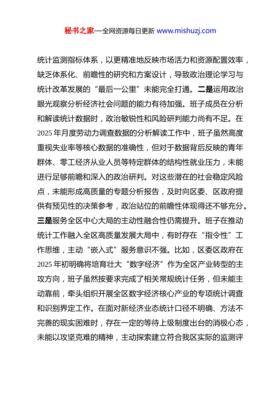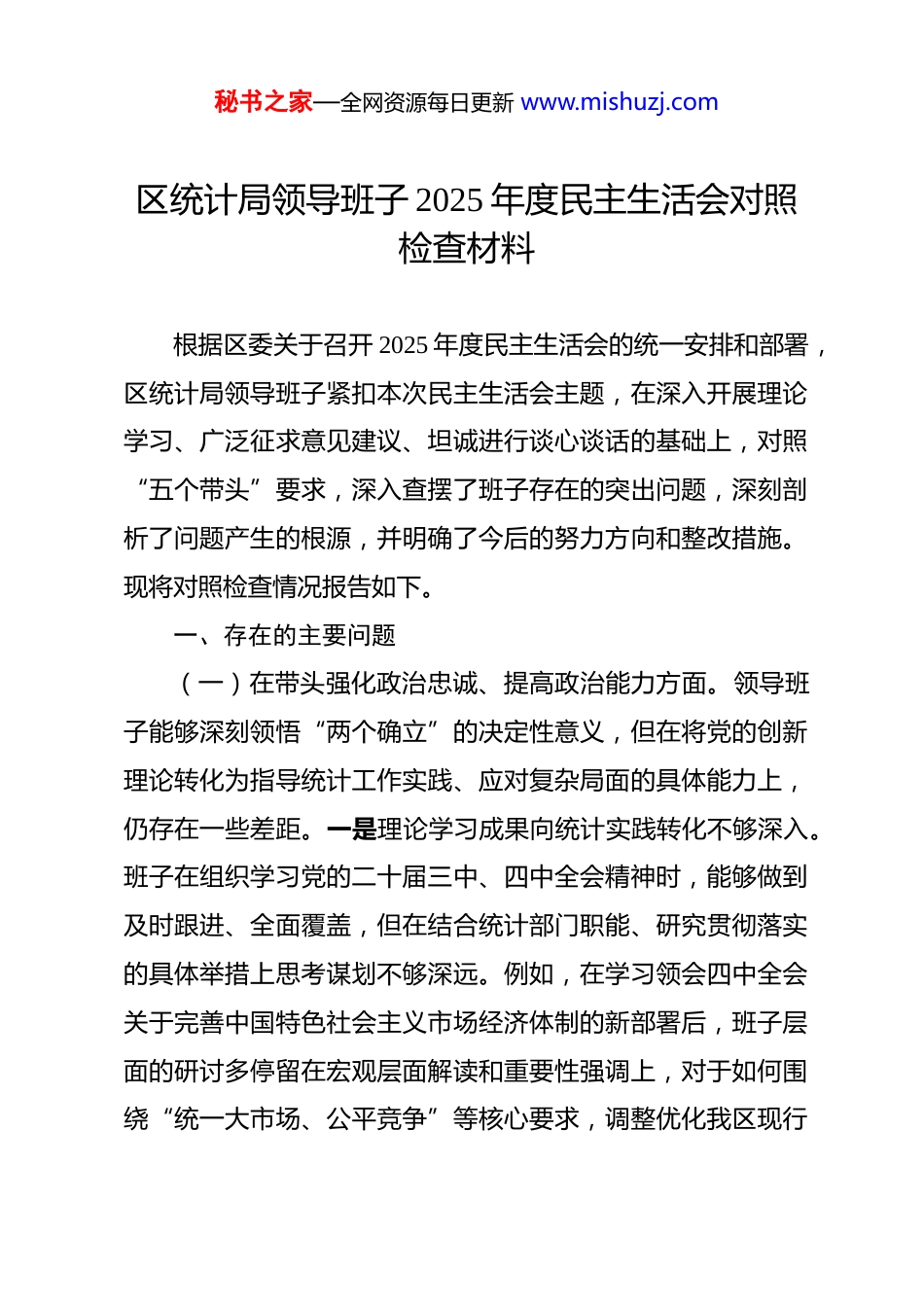 秘书之家—全网资源每日更新 www.mishuzj.com区统计局领导班子 2025 年度民主生活会对照检查材料 根据区委关于召开 2025 年度民主生活会的统一安排和部署,区统计局领导班子紧扣本次民主生活会主题,在深入开展理论学习、广泛征求意见建议、坦诚进行谈心谈话的基础上,对照“五个带头”要求,深入查摆了班子存在的突出问题,深刻剖析了问题产生的根源,并明确了今后的努力方向和整改措施。现将对照检查情况报告如下。一、存在的主要问题(一)在带头强化政治忠诚、提高政治能力方面。领导班子能够深刻领悟“两个确立”的决定性意义,但在将党的创新理论转化为指导统计工作实践、应对复杂局面的具体能力上,仍存在一些差距。一是理论学习成果向统计实践转化不够深入。班子在组织学习党的二十届三中、四中全会精神时,能够做到及时跟进、全面覆盖,但在结合统计部门职能、研究贯彻落实的具体举措上思考谋划不够深远。例如,在学习领会四中全会关于完善中国特色社会主义市场经济体制的新部署后,班子层面的研讨多停留在宏观层面解读和重要性强调上,对于如何围绕“统一大市场、公平竞争”等核心要求,调整优化我区现行秘书之家—全网资源每日更新 www.mishuzj.com统计监测指标体系,以更精准地反映市场活力和资源配置效率,缺乏体系化、前瞻性的研究和方案设计,导致政治理论学习与统计改革发展的“最后一公里”未能完全打通。二是运用政治眼光观察分析经济社会问题的能力有待加强。班子成员在分析和解读统计数据时,政治敏锐性和风险研判能力尚有不足。在2025 年月度劳动力调查数据的分析解读工作中,班子虽然高度重视失业率等核心数据的准确性,但对于数据背后反映的青年群体、零工经济从业人员等特定群体的结构性就业压力,未能进行足够前瞻和深入的政治研判。对这些潜在的社会稳定风险点,未能形成高质量的专题分析报告,及时向区委、区政府提供有预见性的决策参考,政治站位的前瞻性体现得还不够充分。三是服务全区中心大局的主动性融合性仍需提升。班子在推动统计工作融入全区高质量发展大局中,有时存在“指令性”工作思维,主动“嵌入式”服务意识不强。比如,区委区政府在2025 年初明确将培育壮大“数字经济”作为全区产业转型的主攻方向,班子虽然按要求完成了相关常规统计任务,但未能主动靠前,牵头组织开展全区数字经济核心产业的专项统计调查和识别界定工作。在面对新经济业态统计口径不明确、方法不完善的现实困难时,存在一定的等待上级制度出台的消极心态,未能以攻坚克难的精神,主动探索建立符合我区实际的监测评秘书之家—全网资源每日更新 www.mishuzj.com估体系,服务中心工作的“参谋部”作用发挥还不够到位。(二)在带头固本培元、增强党性方面。班子始终坚持以习近平新时代中国特色社会主义思想凝心铸魂,但在将党性修养内化于心、外化于行的具体实践中,还存在一些薄弱环节。一是理论学习与思想改造的结合不够紧密。班子在组织开展党纪学习教育和中央八项规定精神学习教育时,能够严格按照要求完成各项“规定动作”,但对照反面典型案例进行深刻反思、触及灵魂的“自选动作”做得不够。在一些内部学习会上,讨论多集中于条款本身的学习记忆,而对于如何从思想深处根除“数据寻租”“人情统计”等潜在廉政风险,如何将“实事求是”这一党的思想路线真正熔铸为统计人员不可动摇的职业信仰,挖掘得不够深刻,导致理论学习在改造主观世界上未能发挥最大效力。二是在坚持实事求是原则上存在思想顾虑。面对经济下行压力,班子在审核、评估一些关键经济指标时,偶尔会产生“报喜不报忧”的微妙心态。例如,在 2025 年第三季度的经济运行分析会上,面对一项反映工业景气度的指标出现较大幅度下滑,班子成员在讨论分析原因时,花费了较多精力去寻找一些偶然性、外部性的因素来加以解释,或试图通过补充其他领域的亮点数据来“对冲”负面影响。这种潜意识里希望数据“好看一些”的想法,虽然最终并未影响数据的真实准确,秘书之家—全网资源每日更新 www.mishuzj.com但偏离了党性原则所要求的、直面问题、客观反映的求是精神。三是党内政治生活中的“辣...