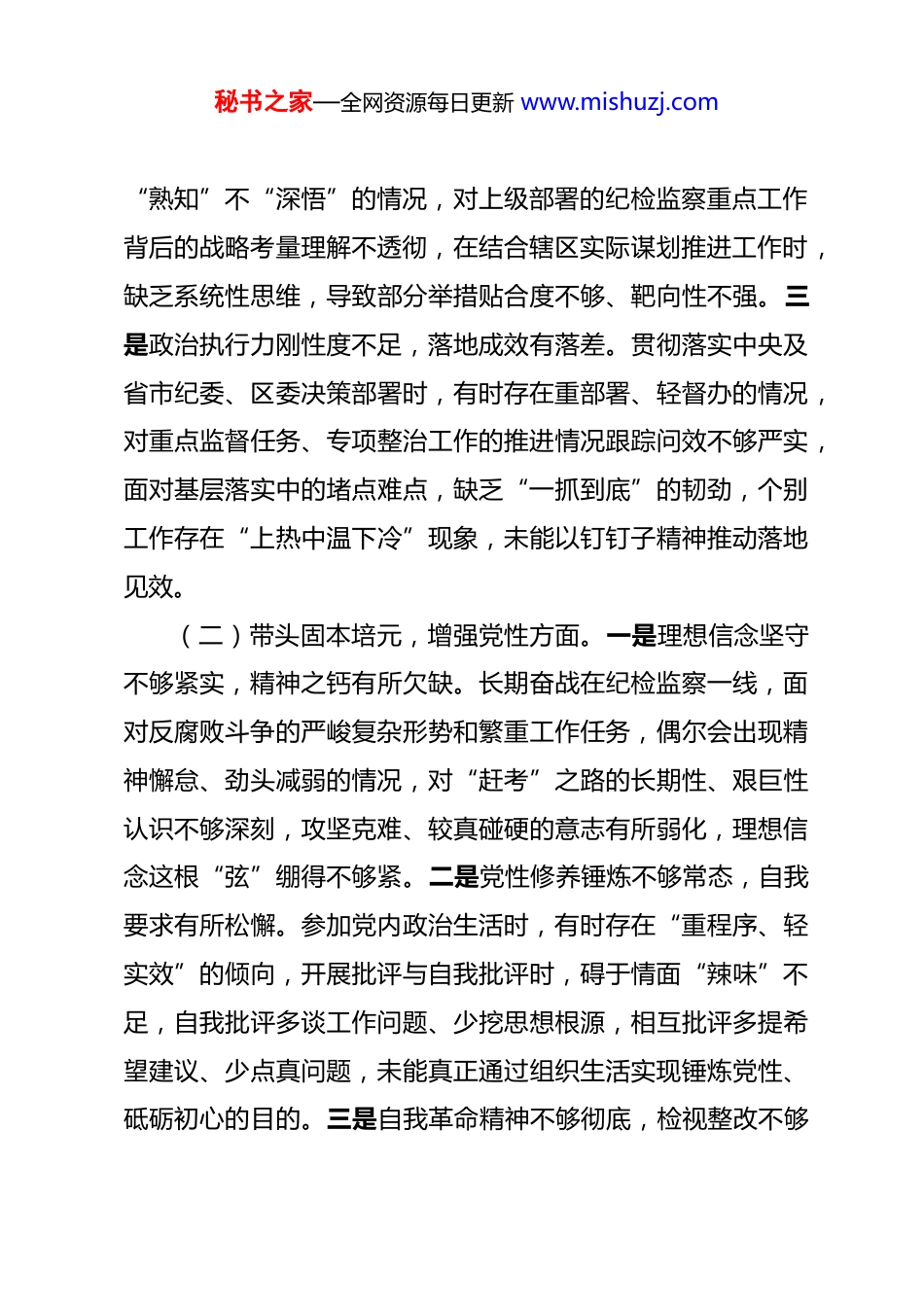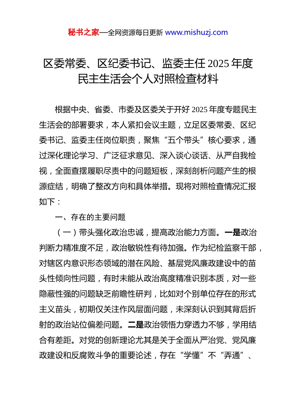 秘书之家—全网资源每日更新 www.mishuzj.com区委常委、区纪委书记、监委主任 2025 年度民主生活会个人对照检查材料 根据中央、省委、市委及区委关于开好 2025 年度专题民主生活会的部署要求,本人紧扣会议主题,立足区委常委、区纪委书记、监委主任岗位职责,聚焦“五个带头”核心要求,通过深化理论学习、广泛征求意见、深入谈心谈话、从严自我检视,全面查摆履职尽责中的问题短板,深刻剖析问题产生的根源症结,明确了整改方向和具体举措。现将对照检查情况汇报如下:一、存在的主要问题(一)带头强化政治忠诚,提高政治能力方面。一是政治判断力精准度不足,政治敏锐性有待加强。作为纪检监察干部,对辖区内意识形态领域的潜在风险、基层党风廉政建设中的苗头性倾向性问题,有时未能从政治高度精准识别本质,对一些隐蔽性强的问题缺乏前瞻性研判,比如对个别单位存在的形式主义苗头,初期仅关注作风层面问题,未深刻认识到其背后折射的政治站位偏差问题。二是政治领悟力穿透力不够,学用结合有差距。对党的创新理论尤其是关于全面从严治党、党风廉政建设和反腐败斗争的重要论述,存在“学懂”不“弄通”、秘书之家—全网资源每日更新 www.mishuzj.com“熟知”不“深悟”的情况,对上级部署的纪检监察重点工作背后的战略考量理解不透彻,在结合辖区实际谋划推进工作时,缺乏系统性思维,导致部分举措贴合度不够、靶向性不强。三是政治执行力刚性度不足,落地成效有落差。贯彻落实中央及省市纪委、区委决策部署时,有时存在重部署、轻督办的情况,对重点监督任务、专项整治工作的推进情况跟踪问效不够严实,面对基层落实中的堵点难点,缺乏“一抓到底”的韧劲,个别工作存在“上热中温下冷”现象,未能以钉钉子精神推动落地见效。(二)带头固本培元,增强党性方面。一是理想信念坚守不够紧实,精神之钙有所欠缺。长期奋战在纪检监察一线,面对反腐败斗争的严峻复杂形势和繁重工作任务,偶尔会出现精神懈怠、劲头减弱的情况,对“赶考”之路的长期性、艰巨性认识不够深刻,攻坚克难、较真碰硬的意志有所弱化,理想信念这根“弦”绷得不够紧。二是党性修养锤炼不够常态,自我要求有所松懈。参加党内政治生活时,有时存在“重程序、轻实效”的倾向,开展批评与自我批评时,碍于情面“辣味”不足,自我批评多谈工作问题、少挖思想根源,相互批评多提希望建议、少点真问题,未能真正通过组织生活实现锤炼党性、砥砺初心的目的。三是自我革命精神不够彻底,检视整改不够秘书之家—全网资源每日更新 www.mishuzj.com深入。对标党章党规党纪、对标纪检监察铁军标准,自我净化、自我完善的自觉性不足,日常更多聚焦业务工作推进,对自身思想动态、党性修养的反思检视不够常态化,存在“过关”思想,整改问题有时满足于“完成整改”,未能做到举一反三、长效巩固。(三)带头敬畏人民、敬畏组织、敬畏法纪方面。一是宗旨意识践行不够深入,为民执纪有温差。始终坚守执纪为民初心,但深入基层倾听群众呼声不够扎实,对群众反映强烈的民生领域腐败和作风问题,主动摸排、精准查处的力度有待加强;对信访举报件的办理,有时更注重办结率,对群众满意度跟踪回访不够到位,未能完全做到“事事有回音、件件暖民心”。二是组织观念恪守不够严格,请示报告不够主动。坚决服从组织安排、恪守组织原则,但有时存在重执行、轻汇报的情况,对纪检监察工作中的重大事项、重要进展,主动向区委和市纪委请示报告不够及时、全面;在落实组织决定过程中,偶尔会结合自身工作节奏调整推进节奏,缺乏“无条件服从、全方位落实”的绝对自觉。三是法治思维运用不够娴熟,依规履职有短板。作为监委主任,带头尊法学法守法用法的表率作用发挥不够充分,在精准运用纪法条款、规范履行监察程序上仍有差距;在查办案件过程中,有时存在重实体、轻程序的倾向,对秘书之家—全网资源每日更新 www.mishuzj.com证据链的规范完善把关不够严格,运用法治思维和法治方式惩治腐败的能力有待进一步提升。(四)带头干事创业,担当作为方面。一是斗争精神不够昂扬,动真碰硬有顾虑。面对辖区内深层次腐败问题、权力运...