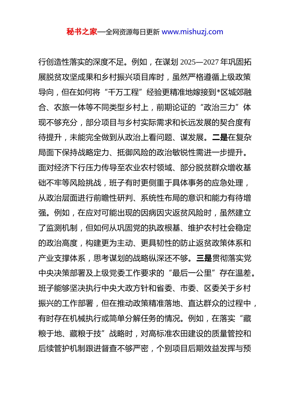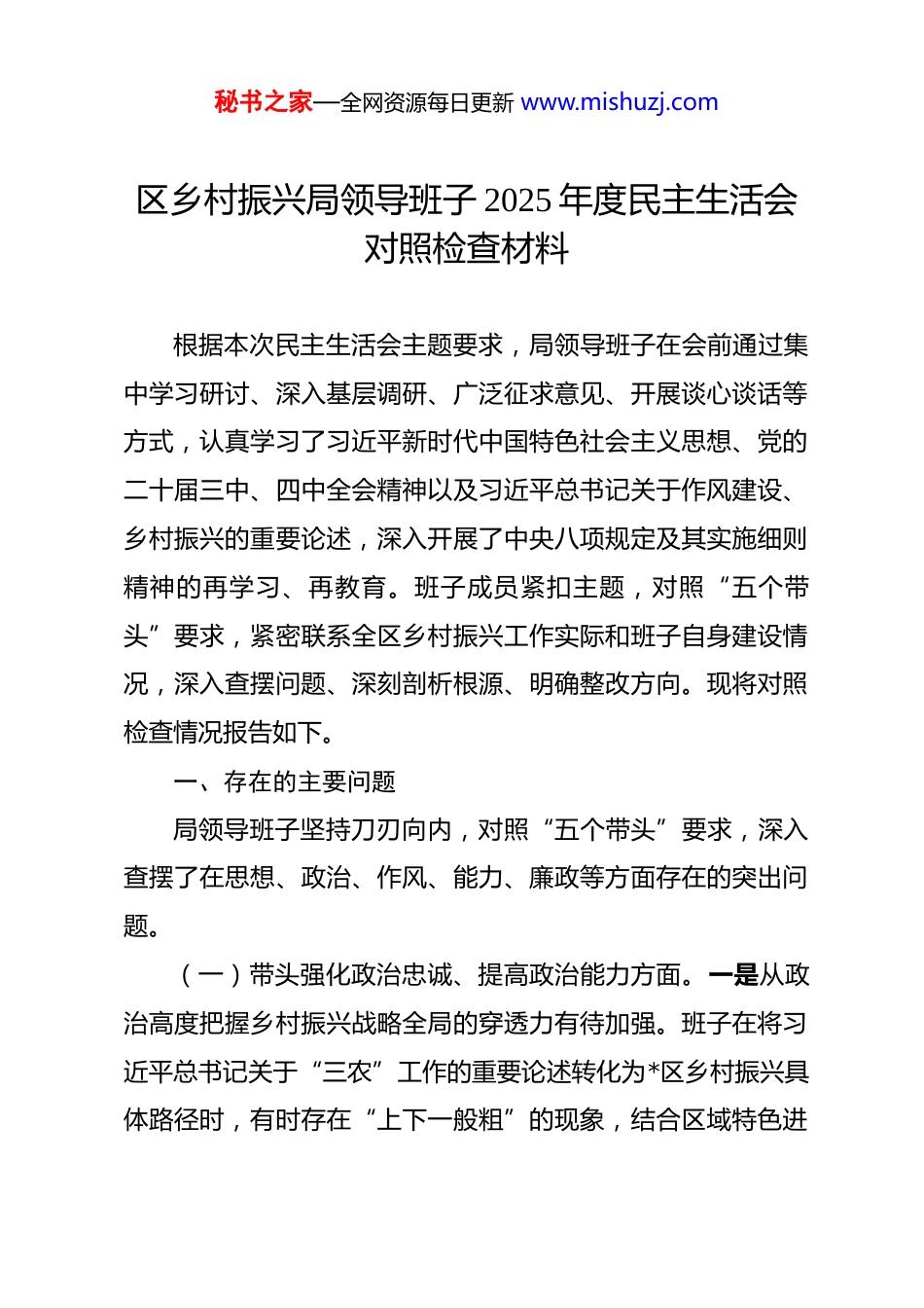 秘书之家—全网资源每日更新 www.mishuzj.com区乡村振兴局领导班子 2025 年度民主生活会对照检查材料 根据本次民主生活会主题要求,局领导班子在会前通过集中学习研讨、深入基层调研、广泛征求意见、开展谈心谈话等方式,认真学习了习近平新时代中国特色社会主义思想、党的二十届三中、四中全会精神以及习近平总书记关于作风建设、乡村振兴的重要论述,深入开展了中央八项规定及其实施细则精神的再学习、再教育。班子成员紧扣主题,对照“五个带头”要求,紧密联系全区乡村振兴工作实际和班子自身建设情况,深入查摆问题、深刻剖析根源、明确整改方向。现将对照检查情况报告如下。一、存在的主要问题局领导班子坚持刀刃向内,对照“五个带头”要求,深入查摆了在思想、政治、作风、能力、廉政等方面存在的突出问题。(一)带头强化政治忠诚、提高政治能力方面。一是从政治高度把握乡村振兴战略全局的穿透力有待加强。班子在将习近平总书记关于“三农”工作的重要论述转化为*区乡村振兴具体路径时,有时存在“上下一般粗”的现象,结合区域特色进秘书之家—全网资源每日更新 www.mishuzj.com行创造性落实的深度不足。例如,在谋划 2025—2027 年巩固拓展脱贫攻坚成果和乡村振兴项目库时,虽然严格遵循上级政策导向,但在如何将“千万工程”经验更精准地嫁接到*区城郊融合、农旅一体等不同类型乡村上,前期论证的“政治三力”体现不够充分,部分项目与乡村实际需求和长远发展的契合度有待提升,未能完全做到从政治上看问题、谋发展。二是在复杂局面下保持战略定力、抵御风险的政治敏锐性需进一步提升。面对经济下行压力传导至农业农村领域、部分脱贫群众增收基础不牢等风险挑战,班子有时更侧重于具体事务的应急处理,从政治层面进行前瞻性研判、系统性布局的意识和能力有待增强。例如,在应对可能出现的因病因灾返贫风险时,虽然建立了监测机制,但如何从巩固党的执政根基、维护农村社会稳定的政治高度,构建更为主动、更具韧性的防止返贫政策体系和产业支撑体系,思考谋划的战略纵深还不够。三是贯彻落实党中央决策部署及上级党委工作要求的“最后一公里”存在温差。班子能够坚决执行中央大政方针和省委、市委、区委关于乡村振兴的工作部署,但在推动政策精准落地、直达群众的过程中,有时存在机械执行或简单分解任务的情况。例如,在落实“藏粮于地、藏粮于技”战略时,对高标准农田建设的质量管控和后续管护机制跟进督查不够严密,个别项目后期效益发挥与预秘书之家—全网资源每日更新 www.mishuzj.com期有差距,未能完全将政治责任压实到每一个环节、体现到最终成效上。(二)带头固本培元、增强党性方面。一是运用党的创新理论指导乡村振兴实践、破解深层次矛盾的能力有欠缺。班子坚持集体学习制度,但对习近平新时代中国特色社会主义思想中蕴含的立场、观点、方法,特别是关于发展新型农村集体经济、促进农民农村共同富裕等重要论述,学用结合不够紧密。例如,在推动农村“三变”改革深化时,面对产权界定、利益联结等难题,有时习惯于借鉴外地现有模式,运用党的创新理论进行本土化制度设计和风险规避的原创性思考不足,理论武装向实践转化的“桥梁”搭建得不够稳固。二是在党性锤炼中坚守初心、砥砺精神的自觉性有所弱化。随着乡村振兴工作重心从脱贫攻坚的集中攻坚转向常态化推进,班子个别成员有时不自觉地产生了“歇歇脚”的想法,攻坚克难的锐气和艰苦奋斗的精神有所消退。例如,在推进农村人居环境整治提升这项长期任务时,面对资金整合难、群众生活习惯改变难等问题,有时存在畏难情绪,满足于完成阶段性整治目标,缺乏钉钉子精神一抓到底,与革命先辈和先进典型相比,在党性修养的持续锤炼上存在差距。三是用党性原则修身律己、涵养道德品质的标杆作用发挥不够充分。班子能够遵守党章党规党纪,但在秘书之家—全网资源每日更新 www.mishuzj.com一些工作细节和生活小节上,用更高标准的党性原则进行自我检视、自我约束的主动性有待加强。例如,在协调处理部门利益与全局利益、短期效益与长远发展的关系时,有时本位主义思想会不自觉抬头;在深入基层调研时,...