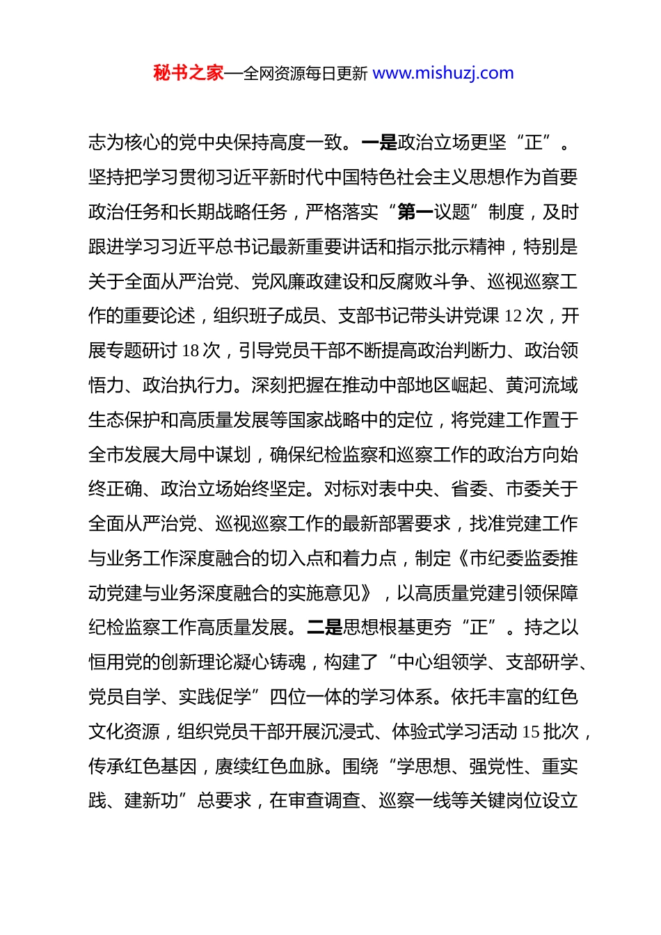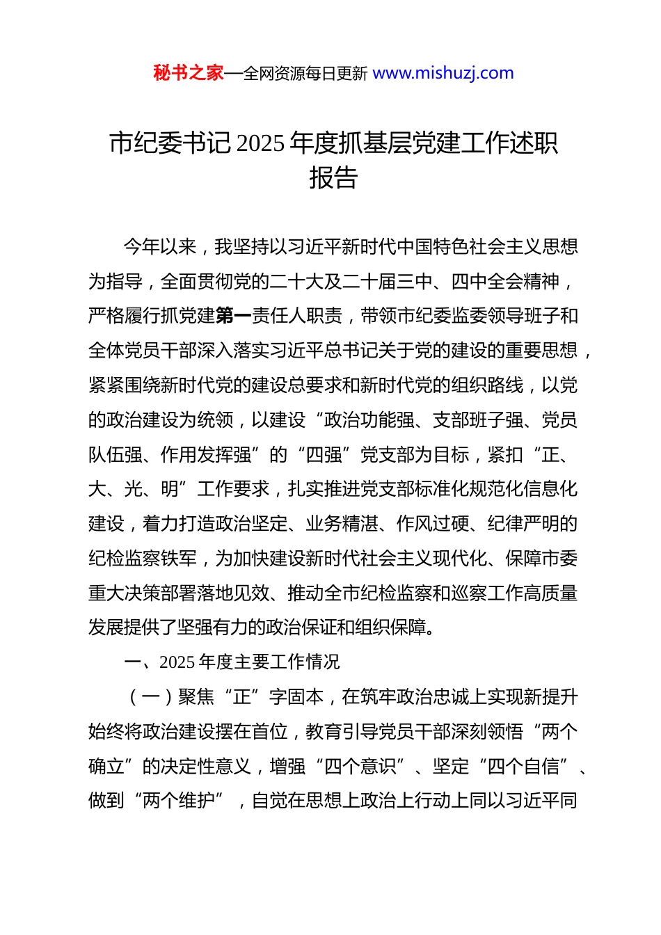 秘书之家—全网资源每日更新 www.mishuzj.com市纪委书记 2025 年度抓基层党建工作述职报告 今年以来,我坚持以习近平新时代中国特色社会主义思想为指导,全面贯彻党的二十大及二十届三中、四中全会精神,严格履行抓党建第一责任人职责,带领市纪委监委领导班子和全体党员干部深入落实习近平总书记关于党的建设的重要思想,紧紧围绕新时代党的建设总要求和新时代党的组织路线,以党的政治建设为统领,以建设“政治功能强、支部班子强、党员队伍强、作用发挥强”的“四强”党支部为目标,紧扣“正、大、光、明”工作要求,扎实推进党支部标准化规范化信息化建设,着力打造政治坚定、业务精湛、作风过硬、纪律严明的纪检监察铁军,为加快建设新时代社会主义现代化、保障市委重大决策部署落地见效、推动全市纪检监察和巡察工作高质量发展提供了坚强有力的政治保证和组织保障。一、2025 年度主要工作情况(一)聚焦“正”字固本,在筑牢政治忠诚上实现新提升始终将政治建设摆在首位,教育引导党员干部深刻领悟“两个确立”的决定性意义,增强“四个意识”、坚定“四个自信”、做到“两个维护”,自觉在思想上政治上行动上同以习近平同秘书之家—全网资源每日更新 www.mishuzj.com志为核心的党中央保持高度一致。一是政治立场更坚“正”。坚持把学习贯彻习近平新时代中国特色社会主义思想作为首要政治任务和长期战略任务,严格落实“第一议题”制度,及时跟进学习习近平总书记最新重要讲话和指示批示精神,特别是关于全面从严治党、党风廉政建设和反腐败斗争、巡视巡察工作的重要论述,组织班子成员、支部书记带头讲党课 12 次,开展专题研讨 18 次,引导党员干部不断提高政治判断力、政治领悟力、政治执行力。深刻把握在推动中部地区崛起、黄河流域生态保护和高质量发展等国家战略中的定位,将党建工作置于全市发展大局中谋划,确保纪检监察和巡察工作的政治方向始终正确、政治立场始终坚定。对标对表中央、省委、市委关于全面从严治党、巡视巡察工作的最新部署要求,找准党建工作与业务工作深度融合的切入点和着力点,制定《市纪委监委推动党建与业务深度融合的实施意见》,以高质量党建引领保障纪检监察工作高质量发展。二是思想根基更夯“正”。持之以恒用党的创新理论凝心铸魂,构建了“中心组领学、支部研学、党员自学、实践促学”四位一体的学习体系。依托丰富的红色文化资源,组织党员干部开展沉浸式、体验式学习活动 15 批次,传承红色基因,赓续红色血脉。围绕“学思想、强党性、重实践、建新功”总要求,在审查调查、巡察一线等关键岗位设立秘书之家—全网资源每日更新 www.mishuzj.com“理论学习小组”,结合案件查办、巡察发现的突出问题,开展案例式、研讨式学习,引导党员干部在履职实践中深化对党的创新理论的理解和运用。教育引导巡察干部在开展工作时,坚持实事求是、客观公正,发扬斗争精神,增强斗争本领,敢于动真碰硬,精准发现问题、反映问题、推动解决问题,确保巡察工作经得起实践、人民和历史的检验。三是前进方向更把“正”。旗帜鲜明坚持和加强党的全面领导,坚决维护党中央权威和集中统一领导。在谋划和推进巡察工作时,始终聚焦“国之大者”,紧盯党中央重大决策部署、习近平总书记重要指示要求在的贯彻落实情况,紧盯省委“两个确保”、“十大战略”和市委“16136”总体工作思路的实施推进情况开展政治监督。教育引导党员干部深刻认识中国特色社会主义道路的历史必然性和科学真理性,自觉抵制各种错误思潮侵蚀,确保在任何时候、任何情况下都保持清醒头脑,不为杂音噪音所扰,不为错误思潮所惑,坚定不移走中国特色社会主义道路,确保巡察利剑永不蒙尘、震慑常在。(二)聚焦“大”字谋篇,在服务中心大局上展现新作为树立大抓基层的鲜明导向,推动党建工作格局从“围绕中心”向“融入中心、引领中心”转变,以党建引领凝聚服务保障高质量发展的磅礴力量。一是服务大局显“大”格局。坚持党建秘书之家—全网资源每日更新 www.mishuzj.com工作服务保障“国之大者”、“省之要者”、“市之重者”。紧紧围绕黄河流域生态保护和高质量发展、郑...