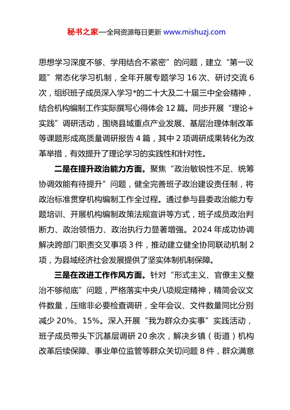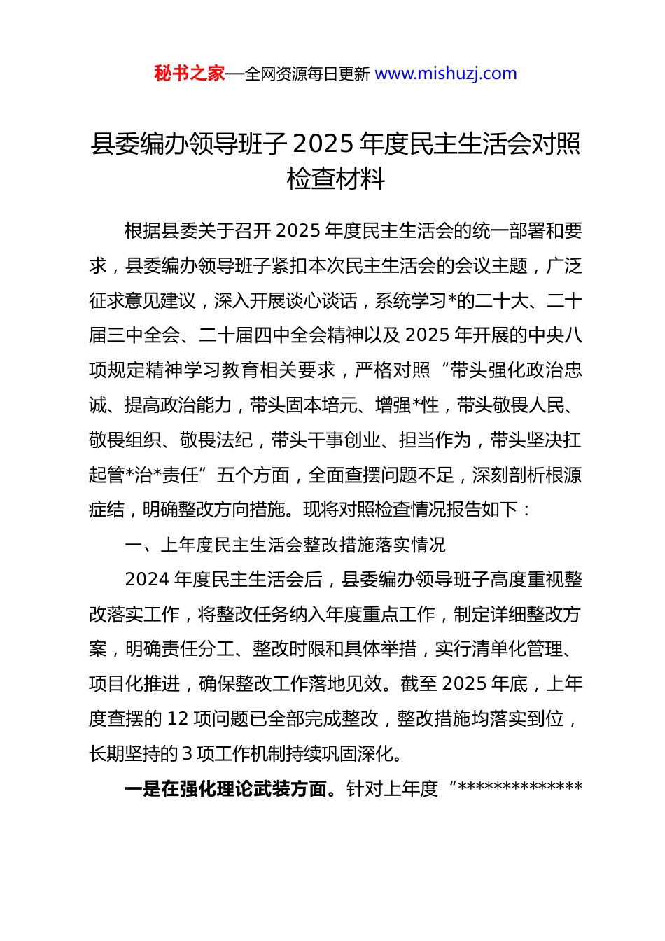 秘书之家—全网资源每日更新 www.mishuzj.com县委编办领导班子 2025 年度民主生活会对照检查材料根据县委关于召开 2025 年度民主生活会的统一部署和要求,县委编办领导班子紧扣本次民主生活会的会议主题,广泛征求意见建议,深入开展谈心谈话,系统学习*的二十大、二十届三中全会、二十届四中全会精神以及 2025 年开展的中央八项规定精神学习教育相关要求,严格对照“带头强化政治忠诚、提高政治能力,带头固本培元、增强*性,带头敬畏人民、敬畏组织、敬畏法纪,带头干事创业、担当作为,带头坚决扛起管*治*责任”五个方面,全面查摆问题不足,深刻剖析根源症结,明确整改方向措施。现将对照检查情况报告如下:一、上年度民主生活会整改措施落实情况2024 年度民主生活会后,县委编办领导班子高度重视整改落实工作,将整改任务纳入年度重点工作,制定详细整改方案,明确责任分工、整改时限和具体举措,实行清单化管理、项目化推进,确保整改工作落地见效。截至 2025 年底,上年度查摆的 12 项问题已全部完成整改,整改措施均落实到位,长期坚持的 3 项工作机制持续巩固深化。一是在强化理论武装方面。针对上年度“**************秘书之家—全网资源每日更新 www.mishuzj.com思想学习深度不够、学用结合不紧密”的问题,建立“第一议题”常态化学习机制,全年开展专题学习 16 次、研讨交流 6次,组织班子成员深入学习*的二十大及二十届三中全会精神,结合机构编制工作实际撰写心得体会 12 篇。同步开展“理论+实践”调研活动,围绕县域重点产业发展、基层治理体制改革等课题形成高质量调研报告 4 篇,其中 2 项调研成果转化为改革举措,有效提升了理论学习的实践性和针对性。二是在提升政治能力方面。聚焦“政治敏锐性不足、统筹协调效能有待提升”问题,健全完善班子政治建设责任制,将政治标准贯穿机构编制工作全过程。通过参与县委政治能力专题培训、开展机构编制政策法规宣讲等方式,班子成员政治判断力、政治领悟力、政治执行力显著增强。2024 年成功协调解决跨部门职责交叉事项 3 件,推动建立健全协同联动机制 2项,为县域经济社会发展提供了坚实体制机制保障。三是在改进工作作风方面。针对“形式主义、官僚主义整治不够彻底”问题,严格落实中央八项规定精神,精简会议文件数量,压缩非必要检查调研,全年会议、文件数量同比分别减少 20%、15%。深入开展“我为群众办实事”实践活动,班子成员带头下沉基层调研 20 余次,解决乡镇(街道)机构改革后续保障、事业单位监管等群众关切问题 8 件,群众满意秘书之家—全网资源每日更新 www.mishuzj.com度较上年提升 12 个百分点。四是在推动担当作为方面。围绕“改革创新力度不足、难点工作推进缓慢”问题,成立重点改革攻坚专班,由班子成员牵头推进事业单位分类改革、基层执法队伍整合等难点任务。2024 年顺利完成 15 家事业单位分类调整,整合组建 3 支基层综合执法队伍,相关改革经验被市委编办通报推广。同时,建立工作台账销号制度,对重点任务实行周调度、月通报,确保各项工作落地见效。五是在从严管*治*方面。针对“*风廉政建设责任制落实不够严实、监督提醒不够到位”问题,修订完善《县委编办*风廉政建设责任清单》,班子成员认真履行“一岗双责”,开展廉政谈话 15 人次,组织观看警示教育片 4 部,参观廉政教育基地 2 次。健全内部监督机制,对机构编制审批、人员调整等关键环节实行全程监督,全年未发生违纪违法问题,营造了风清气正的政治生态。总体来看,上年度整改工作取得了阶段性成效,但对照*的二十届四中全会精神和新时代机构编制工作要求,仍存在部分整改成果巩固不够扎实、长效机制建设有待进一步完善等问题,需要在本次整改中持续深化提升。二、存在的问题和不足秘书之家—全网资源每日更新 www.mishuzj.com围绕会议主题和五个对照检查方面,结合征求意见建议和谈心谈话情况,县委编办领导班子经全面查摆,主要存在以下问题和不足:(一)在带头强化政治忠诚、提高政治能力方面一是理论学习的系统性和深度不足。虽然能够坚持常态化学习**************...