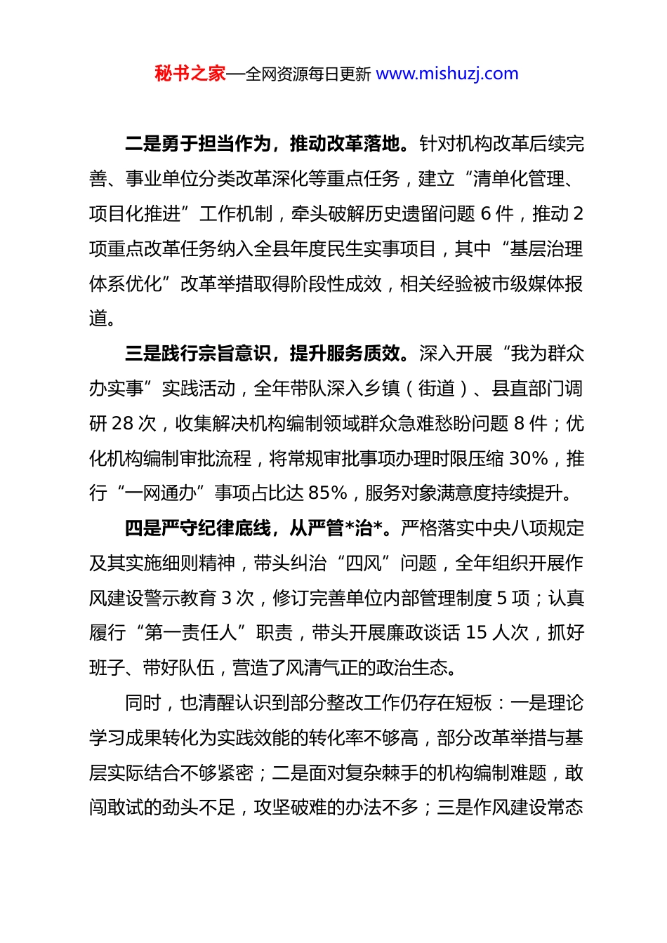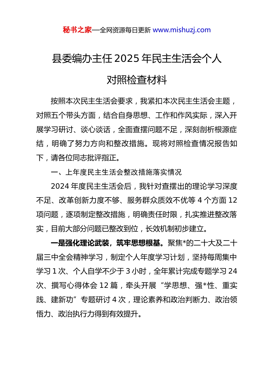 秘书之家—全网资源每日更新 www.mishuzj.com县委编办主任 2025 年民主生活会个人对照检查材料按照本次民主生活会要求,我紧扣本次民主生活会主题,对照五个带头方面,结合自身思想、工作和作风实际,深入开展学习研讨、谈心谈话,全面查摆问题不足,深刻剖析根源症结,明确了努力方向和整改措施。现将对照检查情况报告如下,请各位同志批评指正。一、上年度民主生活会整改措施落实情况2024 年度民主生活会后,我针对查摆出的理论学习深度不足、改革创新力度不够、服务群众质效不优等 4 个方面 12项问题,逐项制定整改措施,明确责任时限,扎实推进整改落实,目前大部分问题已整改到位,长效机制初步建立。一是强化理论武装,筑牢思想根基。聚焦*的二十大及二十届三中全会精神学习,制定个人年度学习计划,坚持每周集中学习 1 次、个人自学不少于 3 小时,全年累计完成专题学习 24次、撰写心得体会 12 篇,牵头开展“学思想、强*性、重实践、建新功”专题研讨 4 次,理论素养和政治判断力、政治领悟力、政治执行力得到有效提升。秘书之家—全网资源每日更新 www.mishuzj.com二是勇于担当作为,推动改革落地。针对机构改革后续完善、事业单位分类改革深化等重点任务,建立“清单化管理、项目化推进”工作机制,牵头破解历史遗留问题 6 件,推动 2项重点改革任务纳入全县年度民生实事项目,其中“基层治理体系优化”改革举措取得阶段性成效,相关经验被市级媒体报道。三是践行宗旨意识,提升服务质效。深入开展“我为群众办实事”实践活动,全年带队深入乡镇(街道)、县直部门调研 28 次,收集解决机构编制领域群众急难愁盼问题 8 件;优化机构编制审批流程,将常规审批事项办理时限压缩 30%,推行“一网通办”事项占比达 85%,服务对象满意度持续提升。四是严守纪律底线,从严管*治*。严格落实中央八项规定及其实施细则精神,带头纠治“四风”问题,全年组织开展作风建设警示教育 3 次,修订完善单位内部管理制度 5 项;认真履行“第一责任人”职责,带头开展廉政谈话 15 人次,抓好班子、带好队伍,营造了风清气正的政治生态。同时,也清醒认识到部分整改工作仍存在短板:一是理论学习成果转化为实践效能的转化率不够高,部分改革举措与基层实际结合不够紧密;二是面对复杂棘手的机构编制难题,敢闯敢试的劲头不足,攻坚破难的办法不多;三是作风建设常态秘书之家—全网资源每日更新 www.mishuzj.com化长效化机制仍需进一步健全,对干部日常监督管理的精准性有待提升。下一步,将持续抓好整改落实,不断巩固拓展整改成效。二、存在的问题和不足(一)在带头强化政治忠诚、提高政治能力方面一是政治理论学习的系统性深度不足。对**************思想的学习存在“碎片化”“浅表化”现象,特别是对*的二十大、二十届三中全会、二十届四中全会精神中关于机构编制工作的新部署新要求,学习不够深入、领悟不够透彻。在学习二十届四中全会审议通过的《中共中央关于制定国民经济和社会发展第十五个五年规划的建议》时,仅满足于通读原文,对其中“推进国家治理体系和治理能力现代化”“健全全面从严治*体系”等重要论述与机构编制工作的内在联系研究不深,未能完全做到融会贯通、学以致用。2025 年开展的中央八项规定精神学习教育中,存在重形式、轻实效的倾向,对******关于加强*的作风建设的重要论述学习不够系统,结合机构编制工作实际谋划落实举措不够精准。二是政治能力与履职要求存在差距。面对新形势下机构编制工作的新挑战新任务,政治判断力有待进一步提升,对一些工作中潜在的政治风险敏感性不强,未能及时从政治高度分析秘书之家—全网资源每日更新 www.mishuzj.com研判、统筹应对。在推进跨部门、跨领域机构改革协调工作中,有时过多关注业务层面的衔接,对改革背后的政治意义和深远影响把握不够到位,导致部分改革举措推进力度不足、落实效果不及预期。政治执行力不够强,对*中央关于机构编制工作的决策部署和省、市、县委的工作要求,有时存在“等靠要”思想,主动担当、积极作为的劲头不足,未能完全以“时时放心不下”的责任感推动工...
