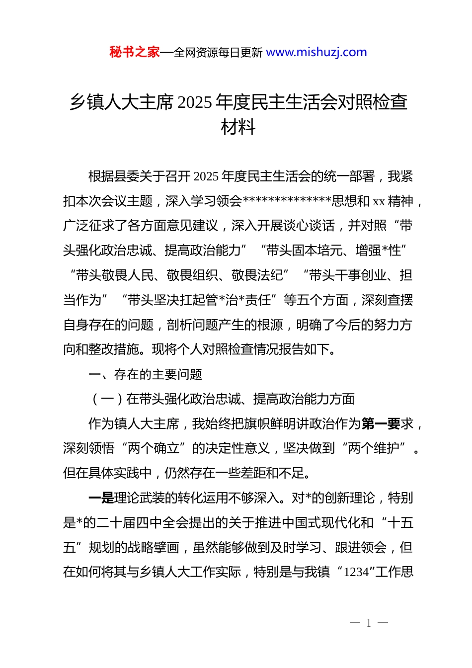 秘书之家—全网资源每日更新 www.mishuzj.com乡镇人大主席 2025 年度民主生活会对照检查材料根据县委关于召开 2025 年度民主生活会的统一部署,我紧扣本次会议主题,深入学习领会**************思想和 xx 精神,广泛征求了各方面意见建议,深入开展谈心谈话,并对照“带头强化政治忠诚、提高政治能力”“带头固本培元、增强*性”“带头敬畏人民、敬畏组织、敬畏法纪”“带头干事创业、担当作为”“带头坚决扛起管*治*责任”等五个方面,深刻查摆自身存在的问题,剖析问题产生的根源,明确了今后的努力方向和整改措施。现将个人对照检查情况报告如下。一、存在的主要问题(一)在带头强化政治忠诚、提高政治能力方面作为镇人大主席,我始终把旗帜鲜明讲政治作为第一要求,深刻领悟“两个确立”的决定性意义,坚决做到“两个维护”。但在具体实践中,仍然存在一些差距和不足。一是理论武装的转化运用不够深入。对*的创新理论,特别是*的二十届四中全会提出的关于推进中国式现代化和“十五五”规划的战略擘画,虽然能够做到及时学习、跟进领会,但在如何将其与乡镇人大工作实际,特别是与我镇“1234”工作思— 1 —秘书之家—全网资源每日更新 www.mishuzj.com路紧密结合上,思考得不够深、研究得不够透。有时满足于学过了、知道了,但在将宏观的顶层设计转化为推动*镇人大工作高质量发展的具体路径和有效抓手上,缺乏系统性的谋划和创造性的落实。例如,在思考如何通过人大监督职能保障“十五五”规划在我镇顺利开局时,所提出的监督方案仍偏向于传统的听取报告、组织视察等方式,对于如何运用法治思维和创新手段进行前瞻性、嵌入式监督,思考谋划尚显不足。二是在复杂局面中保持政治定力的敏锐性有待增强。在处理一些涉及多方利益的复杂问题时,政治判断力、政治领悟力、政治执行力尚需锤炼。我主抓的“万亩茶叶”项目是镇里的重点产业,在项目推进初期,面对部分群众因土地流转补偿标准、茶苗后续管护等问题产生的疑虑和观望情绪时,我一度将工作重心更多地放在了强调项目对全镇经济发展的战略意义和尽快完成指标任务上,对于群众诉求背后可能蕴含的社会稳定风险和社会公平问题,政治敏锐性不够强。未能第一时间从巩固*的执政基础、维护人民根本利益的政治高度去审视和化解矛盾,而是更多地运用了行政方法和经济手段去推动,导致部分工作走了弯路,虽然最终解决了问题,但反映出我在运用政治眼光观察和分析实际问题上的火候还不够。三是政治执行力在打通“最后一公里”上存在短板。对中— 2 —秘书之家—全网资源每日更新 www.mishuzj.com央、省市县委和镇*委的决策部署,我能够做到坚决贯彻、令行禁止,但在推动这些决策在人大工作中落地生根、开花结果的全过程中,还存在跟踪问效不够紧、督促检查不够严的情况。例如,在推进“高质量发展,代表在行动”主题活动中,虽然年初制定了翔实的活动方案,也组织了多次集中活动但在推动代表小组和代表个人常态化、长效化履职上,抓得还不够实。有时满足于活动的场面和声势,对于代表们提出的意见建议是否真正得到承办单位的有效解决,后续的跟踪监督力度有所减弱,导致一些好的建议未能完全转化为推动发展的实际成效,政治执行的闭环未能完全形成。(二)在带头固本培元、增强*性方面我始终牢记自己的第一身份是共产*员,注重在严肃的*内政治生活中锤炼*性。但深刻反思,对照更高标准,仍有一些方面做得不到位。一是参加双重组织生活的角色定位偶有偏差。作为镇领导班子成员,能够严格执行双重组织生活制度,按时参加所在支部的“三会一课”和主题*日活动。但有时不自觉地带着“领导”的身份听取汇报、发表指导性意见较多,而以一名普通*员身份进行深刻的自我剖析、诚恳地听取他人批评意见做得不够。在支部组织生活会上,考虑到自己作为人大主席的身份,有时— 3 —秘书之家—全网资源每日更新 www.mishuzj.com发言会不自觉地多谈工作成绩、多讲客观理由,对自身思想深处的问题触及不够,自我批评的“辣味”不足,在一定程度上影响了组织生活的政治性、时代性、原则性、战斗性。二是在践行初心使命的恒心韧劲上有所松懈...
