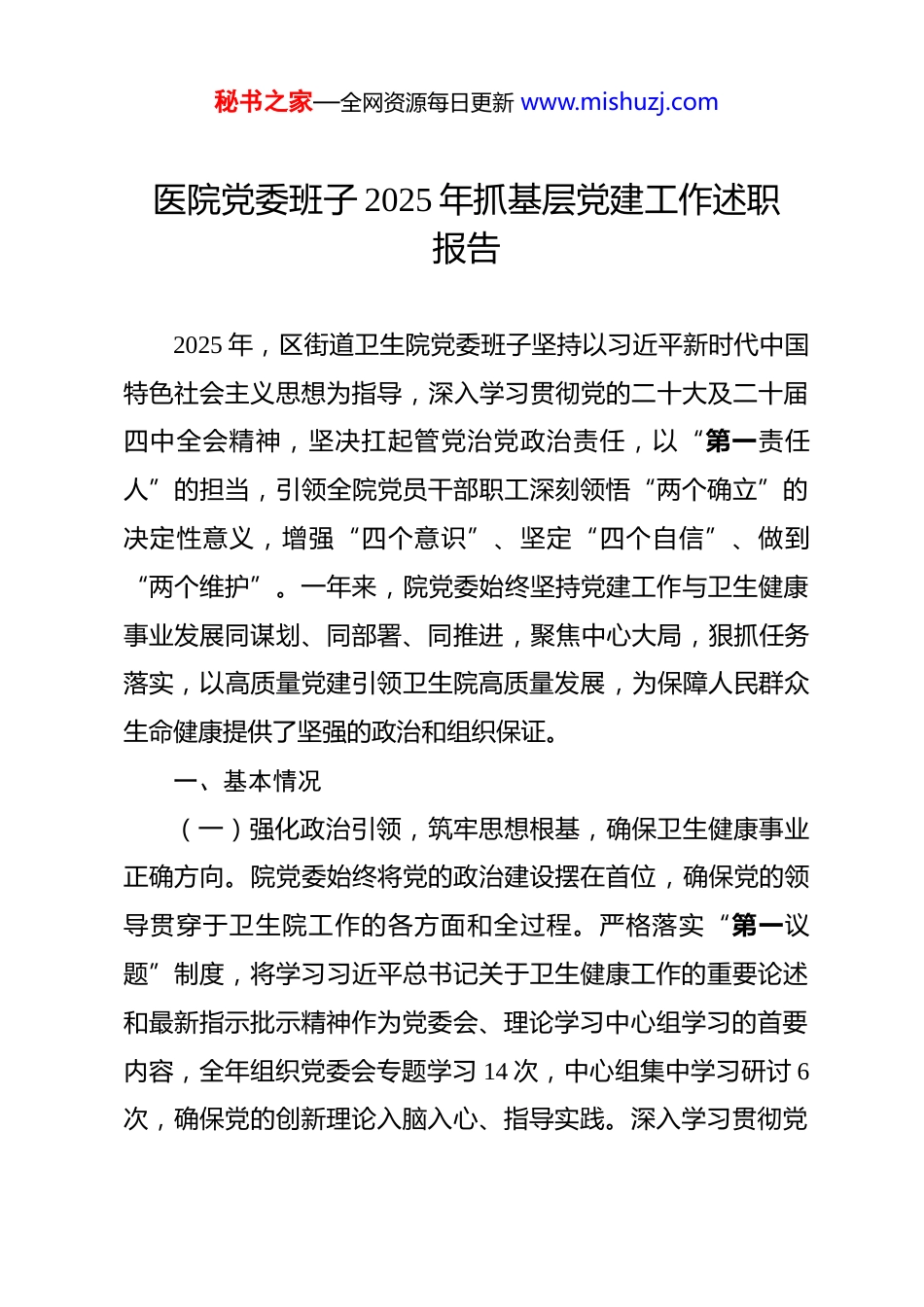 秘书之家—全网资源每日更新 www.mishuzj.com医院党委班子 2025 年抓基层党建工作述职报告 2025 年,区街道卫生院党委班子坚持以习近平新时代中国特色社会主义思想为指导,深入学习贯彻党的二十大及二十届四中全会精神,坚决扛起管党治党政治责任,以“第一责任人”的担当,引领全院党员干部职工深刻领悟“两个确立”的决定性意义,增强“四个意识”、坚定“四个自信”、做到“两个维护”。一年来,院党委始终坚持党建工作与卫生健康事业发展同谋划、同部署、同推进,聚焦中心大局,狠抓任务落实,以高质量党建引领卫生院高质量发展,为保障人民群众生命健康提供了坚强的政治和组织保证。一、基本情况(一)强化政治引领,筑牢思想根基,确保卫生健康事业正确方向。院党委始终将党的政治建设摆在首位,确保党的领导贯穿于卫生院工作的各方面和全过程。严格落实“第一议题”制度,将学习习近平总书记关于卫生健康工作的重要论述和最新指示批示精神作为党委会、理论学习中心组学习的首要内容,全年组织党委会专题学习 14 次,中心组集中学习研讨 6次,确保党的创新理论入脑入心、指导实践。深入学习贯彻党秘书之家—全网资源每日更新 www.mishuzj.com的二十届四中全会精神,组织专题学习班 2 期,班子成员带头撰写心得体会与理论文章 4 篇,引导全院党员干部准确把握精神实质与核心要义,自觉将思想和行动统一到中央决策部署上来,确保卫生院各项工作始终沿着正确的政治方向前进。在意识形态领域,严格落实意识形态工作责任制,定期分析研判舆情风险,加强对院内宣传栏、微信公众号等阵地的管理,全年未发生重大意识形态事件,牢牢掌握了意识形态工作领导权。(二)聚焦中心大局,服务保障“4+1”部署,推动党建与业务深度融合。院党委坚持围绕中心、服务大局,找准党建工作与业务工作的结合点。为有力服务保障区域健康“4+1”部署,即聚焦老年人、妇女儿童、慢性病患者、传染病高风险人群等“四类重点人群”的健康管理,强化家庭医生签约服务这“一个核心支撑”,院党委创新实施“党建引领、健康护航”书记项目。具体工作中,设立“党员先锋岗”15 个,覆盖预防接种、慢病管理、家庭医生签约等关键服务窗口,党员佩戴党徽上岗,亮身份、树形象、作表率。在 2025 年秋冬季流感防控工作中,组建由 12 名党员骨干组成的“党员突击队”,深入社区、学校开展健康宣讲和疫苗接种服务,累计服务群众超过 5000 人次。通过党建引领,有效激发了业务骨干的先锋模范作用。党员家庭医生张同志,在得知其签约的一位 85 岁独居老人连续两天未秘书之家—全网资源每日更新 www.mishuzj.com接电话后,利用休息时间主动上门探视,及时发现其因突发脑梗卧床不起,并协助呼叫“120”急救,为抢救赢得了宝贵时间,其事迹在群众中广为流传,生动诠释了共产党员全心全意为人民服务的宗旨。在党组织的坚强领导和党员的模范带动下2025 年我院家庭医生签约率达到 42%,重点人群签约覆盖率超过 75%,慢病规范管理率提升了 5 个百分点,党建与业务融合发展的成效显著。(三)夯实组织基础,严肃正风肃纪,营造风清气正的政治生态。院党委坚持大抓基层的鲜明导向,着力提升党支部标准化、规范化建设水平。严格规范“三会一课”、组织生活会、民主评议党员等党内政治生活制度,全年指导 5 个党支部召开党员大会 20 次,支委会 60 次,讲授专题党课 22 次。精心组织主题党日活动,每月确定一个与医疗服务、医德医风、健康科普相关的主题,如“医者仁心、服务于民”“守护生命、‘救’在身边”等,全年开展主题党日活动 12 次,参与党员达350 余人次,增强了活动的政治性、时代性和实效性。党员发展工作坚持政治标准,2025 年发展新党员 2 名,培养入党积极分子 3 名,优化了党员队伍结构。将深入贯彻中央八项规定精神学习教育作为一项重大政治任务常抓不懈,纳入党委理论学习中心组和党支部“三会一课”的必学内容。全年组织专题学秘书之家—全网资源每日更新 www.mishuzj.com习 4 次,集中观看了《持续发力纵深推进》等警示教育片,并就中央纪委国家监委通报的医疗...