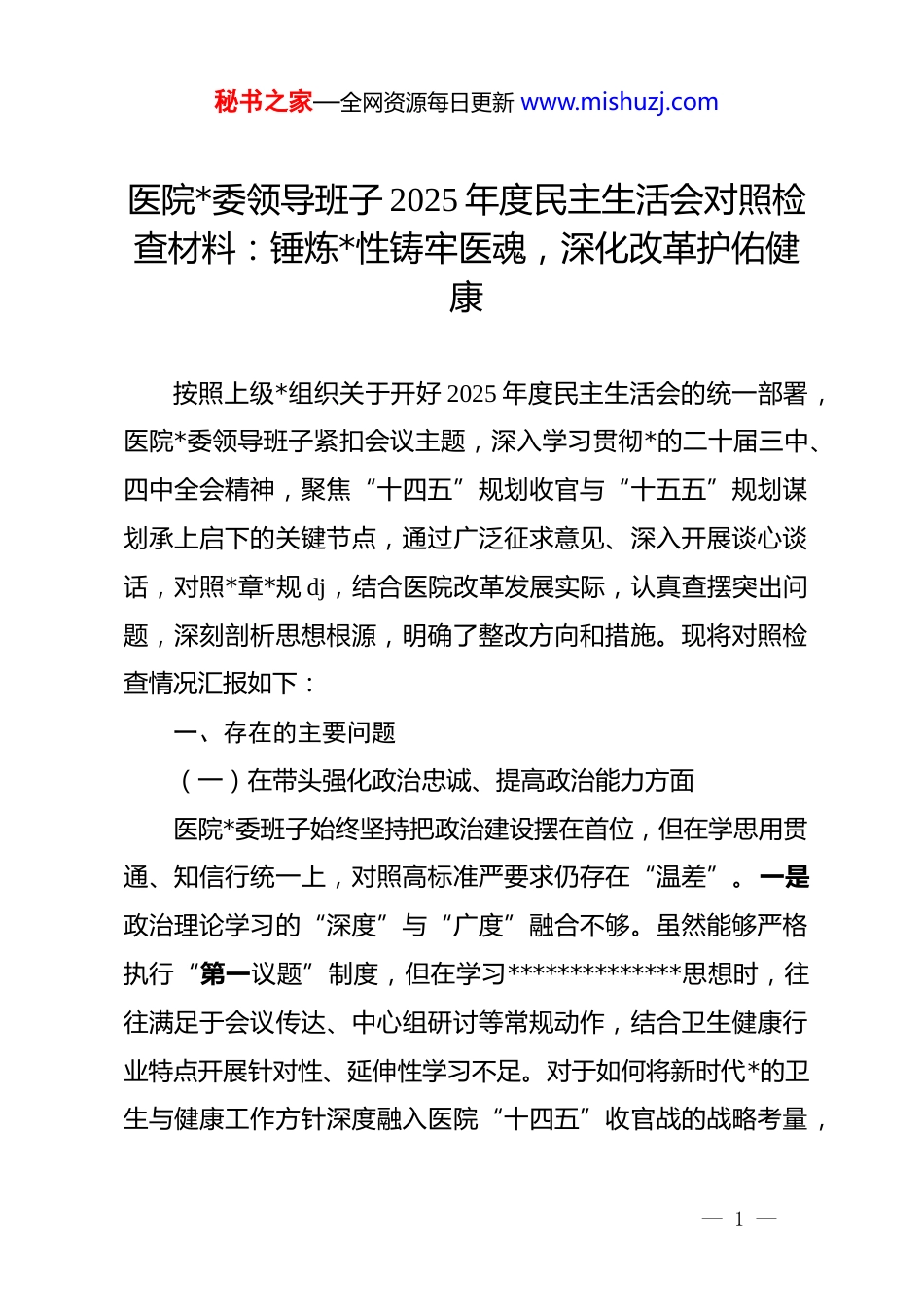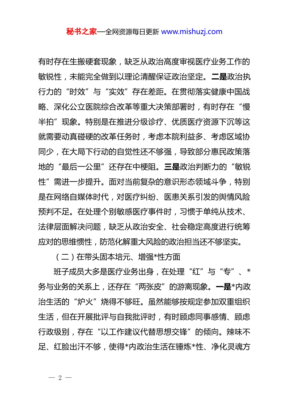 秘书之家—全网资源每日更新 www.mishuzj.com医院*委领导班子 2025 年度民主生活会对照检查材料:锤炼*性铸牢医魂,深化改革护佑健康按照上级*组织关于开好 2025 年度民主生活会的统一部署,医院*委领导班子紧扣会议主题,深入学习贯彻*的二十届三中、四中全会精神,聚焦“十四五”规划收官与“十五五”规划谋划承上启下的关键节点,通过广泛征求意见、深入开展谈心谈话,对照*章*规 dj,结合医院改革发展实际,认真查摆突出问题,深刻剖析思想根源,明确了整改方向和措施。现将对照检查情况汇报如下:一、存在的主要问题(一)在带头强化政治忠诚、提高政治能力方面医院*委班子始终坚持把政治建设摆在首位,但在学思用贯通、知信行统一上,对照高标准严要求仍存在“温差”。一是政治理论学习的“深度”与“广度”融合不够。虽然能够严格执行“第一议题”制度,但在学习**************思想时,往往满足于会议传达、中心组研讨等常规动作,结合卫生健康行业特点开展针对性、延伸性学习不足。对于如何将新时代*的卫生与健康工作方针深度融入医院“十四五”收官战的战略考量,— 1 —秘书之家—全网资源每日更新 www.mishuzj.com有时存在生搬硬套现象,缺乏从政治高度审视医疗业务工作的敏锐性,未能完全做到以理论清醒保证政治坚定。二是政治执行力的“时效”与“实效”存在差距。在贯彻落实健康中国战略、深化公立医院综合改革等重大决策部署时,有时存在“慢半拍”现象。特别是在推进分级诊疗、优质医疗资源下沉等这就需要动真碰硬的改革任务时,考虑本院利益多、考虑区域协同少,在大局下行动的自觉性还不够强,导致部分惠民政策落地的“最后一公里”还存在中梗阻。三是政治判断力的“敏锐性”需进一步提升。面对当前复杂的意识形态领域斗争,特别是在网络自媒体时代,对医疗纠纷、医患关系引发的舆情风险预判不足。在处理个别敏感医疗事件时,习惯于单纯从技术、法律层面解决问题,缺乏从政治安全、社会稳定高度进行统筹应对的思维惯性,防范化解重大风险的政治担当还不够坚实。(二)在带头固本培元、增强*性方面班子成员大多是医疗业务出身,在处理“红”与“专”、*务与业务的关系上,还存在“两张皮”的游离现象。一是*内政治生活的“炉火”烧得不够旺。虽然能够按规定参加双重组织生活,但在开展批评与自我批评时,有时顾虑同事感情、顾虑行政级别,存在“以工作建议代替思想交锋”的倾向。辣味不足、红脸出汗不够,使得*内政治生活在锤炼*性、净化灵魂方— 2 —秘书之家—全网资源每日更新 www.mishuzj.com面的熔炉作用发挥不充分,距离“触及灵魂、洗涤灰尘”的要求还有差距。二是 dj 与业务融合的“切口”找得不准。在推进“双带头人”培育工程中,部分临床医技*支部存在“*务边缘化”问题,支部书记抓 dj 的内生动力不足,习惯于把业务指标作为硬杠杠,把 dj 工作当作软任务。在将*性教育融入医德医风建设、学科带头人培养等核心业务链条上,缺乏创新性的载体和抓手,导致 dj 工作对业务发展的引领力、渗透力不够强。三是理想信念教育的“触感”不够强。对于*员干部的思想教育,习惯于传统的灌输式、听课式模式,缺乏互动式、沉浸式的教育体验。特别是在高知群体*员发展和教育管理上,针对知识分子特点开展的思想政治工作不够细腻,如何在市场经济大潮中引导医务人员坚守职业信仰、抵御逐利冲动,还缺乏行之有效的长效机制,部分*员干部的先锋模范作用在日常工作中体现得不够鲜明。(三)在带头敬畏人民、敬畏组织、敬畏法纪方面班子在坚守底线思维、践行宗旨意识方面总体较好,但在细节管理和深层整治上还存在“盲区”和“软肋”。一是“以患者为中心”的服务理念尚未完全转化为就医体验的实质改善。虽然近年来医院大力推行智慧医疗,但针对老年患者、急危重症患者等特殊群体的“数字鸿沟”问题解决得不够彻底。门诊— 3 —秘书之家—全网资源每日更新 www.mishuzj.com“三长一短”(挂号、候诊、收费队伍长,看病时间短)的顽疾在高峰时段依然存在,部分科室在优化服务流程时,更多是从方便管理的角度出发,而非从方便患者的角度考虑,导致群...