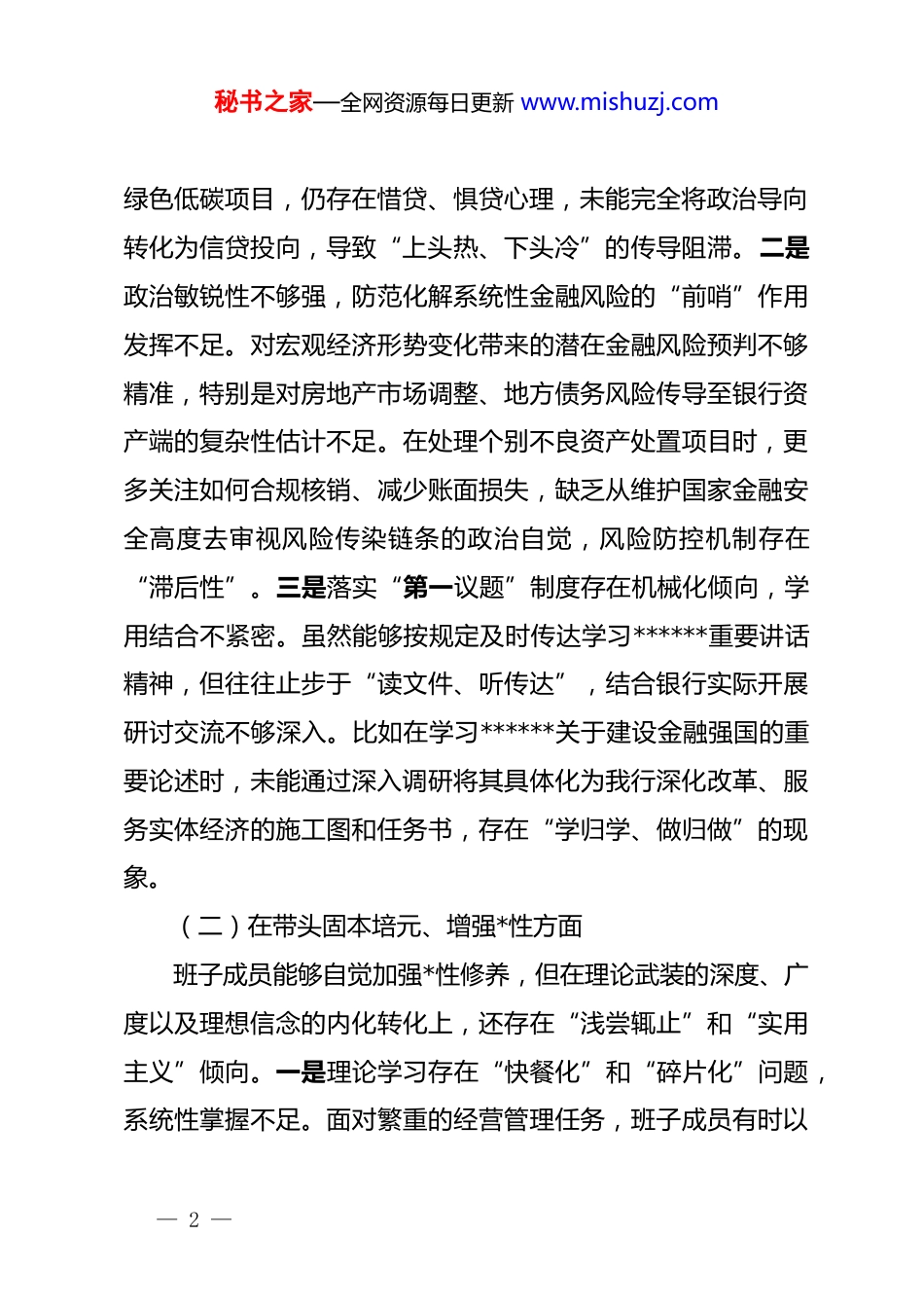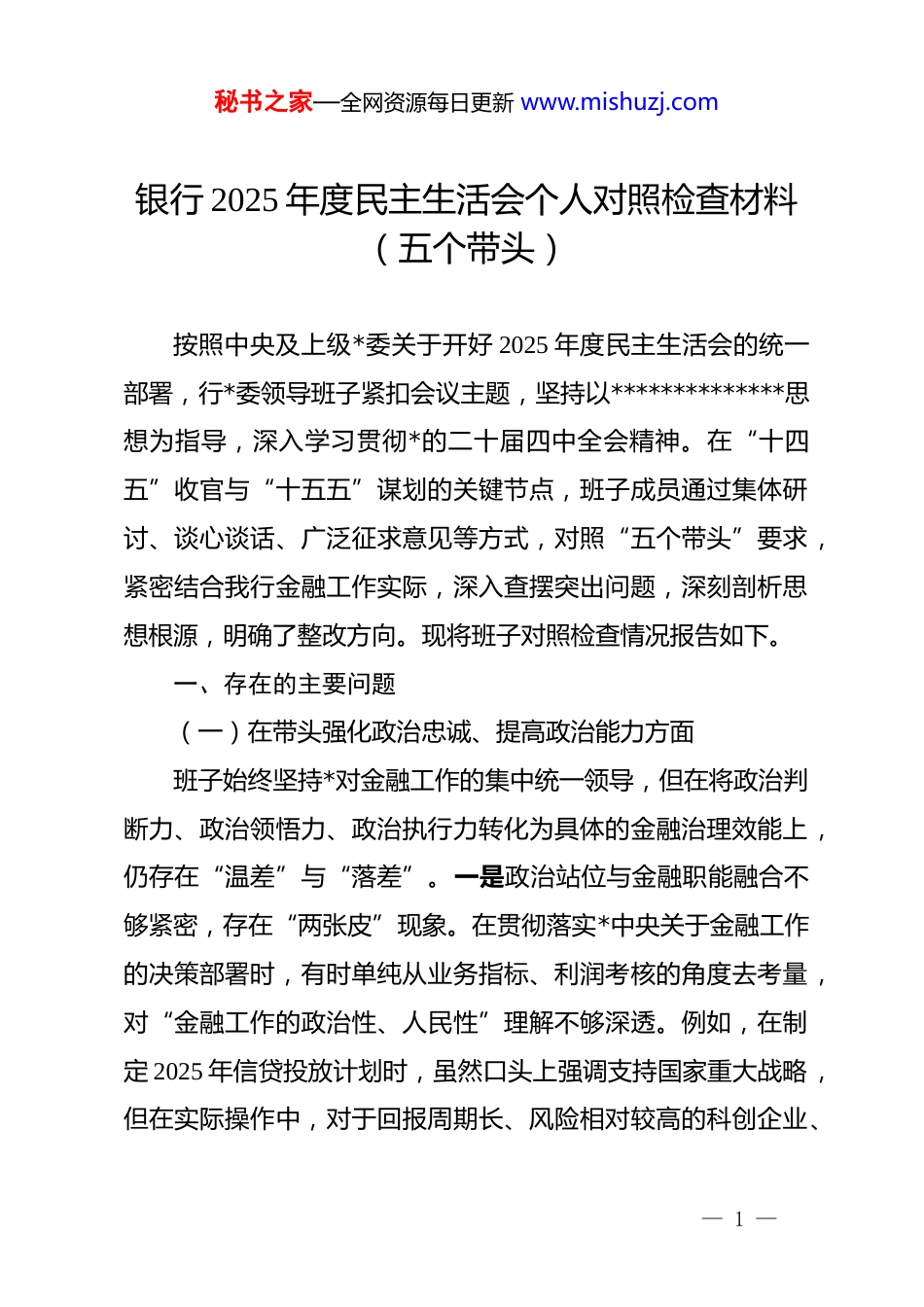 秘书之家—全网资源每日更新 www.mishuzj.com银行 2025 年度民主生活会个人对照检查材料(五个带头)按照中央及上级*委关于开好 2025 年度民主生活会的统一部署,行*委领导班子紧扣会议主题,坚持以**************思想为指导,深入学习贯彻*的二十届四中全会精神。在“十四五”收官与“十五五”谋划的关键节点,班子成员通过集体研讨、谈心谈话、广泛征求意见等方式,对照“五个带头”要求,紧密结合我行金融工作实际,深入查摆突出问题,深刻剖析思想根源,明确了整改方向。现将班子对照检查情况报告如下。一、存在的主要问题(一)在带头强化政治忠诚、提高政治能力方面班子始终坚持*对金融工作的集中统一领导,但在将政治判断力、政治领悟力、政治执行力转化为具体的金融治理效能上,仍存在“温差”与“落差”。一是政治站位与金融职能融合不够紧密,存在“两张皮”现象。在贯彻落实*中央关于金融工作的决策部署时,有时单纯从业务指标、利润考核的角度去考量,对“金融工作的政治性、人民性”理解不够深透。例如,在制定 2025 年信贷投放计划时,虽然口头上强调支持国家重大战略,但在实际操作中,对于回报周期长、风险相对较高的科创企业、— 1 —秘书之家—全网资源每日更新 www.mishuzj.com绿色低碳项目,仍存在惜贷、惧贷心理,未能完全将政治导向转化为信贷投向,导致“上头热、下头冷”的传导阻滞。二是政治敏锐性不够强,防范化解系统性金融风险的“前哨”作用发挥不足。对宏观经济形势变化带来的潜在金融风险预判不够精准,特别是对房地产市场调整、地方债务风险传导至银行资产端的复杂性估计不足。在处理个别不良资产处置项目时,更多关注如何合规核销、减少账面损失,缺乏从维护国家金融安全高度去审视风险传染链条的政治自觉,风险防控机制存在“滞后性”。三是落实“第一议题”制度存在机械化倾向,学用结合不紧密。虽然能够按规定及时传达学习******重要讲话精神,但往往止步于“读文件、听传达”,结合银行实际开展研讨交流不够深入。比如在学习******关于建设金融强国的重要论述时,未能通过深入调研将其具体化为我行深化改革、服务实体经济的施工图和任务书,存在“学归学、做归做”的现象。(二)在带头固本培元、增强*性方面班子成员能够自觉加强*性修养,但在理论武装的深度、广度以及理想信念的内化转化上,还存在“浅尝辄止”和“实用主义”倾向。一是理论学习存在“快餐化”和“碎片化”问题,系统性掌握不足。面对繁重的经营管理任务,班子成员有时以— 2 —秘书之家—全网资源每日更新 www.mishuzj.com干代学,对***经济思想的学习缺乏系统钻研,往往是急用先学、现用现学。例如,在谋划“十五五”规划前期研究时,对新质生产力的内涵外延理解不够精准,生搬硬套政策文件,缺乏运用马克思主义政治经济学基本原理分析金融市场波动、指导业务创新的能力,理论底主要不够厚实。二是*性锤炼存在“宽松软”现象,自我革命精神有所懈怠。部分班子成员随着*龄增长、职务提升,在思想深处产生了“守成心态”,习惯于听赞歌、看成绩,对自身*性修养的检视标准有所降低。在*内政治生活中,有时缺乏动真碰硬的勇气,开展批评与自我批评时顾虑较多,以工作建议代替思想交锋,未能真正触及灵魂深处,导致一些苗头性、倾向性问题未能及时通过*内监督机制得到纠正。三是弘扬优良传统有差距,艰苦奋斗精神有所淡化。面对日益激烈的银行业竞争和净息差收窄的经营压力,部分班子成员缺乏攻坚克难的韧劲,习惯于在舒适区开展工作。在落实过“紧日子”要求上,虽然压减了办公经费,但在信息化建设、网点装修等大额资本性支出项目中,仍存在追求“高大上”、贪大求洋的潜意识,未能完全做到精打细算、勤俭办行。(三)在带头敬畏人民、敬畏组织、敬畏法纪方面班子能够严守纪律底线,但在践行以人民为中心的发展思想、落实全面从严治*要求上,还存在“官本位”思想残留和— 3 —秘书之家—全网资源每日更新 www.mishuzj.com“形式主义”顽疾。一是普惠金融服务存在“精英导向”,服务基层群众有距离。在推动金融服务下沉过程中,虽然推出了多款普惠产品,但...