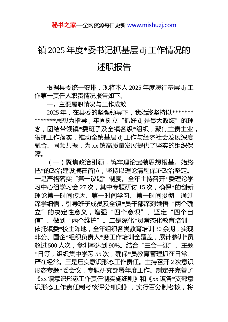 秘书之家—全网资源每日更新 www.mishuzj.com镇 2025 年度*委书记抓基层 dj 工作情况的述职报告根据县委统一安排,现将本人 2025 年度履行基层 dj 工作第一责任人职责情况报告如下。一、主要履职情况与工作成效2025 年,在县委的坚强领导下,我始终坚持以**************思想为指导,牢固树立“抓好 dj 是最大政绩”的理念,团结带领镇*委班子及全镇各级*组织,聚焦主责主业,狠抓工作落实,推动全镇基层 dj 工作与经济社会发展深度融合、同频共振,为 xx 镇高质量发展提供了坚实的组织保障。(一)聚焦政治引领,筑牢理论武装思想根基。始终把*的政治建设摆在首位,坚持以理论清醒保证政治坚定。一是严格落实“第一议题”制度。全年主持召开*委理论学习中心组学习会 27 次,其中专题研讨 15 次,确保*的创新理论第一时间传达、第一时间学习、第一时间贯彻。通过深学细悟,引导班子成员及全镇*员干部深刻领悟“两个确立”的决定性意义,增强“四个意识”、坚定“四个自信”、做到“两个维护”。二是深化*员常态化教育培训。依托镇委*校主阵地,全年组织各类教育培训 30 余期,实现非公、国企*组织负责人*务工作培训全覆盖,累计参训*员超过 500 人次,参训率达到 90%。结合“三会一课”、主题*日等,组织集中学习 55 次,确保*员教育管理抓在日常、严在经常。三是压实意识形态工作责任。主持召开 2 次意识形态专题*委会议,专题研究部署年度工作。制定并完善了《xx 镇意识形态工作责任制实施细则》和《xx 镇各*支部意识形态工作责任制考核评分细则》,实行百分制考核,将秘书之家—全网资源每日更新 www.mishuzj.com考核结果与*支部评优评先、干部绩效紧密挂钩,推动意识形态工作责任层层传导、落地生根。(二)聚焦固本强基,锻造坚强有力战斗堡垒。坚持大抓基层的鲜明导向,推动基层*组织全面进步、全面过硬。一是优化组织设置。根据发展需要,完善了*组织架构,确保*的组织和工作覆盖到全镇经济社会发展的最前沿。2025年,全镇计划发展*员 26 名,注重在青年、高学历群体和产业一线发展*员,持续优化*员队伍结构,为*组织注入新鲜血液。二是强化阵地建设。以*群服务中心为核心,深化凤岗社区近邻 dj 品牌,着力打造集“*群暖心驿站、高山公园广场、台青服务驿站、新时代文明实践所”于一体的 dj 创新矩阵,打通服务*员群众的“最后一公里”。三是严肃组织生活。严格执行“三会一课”、民主评议*员等制度,提升组织生活质量。创新开展“书记抓 dj·点上评”活动,通过现场观摩、随机提问、量化打分等方式,倒逼各*支部书记履职尽责,营造比学赶超的浓厚氛围。(三)聚焦中心大局,彰显 dj 引领发展实效。坚持围绕中心抓 dj、抓好 dj 促发展,把 dj 优势转化为发展优势。一是 dj 引领乡村振兴提质增效。大力推广“*支部+合作社+农户”发展模式,推动村级集体经济持续壮大。2024 年,全镇村集体经济总收益达到 xx 万元,23 个村收入均超过 20万元,其中 3 个村突破 xx 万元大关。通过发展肉牛养殖、天麻种植、生态旅游等特色产业,带动群众就业 800 余人,实现户均增收近万元。二是 dj 引领基层治理创新突破。在梨子水社区和鹿溪村先行试点,创新推出“负分制”治理模式。该模式以户为单位赋予 100 分基础分,围绕社会治安、移风易俗、环境卫生等五大领域 24 项行为制定负面清单,由“*员+乡贤+网格员”组成的评审委员会每月评议、每月公示。试点启动以来,346 户常住家庭参与率和知晓率均达100%,群众满意度达 98%,村容村貌显著改善,拆除残垣断壁 18 处,一套可复制、可推广的治理新经验基本形成,秘书之家—全网资源每日更新 www.mishuzj.com有效激发了基层治理的“源头活水”。三是 dj 引领重点项目攻坚克难。在重大项目一线设立“项目攻坚岗”,组织*员开展“一名*员一面旗”岗位建功比武工程,将项目推进实效与*员积分管理挂钩,激发*员干部在征地拆迁、招商引资等硬仗中担当作为、冲锋在前。(四)聚焦正风肃纪,营造风清气正政治生态。坚持把纪律和规矩挺在前面,推动全面从严治*向纵深发展。一...