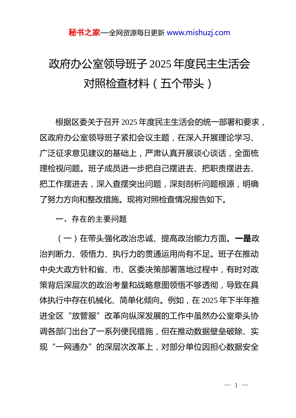 秘书之家—全网资源每日更新 www.mishuzj.com政府办公室领导班子 2025 年度民主生活会对照检查材料(五个带头)根据区委关于召开 2025 年度民主生活会的统一部署和要求,区政府办公室领导班子紧扣会议主题,在深入开展理论学习、广泛征求意见建议的基础上,严肃认真开展谈心谈话,全面梳理检视问题。班子成员进一步把自己摆进去、把职责摆进去、把工作摆进去,深入查摆突出问题,深刻剖析问题根源,明确了努力方向和整改措施。现将对照检查情况报告如下。一、存在的主要问题(一)在带头强化政治忠诚、提高政治能力方面。一是政治判断力、领悟力、执行力的贯通运用尚有不足。班子在推动中央大政方针和省、市、区委决策部署落地过程中,有时对政策背后深层次的政治考量和战略意图领悟不够透彻,导致在具体执行中存在机械化、简单化倾向。例如,在 2025 年下半年推进全区“放管服”改革向纵深发展的工作中虽然办公室牵头协调各部门出台了一系列便民措施,但在推动数据壁垒破除、实现“一网通办”的深层次改革上,对部分单位因担心数据安全— 1 —秘书之家—全网资源每日更新 www.mishuzj.com和责任划分而产生的畏难情绪和“中阻梗”现象,未能从优化全区整体政治生态和营商环境的更高站位进行预判和有力破解,导致个别高频服务事项的跨部门协同办理效率提升未达预期。二是应对复杂局面、防范化解风险的前瞻性有待增强。面对当前国内外环境的深刻变化,班子虽然能够保持战略定力,但在将底线思维和忧患意识融入日常工作的具体环节上还不够到位。对一些潜在的、苗头性的风险,有时存在“看一步走一步”的情况,缺乏“下先手棋、打主动仗”的敏锐性。比如,在 2025年初对全年经济社会发展态势进行分析研判时,虽然关注到了产业链供应链可能存在的风险点,但在办公室牵头制定应对预案的过程中,更多是基于现有材料进行综合,主动组织力量深入重点企业和关键领域开展前瞻性、预防性调研的力度不足,未能形成一套更具操作性和弹性的风险应对组合拳。三是政治纪律和政治规矩的执行标准有时不够严苛。班子能够严格遵守*的政治纪律和政治规矩,在重大原则问题上始终同*中央保持高度一致,但在一些工作细节和程序执行上,偶尔存在不够严谨的情况。例如,在公文流转和审核环节,办公室作为区政府运转的中枢尽管建立了一套完整的规章制度,但在处理一些紧急或突发事项时,个别时候为了追求效率,出现了简化程序、先办后补的现象。虽然事后都进行了规范,但这反映出在任何情— 2 —秘书之家—全网资源每日更新 www.mishuzj.com况下都必须严格遵循组织程序和规矩的“红线”意识需要进一步绷紧。(二)在带头固本培元、增强*性方面。一是理论学习成果向实践转化存在“温差”。班子坚持通过理论学习中心组等形式持续学习**************思想,但在“学思用贯通、知信行统一”上仍有差距。有时学习归学习、工作归工作,未能将新思想、新理论蕴含的世界观和方法论,创造性地运用于解决办公室“三服务”工作中的实际难题。例如,在学习领会关于发展新质生产力的重要论述后,班子成员虽然在研讨中谈了很多认识,但在办公室牵头起草 2025 年政府工作报告涉及产业升级部分时仍然沿用传统思路和话语体系较多,对如何结合我区实际,在政策引导、要素保障等方面为新质生产力发展提供精准服务的创新性思考和举措谋划不够深入。二是*性锤炼的主动性和经常性有所减弱。随着工作环境的长期稳定,班子成员在思想深处,用*性原则约束自己的那根弦有时会不自觉地有所放松,艰苦奋斗、迎难而上的革命精神和斗争精神有所弱化。在面对一些历史遗留的、涉及多方利益的复杂问题时,偶尔会产生“等一等、看一看”的想法,缺乏一抓到底的韧劲。比如,在协调处理几处棚户区改造项目的后续配套设施建设问题时,由— 3 —秘书之家—全网资源每日更新 www.mishuzj.com于涉及部门多、资金缺口大,办公室在初期协调几次未果后,未能以“钉钉子”精神持续跟进、一揽子推动解决,导致问题解决的周期有所拉长,影响了部分回迁群众的正常生活。三是理想信念教育的融入和渗透不够到位。班子在抓自身和全办*员干部的思...