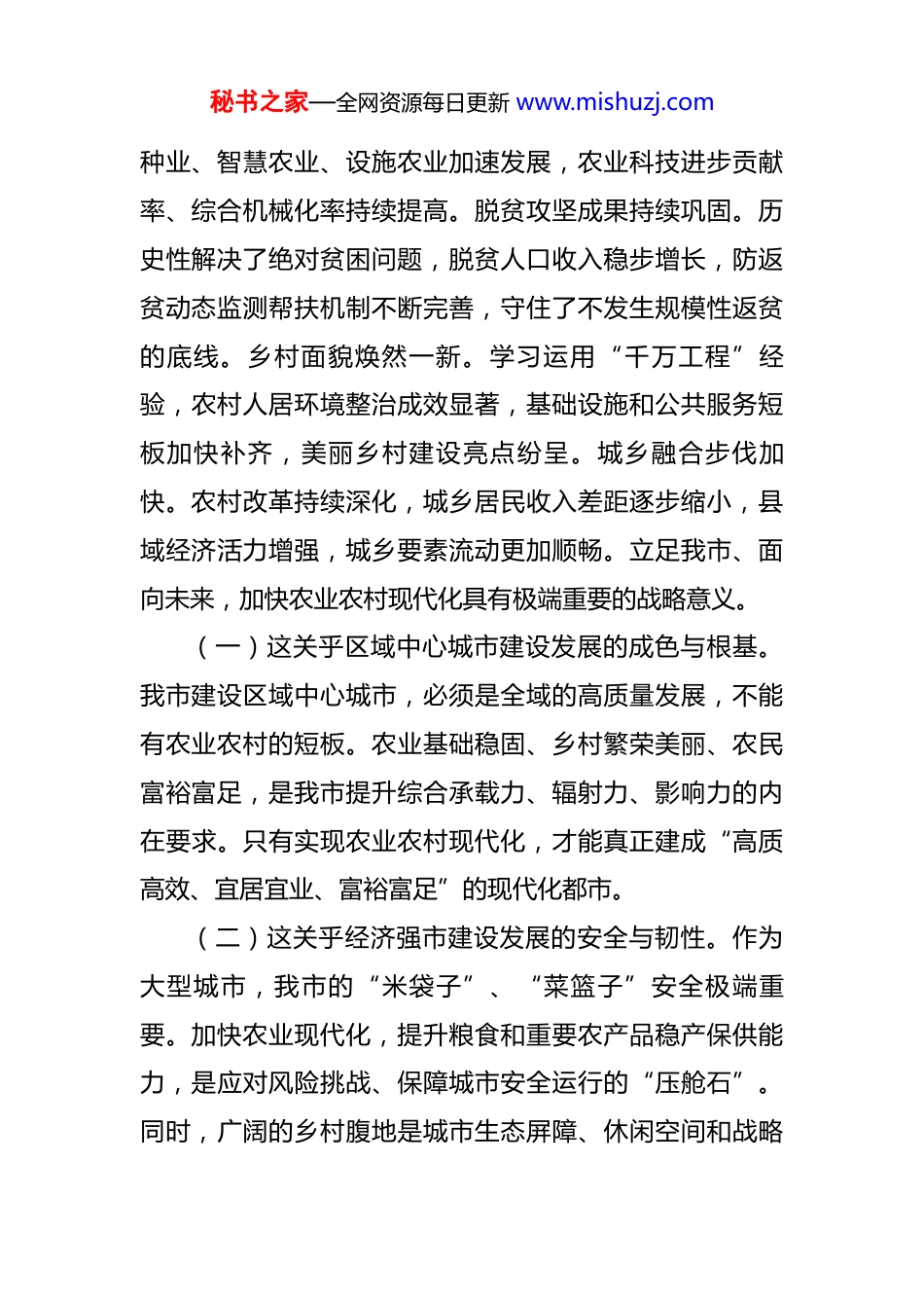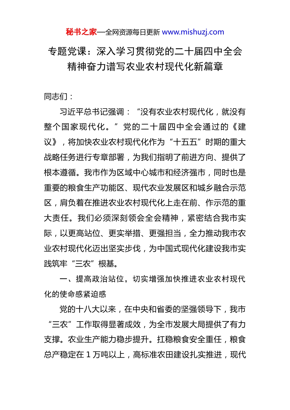 秘书之家—全网资源每日更新 www.mishuzj.com专题党课:深入学习贯彻党的二十届四中全会精神奋力谱写农业农村现代化新篇章 同志们:习近平总书记强调:“没有农业农村现代化,就没有整个国家现代化。”党的二十届四中全会通过的《建议》,将加快农业农村现代化作为“十五五”时期的重大战略任务进行专章部署,为我们指明了前进方向、提供了根本遵循。我市作为区域中心城市和经济强市,同时也是重要的粮食生产功能区、现代农业发展区和城乡融合示范区,肩负着在推进农业农村现代化上走在前、作示范的重大责任。我们必须深刻领会全会精神,紧密结合我市实际,以更高站位、更实举措、更强担当,全力推动我市农业农村现代化迈出坚实步伐,为中国式现代化建设我市实践筑牢“三农”根基。一、提高政治站位,切实增强加快推进农业农村现代化的使命感紧迫感党的十八大以来,在中央和省委的坚强领导下,我市“三农”工作取得显著成效,为全市发展大局提供了有力支撑。农业生产能力稳步提升。扛稳粮食安全重任,粮食总产稳定在 1 万吨以上,高标准农田建设扎实推进,现代秘书之家—全网资源每日更新 www.mishuzj.com种业、智慧农业、设施农业加速发展,农业科技进步贡献率、综合机械化率持续提高。脱贫攻坚成果持续巩固。历史性解决了绝对贫困问题,脱贫人口收入稳步增长,防返贫动态监测帮扶机制不断完善,守住了不发生规模性返贫的底线。乡村面貌焕然一新。学习运用“千万工程”经验,农村人居环境整治成效显著,基础设施和公共服务短板加快补齐,美丽乡村建设亮点纷呈。城乡融合步伐加快。农村改革持续深化,城乡居民收入差距逐步缩小,县域经济活力增强,城乡要素流动更加顺畅。立足我市、面向未来,加快农业农村现代化具有极端重要的战略意义。(一)这关乎区域中心城市建设发展的成色与根基。我市建设区域中心城市,必须是全域的高质量发展,不能有农业农村的短板。农业基础稳固、乡村繁荣美丽、农民富裕富足,是我市提升综合承载力、辐射力、影响力的内在要求。只有实现农业农村现代化,才能真正建成“高质高效、宜居宜业、富裕富足”的现代化都市。(二)这关乎经济强市建设发展的安全与韧性。作为大型城市,我市的“米袋子”、“菜篮子”安全极端重要。加快农业现代化,提升粮食和重要农产品稳产保供能力,是应对风险挑战、保障城市安全运行的“压舱石”。同时,广阔的乡村腹地是城市生态屏障、休闲空间和战略秘书之家—全网资源每日更新 www.mishuzj.com纵深,其现代化水平直接关系城市的可持续发展与韧性。(三)这关乎推进共同富裕的进程与质量。我市仍有相当数量的农村人口,即使城镇化率持续提高,未来仍有数百万人在乡村生活。加快农业农村现代化,是回应农民对美好生活向往的必然要求,是缩小城乡差距、促进共同富裕的关键路径。让我市的农民共享现代化成果,是建设现代化区域中心城市的题中应有之义。二、把握四种关系,科学谋划我市农业农村现代化的实践路径推进我市农业农村现代化,必须深入贯彻落实习近平总书记关于“三农”工作的重要论述和视察我市重要讲话指示精神,坚持农业农村优先发展,坚持城乡融合发展,遵循规律、因地制宜、系统推进。在实践中需着重把握好以下关系,探索具有我市特色的路径。(一)准确把握统筹战略目标与我市特色的关系。既要锚定国家部署的农业农村现代化总目标,又要立足我市都市型现代农业定位和城乡高度融合的特点。我市路径。突出“服务城市、富裕农民、优化生态”功能,大力发展都市近郊型高效农业、现代种业、智慧农业、休闲观光农业;强化以城带乡、以工促农,推动基础设施、公共服务、产业发展向乡村深度延伸覆盖,打造城乡融合发展的秘书之家—全网资源每日更新 www.mishuzj.com“我市样板”。(二)准确把握整体推进与分类施策的关系。我市下辖县(市)区资源禀赋、发展基础差异明显。既要坚持统一规划引领和基本标准,又要鼓励各地立足实际、彰显特色。平原地区重点发展规模化、机械化、智能化的粮食生产和高效设施农业;环城等近郊区域重点发展休闲农业、体验农业、精品果蔬;山区丘陵地带重点发展特色林果、生态养殖、...