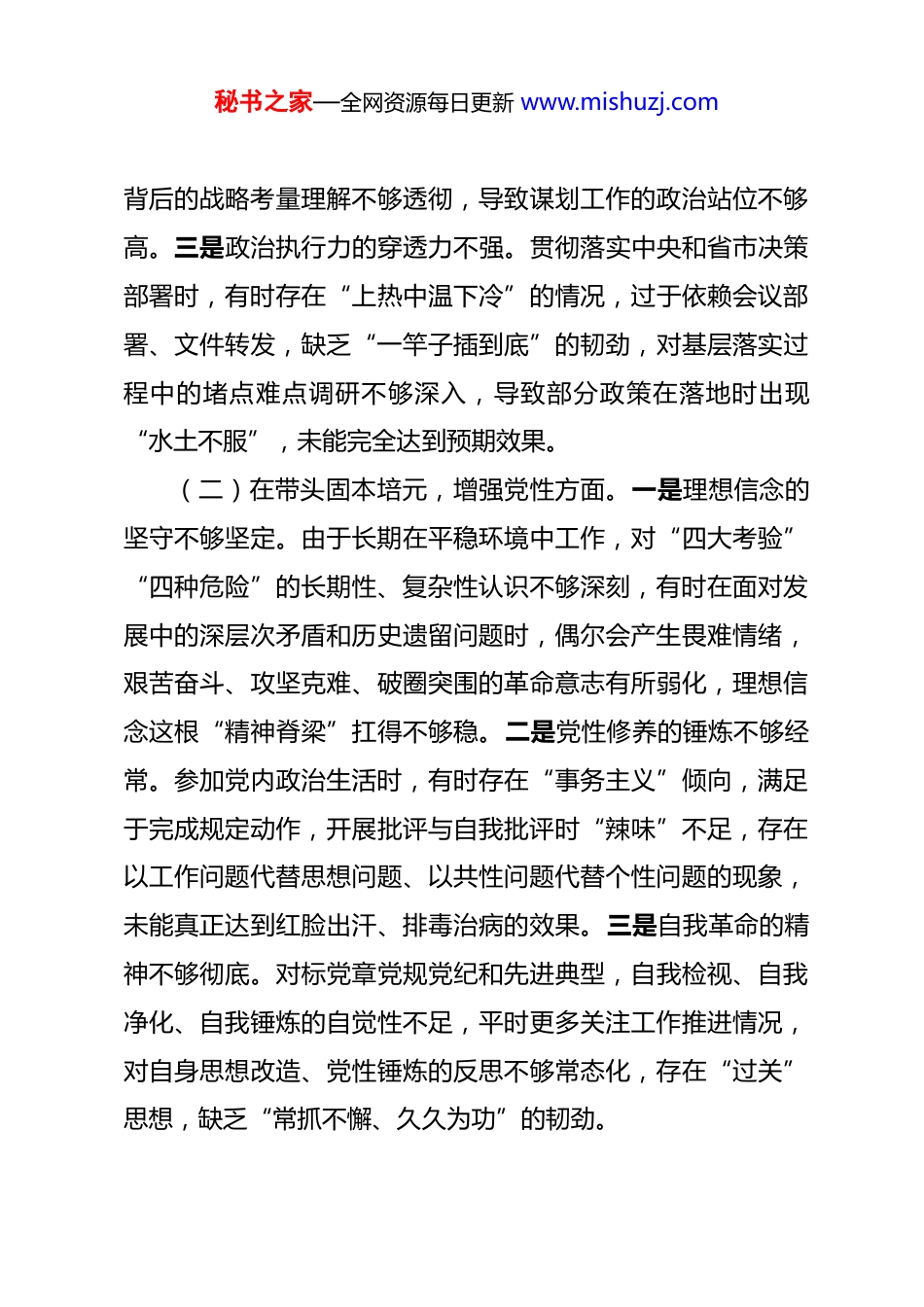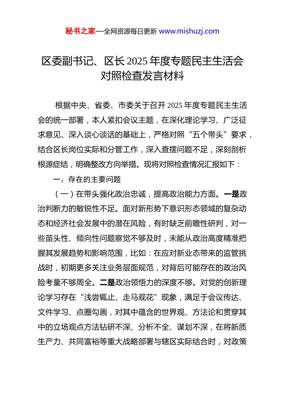 秘书之家—全网资源每日更新 www.mishuzj.com区委副书记、区长 2025 年度专题民主生活会对照检查发言材料 根据中央、省委、市委关于召开 2025 年度专题民主生活会的统一部署,本人紧扣会议主题,在深化理论学习、广泛征求意见、深入谈心谈话的基础上,严格对照“五个带头”要求,结合区长岗位实际和分管工作,深入查摆问题不足,深刻剖析根源症结,明确整改方向举措。现将对照检查情况汇报如下:一、存在的主要问题(一)在带头强化政治忠诚,提高政治能力方面。一是政治判断力的敏锐性不足。面对新形势下意识形态领域的复杂动态和经济社会发展中的潜在风险,有时缺乏前瞻性研判,对一些苗头性、倾向性问题察觉不够及时,未能从政治高度精准把握其发展趋势和影响范围,比如:在应对新业态带来的监管挑战时,初期更多关注业务层面规范,对背后可能存在的政治风险考量不够周全。二是政治领悟力的深度不够。对党的创新理论学习存在“浅尝辄止、走马观花”现象,满足于会议传达、文件学习、点圈勾画,对其中蕴含的世界观、方法论和贯穿其中的立场观点方法钻研不深、分析不全、谋划不深,在将新质生产力、共同富裕等重大战略部署与辖区实际结合时,对政策秘书之家—全网资源每日更新 www.mishuzj.com背后的战略考量理解不够透彻,导致谋划工作的政治站位不够高。三是政治执行力的穿透力不强。贯彻落实中央和省市决策部署时,有时存在“上热中温下冷”的情况,过于依赖会议部署、文件转发,缺乏“一竿子插到底”的韧劲,对基层落实过程中的堵点难点调研不够深入,导致部分政策在落地时出现“水土不服”,未能完全达到预期效果。(二)在带头固本培元,增强党性方面。一是理想信念的坚守不够坚定。由于长期在平稳环境中工作,对“四大考验”“四种危险”的长期性、复杂性认识不够深刻,有时在面对发展中的深层次矛盾和历史遗留问题时,偶尔会产生畏难情绪,艰苦奋斗、攻坚克难、破圈突围的革命意志有所弱化,理想信念这根“精神脊梁”扛得不够稳。二是党性修养的锤炼不够经常。参加党内政治生活时,有时存在“事务主义”倾向,满足于完成规定动作,开展批评与自我批评时“辣味”不足,存在以工作问题代替思想问题、以共性问题代替个性问题的现象,未能真正达到红脸出汗、排毒治病的效果。三是自我革命的精神不够彻底。对标党章党规党纪和先进典型,自我检视、自我净化、自我锤炼的自觉性不足,平时更多关注工作推进情况,对自身思想改造、党性锤炼的反思不够常态化,存在“过关”思想,缺乏“常抓不懈、久久为功”的韧劲。秘书之家—全网资源每日更新 www.mishuzj.com(三)在带头敬畏人民、敬畏组织、敬畏法纪方面。一是宗旨意识的践行不够深入。虽然坚持下基层调研,但有时存在“走马观花”现象,深入社区、企业、项目一线与群众面对面交流不够充分,对群众的个性化诉求和急难愁盼问题掌握不够精准,解决问题的闭环机制不够完善,存在“调研一阵风、解决不彻底”的情况。二是组织观念的恪守不够严格。在执行组织制度、报告个人有关事项等方面,虽然能够遵守规定,但有时存在不够主动、不够及时的问题,对组织安排的工作有时会先考虑个人精力分配,缺乏“无条件服从”的自觉性,主动向组织汇报思想、工作进展的意识不够强。三是法治思维的运用不够熟练。推动工作时,有时过于强调“效率优先”,对法治程序的刚性约束认识不够充分,存在“重实体、轻程序”的倾向,在重大决策、项目推进中,依法决策、依规办事的意识不够强,运用法治手段破解难题的能力有待提升。(四)在带头干事创业,担当作为方面。一是斗争精神的弘扬不够有力。面对改革发展中的“硬骨头”和利益调整中的复杂矛盾,有时存在“求稳怕乱”的思想,缺乏“逢山开路、遇水架桥”的闯劲,不敢动真碰硬,对一些不良现象和违规行为,有时碍于情面不敢坚决斗争,担当精神有所欠缺。二是创新锐气的激发不够充分。习惯于按照传统思路和固有模式推进秘书之家—全网资源每日更新 www.mishuzj.com工作,对新业态、新模式、新政策的学习研究不够深入,破解发展瓶颈时思路不够开阔,缺乏突破性思维和创造性举措,比如:在推动...