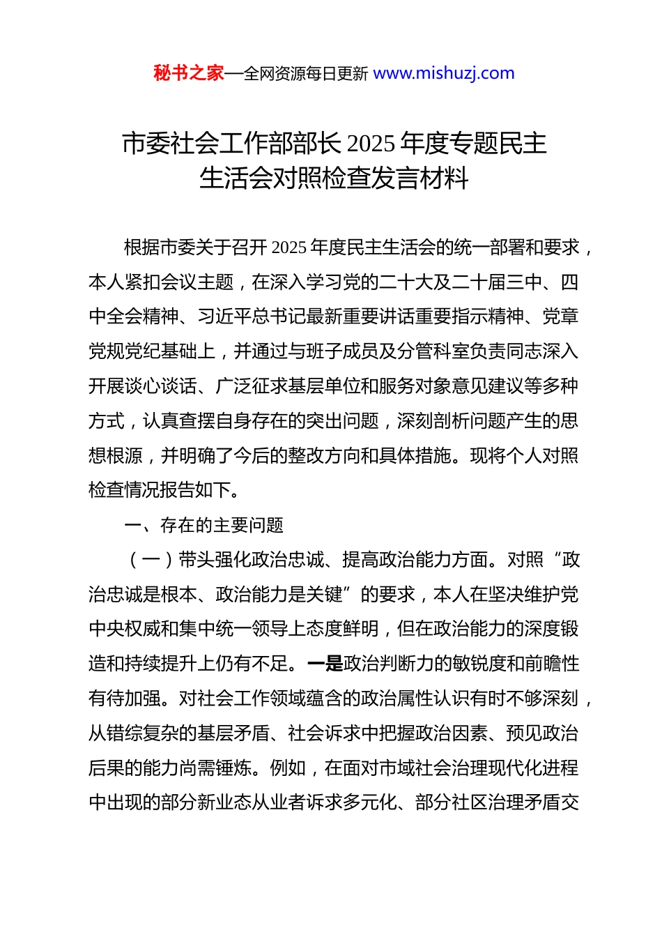 秘书之家—全网资源每日更新 www.mishuzj.com市委社会工作部部长 2025 年度专题民主生活会对照检查发言材料 根据市委关于召开 2025 年度民主生活会的统一部署和要求,本人紧扣会议主题,在深入学习党的二十大及二十届三中、四中全会精神、习近平总书记最新重要讲话重要指示精神、党章党规党纪基础上,并通过与班子成员及分管科室负责同志深入开展谈心谈话、广泛征求基层单位和服务对象意见建议等多种方式,认真查摆自身存在的突出问题,深刻剖析问题产生的思想根源,并明确了今后的整改方向和具体措施。现将个人对照检查情况报告如下。一、存在的主要问题(一)带头强化政治忠诚、提高政治能力方面。对照“政治忠诚是根本、政治能力是关键”的要求,本人在坚决维护党中央权威和集中统一领导上态度鲜明,但在政治能力的深度锻造和持续提升上仍有不足。一是政治判断力的敏锐度和前瞻性有待加强。对社会工作领域蕴含的政治属性认识有时不够深刻,从错综复杂的基层矛盾、社会诉求中把握政治因素、预见政治后果的能力尚需锤炼。例如,在面对市域社会治理现代化进程中出现的部分新业态从业者诉求多元化、部分社区治理矛盾交秘书之家—全网资源每日更新 www.mishuzj.com织等情况时,虽然能够坚持正确政治方向进行处理,但对其背后可能演化的政治风险、社会风险的洞察、研判和提前介入有时不够及时、精准,运用政治眼光观察分析社会问题的敏锐性有待提升。二是政治领悟力的系统性和穿透性有待深化。对党中央关于国家治理、社会治理、基层治理等方面的大政方针和战略部署,能够做到认真学习、坚决拥护,但在结合市情特别是社会工作领域实际进行系统消化、融会贯通上还不够到位。对“中国式现代化”这一宏大叙事如何具体而微地落实到基层治理创新、社会服务体系完善等工作中,如何转化为社会工作部清晰的行动路线图和施工图,思考谋划的深度和系统性尚有欠缺,存在一定的“上下一般粗”现象,创造性转化的结合点找得不够精准。三是政治执行力的彻底性和创新性有待增强。对中央、省委、市委的决策部署能够做到不折不扣执行,但在推动落实过程中,有时过于强调“规定动作”的完成,结合社会工作特点和难点进行“自选动作”创新的勇气和智慧不足。例如,在落实上级关于健全城乡社区治理体系要求时,对如何进一步挖掘和提炼“有事好商量”基层协商民主、党建引领网格治理等现有经验的深层价值,如何将其与新时代“枫桥经验”实践更紧密结合,打造具有全国影响力的标志性成果方面,主动谋划、攻坚突破的力度还不够大,执行效果的最大化、最秘书之家—全网资源每日更新 www.mishuzj.com优化有待提升。对分管领域党员干部的政治能力培养,系统性规划和常态化抓手的实效性也需加强。(二)带头固本培元、增强党性方面。对照“党性是党员干部立身、立业、立言、立德的基石”这一要求,本人在党性修养的持续锤炼上仍有差距。一是理论武装的深度和转化效率有待提升。能够坚持参加集体学习和开展自学,但对习近平新时代中国特色社会主义思想,特别是习近平总书记关于社会治理、民生保障、群众工作等重要论述的学习,有时停留在“读过了”“学过了”层面,对其蕴含的马克思主义立场、观点、方法的理解掌握不够透彻,存在“知其然”多于“知其所以然”的情况。将党的创新理论蕴含的真理力量,转化为指导社会工作部破解“一老一小”服务难题、化解基层信访矛盾、激发社会组织活力等具体实践的能力尚显不足,理论联系实际的“桥梁”搭建得不够牢固。二是党性锤炼的主动性和经常性有待加强。参加党的组织生活能够做到自觉主动,但有时将组织生活简单等同于完成任务,在运用批评和自我批评武器上还不够大胆、直接,“辣味”不足。自我批评有时碍于情面或担心影响形象,对深层次问题触及不够;批评同志有时顾虑较多,怕影响团结、怕伤和气,存在“和风细雨”多、“红脸出汗”少的情况。对照革命先辈和先进典型,在艰苦奋斗、无私奉献秘书之家—全网资源每日更新 www.mishuzj.com精神方面的对标反思不够经常,自我净化、自我完善、自我革新、自我提高的主动性有待增强。三是宗旨意识树得不够牢固、践行不...