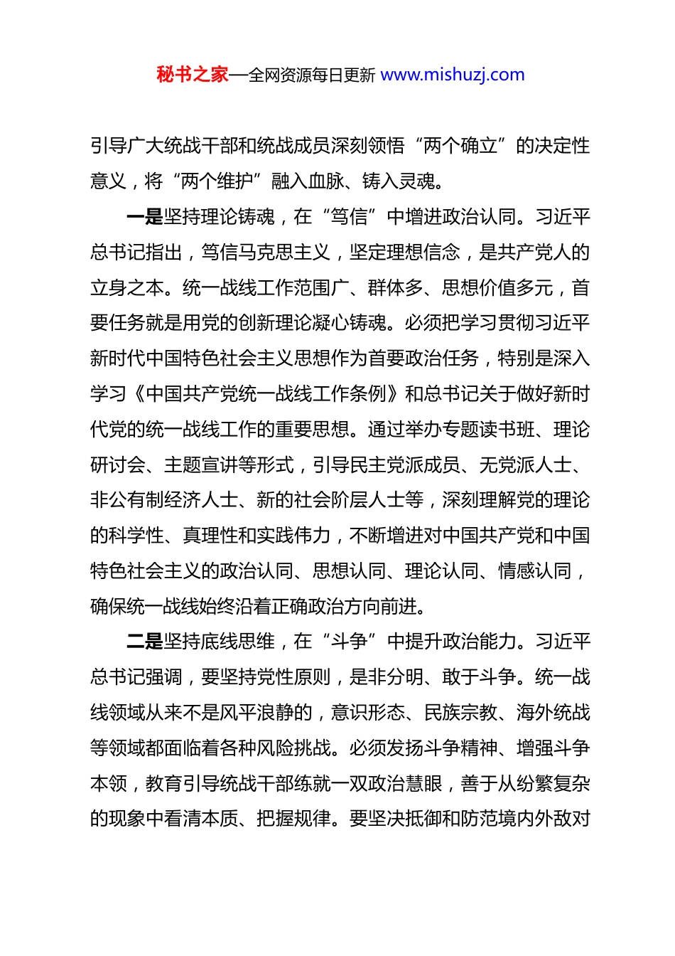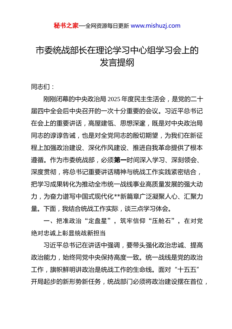 秘书之家—全网资源每日更新 www.mishuzj.com市委统战部长在理论学习中心组学习会上的发言提纲 同志们:刚刚闭幕的中央政治局 2025 年度民主生活会,是党的二十届四中全会后中央召开的一次十分重要的会议。习近平总书记在会上的重要讲话,高屋建瓴、思想深邃,既是对中央政治局同志的谆谆告诫,也是对全党同志的殷切期望,为我们在新征程上加强政治建设、深化作风建设、推进自我革命提供了根本遵循。作为市委统战部,必须第一时间深入学习、深刻领会、深度贯彻,将总书记重要讲话精神与统战工作实践紧密结合,把学习成果转化为推动全市统一战线事业高质量发展的强大动力,为奋力谱写中国式现代化**新篇章广泛凝聚人心、汇聚力量。下面,我结合统战工作实际,谈三点学习体会。一、把准政治“定盘星”,筑牢信仰“压舱石”,在对党绝对忠诚上彰显统战新担当习近平总书记在讲话中强调,要带头强化政治忠诚、提高政治能力,始终同党中央保持高度一致。统一战线是党的政治工作,旗帜鲜明讲政治是统战工作的生命线。面对“十五五”开局起步的新形势新任务,统战部门必须将政治建设摆在首位,秘书之家—全网资源每日更新 www.mishuzj.com引导广大统战干部和统战成员深刻领悟“两个确立”的决定性意义,将“两个维护”融入血脉、铸入灵魂。一是坚持理论铸魂,在“笃信”中增进政治认同。习近平总书记指出,笃信马克思主义,坚定理想信念,是共产党人的立身之本。统一战线工作范围广、群体多、思想价值多元,首要任务就是用党的创新理论凝心铸魂。必须把学习贯彻习近平新时代中国特色社会主义思想作为首要政治任务,特别是深入学习《中国共产党统一战线工作条例》和总书记关于做好新时代党的统一战线工作的重要思想。通过举办专题读书班、理论研讨会、主题宣讲等形式,引导民主党派成员、无党派人士、非公有制经济人士、新的社会阶层人士等,深刻理解党的理论的科学性、真理性和实践伟力,不断增进对中国共产党和中国特色社会主义的政治认同、思想认同、理论认同、情感认同,确保统一战线始终沿着正确政治方向前进。二是坚持底线思维,在“斗争”中提升政治能力。习近平总书记强调,要坚持党性原则,是非分明、敢于斗争。统一战线领域从来不是风平浪静的,意识形态、民族宗教、海外统战等领域都面临着各种风险挑战。必须发扬斗争精神、增强斗争本领,教育引导统战干部练就一双政治慧眼,善于从纷繁复杂的现象中看清本质、把握规律。要坚决抵御和防范境内外敌对秘书之家—全网资源每日更新 www.mishuzj.com势力利用民族、宗教问题进行的分裂、渗透、破坏活动,依法管理宗教事务,促进民族团结进步。要加强对网络人士、留学人员等群体的思想政治引领,筑牢网络意识形态安全屏障,确保统一战线领域绝对安全、和谐稳定,以实际行动捍卫党的执政安全。三是坚持同心同向,在“引领”中汇聚政治共识。人心是最大的政治,共识是奋进的动力。统战工作的本质要求是大团结大联合,解决的就是人心和力量问题。必须聚焦**省委十一届九次全会和**市委十二届十次全会擘画的“十五五”宏伟蓝图找准党建、统战和中心工作的“结合点、着力点、关键点”。要发挥新型政党制度优势,支持各民主党派、工商联和无党派人士围绕**市加快建设现代化滨海城市、打造高质量发展新增长极等中心任务,深入开展调查研究,积极建言献策。要创新联谊交友方式,与党外知识分子、非公经济人士等交真心、讲真话,把他们紧密团结在党的周围,心往一处想、劲往一处使,为实现“十五五”良好开局画出最大同心圆。二、扛起发展“千钧担”,下好服务“一盘棋”,在助推中心大局上展现统战新作为习近平总书记强调,领导干部要勇于担当,在其位、谋其政、尽其责,创造出无愧于时代的业绩。中央政治局会议也指秘书之家—全网资源每日更新 www.mishuzj.com出,明年是“十五五”开局之年,要着力推动高质量发展。统战部门作为党的重要职能部门,必须自觉把工作放到全市发展大局中去谋划和推进,将统一战线的智慧和力量聚焦到市委确定的各项目标任务上来。一是聚焦经济建设主战场,当好高质量发展的“助推器”。**市委十二届十次全会明...