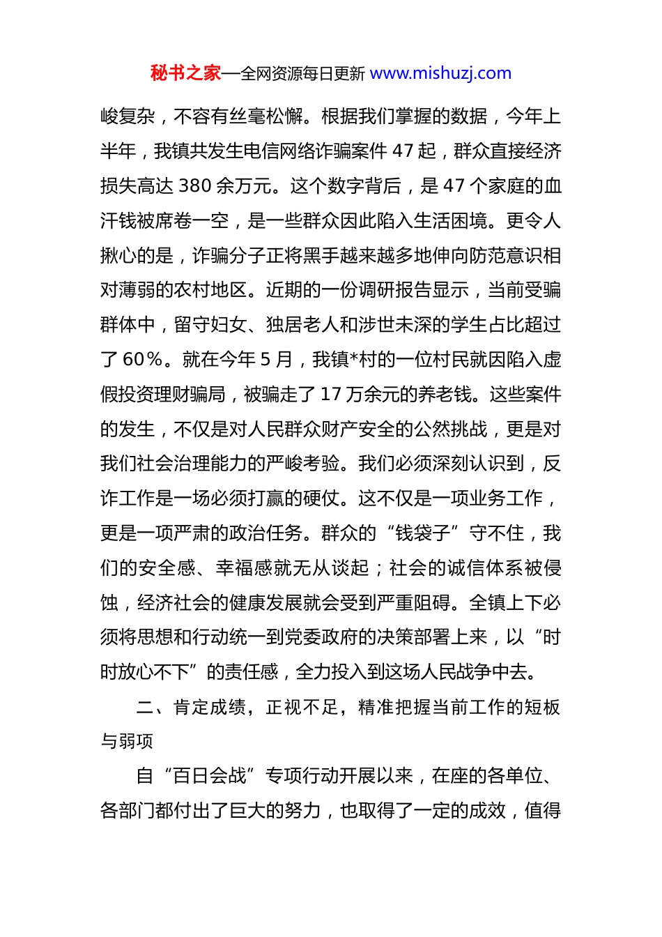秘书之家—全网资源每日更新 www.mishuzj.com在 2025 年全镇打击治理电信网络诈骗专项工作推进会上的讲话 同志们:今天,我们在这里召开全镇打击治理电信网络诈骗专项工作推进会,主要目的是分析当前我们*镇面临的严峻形势,总结前期工作,并对下一阶段的攻坚任务进行再动员、再部署。打击治理电信网络诈骗,事关人民群众的切身利益,事关社会大局的和谐稳定,更事关我们党的执政根基。我们必须以清醒的头脑、坚定的决心和有力的举措,坚决遏制此类犯罪的高发态势。一、认清形势,统一思想,深刻认识专项治理的极端重要性当前,全国范围内的反诈斗争正处于纵深推进的关键阶段。自“十四五”规划实施以来,全国公安机关在打击电信网络诈信犯罪方面取得了显著战果,截至今年上半年,累计破获案件数量已超过 173.9 万起。特别是随着对境外诈骗集团的毁灭性打击,全国的立案数和群众损失在今年初呈现出可喜的下降趋势。然而,我们必须清醒地看到,全国形势的好转不代表局部地区可以高枕无忧。对我们*镇而言,反诈形势依然严秘书之家—全网资源每日更新 www.mishuzj.com峻复杂,不容有丝毫松懈。根据我们掌握的数据,今年上半年,我镇共发生电信网络诈骗案件 47 起,群众直接经济损失高达 380 余万元。这个数字背后,是 47 个家庭的血汗钱被席卷一空,是一些群众因此陷入生活困境。更令人揪心的是,诈骗分子正将黑手越来越多地伸向防范意识相对薄弱的农村地区。近期的一份调研报告显示,当前受骗群体中,留守妇女、独居老人和涉世未深的学生占比超过了 60%。就在今年 5 月,我镇*村的一位村民就因陷入虚假投资理财骗局,被骗走了 17 万余元的养老钱。这些案件的发生,不仅是对人民群众财产安全的公然挑战,更是对我们社会治理能力的严峻考验。我们必须深刻认识到,反诈工作是一场必须打赢的硬仗。这不仅是一项业务工作,更是一项严肃的政治任务。群众的“钱袋子”守不住,我们的安全感、幸福感就无从谈起;社会的诚信体系被侵蚀,经济社会的健康发展就会受到严重阻碍。全镇上下必须将思想和行动统一到党委政府的决策部署上来,以“时时放心不下”的责任感,全力投入到这场人民战争中去。二、肯定成绩,正视不足,精准把握当前工作的短板与弱项自“百日会战”专项行动开展以来,在座的各单位、各部门都付出了巨大的努力,也取得了一定的成效,值得秘书之家—全网资源每日更新 www.mishuzj.com充分肯定。我们的公安干警冲锋在前,连续作战,破获了一批案件,抓获了一批犯罪嫌疑人,为群众挽回了一部分经济损失。各金融机构积极落实“源头阻断”责任,严格执行开户审核与风险分级管理,成功拦截了多起可疑转账。三大通信运营商也认真履行“通道治理”职责,在实名制登记、涉案号码关停等方面做了大量工作。这些成绩的取得,是大家共同奋斗的结果。但是在肯定成绩的同时,我们更要敢于直面问题、正视不足。当前,我们的工作中还存在着一些亟待解决的短板和弱项:联防联控的壁垒依然存在。警、银、信三方虽然建立了初步的协作关系,但在信息共享的深度和广度上还远远不够。数据信息仍未完全打通,存在“信息孤岛”现象,导致预警预防的精准度和时效性大打折扣。很多时候,我们还是在各自为战,未能形成“一盘棋”的强大合力。主动预防的手段相对乏力。我们的工作模式在很多情况下仍停留在“事后打击”,即案件发生后才介入侦办,群众的损失已经造成,挽回难度极大。如何将防线前移,变被动应对为主动预防,变“亡羊补牢”为“未雨绸缪”,是我们必须攻克的难题。,源头管控的链条存在薄弱环节。银行方面,如何更精准地识别伪冒开户和异常交易,如何提升一线柜员劝阻拦截的实战能力,仍是巨大挑秘书之家—全网资源每日更新 www.mishuzj.com战。通信运营商方面,如何有效治理虚拟号码、网络改号等技术难题,彻底斩断犯罪分子的通信链条,也需要我们下更大的功夫。宣传教育的覆盖仍有盲区。尽管我们开展了形式多样的反诈宣传,但诈骗手法迭代更新速度快,我们的宣传内容和方式有时跟不上变化。特别是针对农村地区和特定易受骗人群的“精准滴灌”式宣传还不够深入,未能真正...