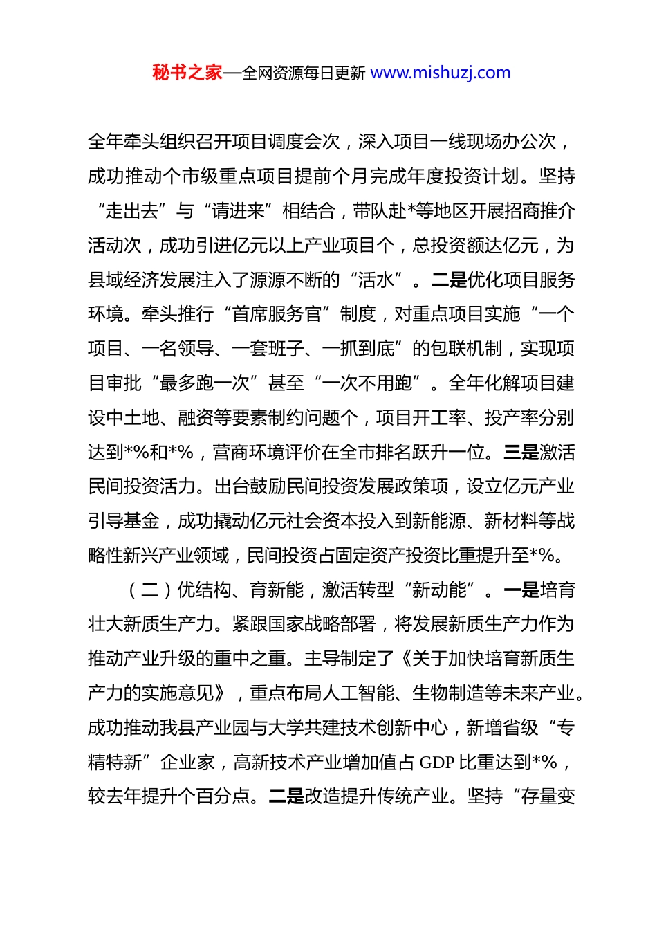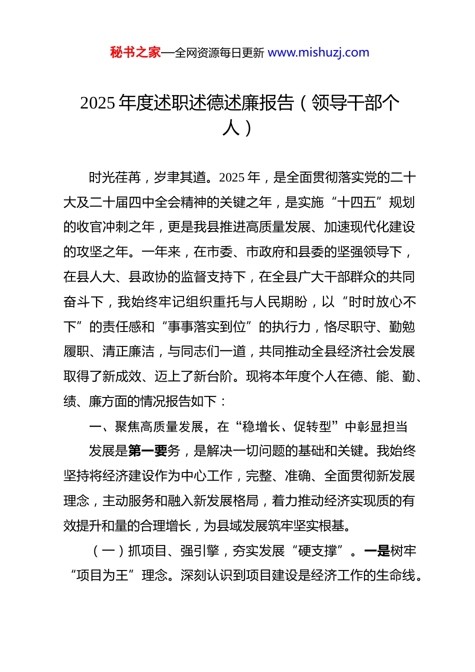 秘书之家—全网资源每日更新 www.mishuzj.com2025 年度述职述德述廉报告(领导干部个人)时光荏苒,岁聿其遒。2025 年,是全面贯彻落实党的二十大及二十届四中全会精神的关键之年,是实施“十四五”规划的收官冲刺之年,更是我县推进高质量发展、加速现代化建设的攻坚之年。一年来,在市委、市政府和县委的坚强领导下,在县人大、县政协的监督支持下,在全县广大干部群众的共同奋斗下,我始终牢记组织重托与人民期盼,以“时时放心不下”的责任感和“事事落实到位”的执行力,恪尽职守、勤勉履职、清正廉洁,与同志们一道,共同推动全县经济社会发展取得了新成效、迈上了新台阶。现将本年度个人在德、能、勤、绩、廉方面的情况报告如下:一、聚焦高质量发展,在“稳增长、促转型”中彰显担当发展是第一要务,是解决一切问题的基础和关键。我始终坚持将经济建设作为中心工作,完整、准确、全面贯彻新发展理念,主动服务和融入新发展格局,着力推动经济实现质的有效提升和量的合理增长,为县域发展筑牢坚实根基。(一)抓项目、强引擎,夯实发展“硬支撑”。一是树牢“项目为王”理念。深刻认识到项目建设是经济工作的生命线。秘书之家—全网资源每日更新 www.mishuzj.com全年牵头组织召开项目调度会次,深入项目一线现场办公次,成功推动个市级重点项目提前个月完成年度投资计划。坚持“走出去”与“请进来”相结合,带队赴*等地区开展招商推介活动次,成功引进亿元以上产业项目个,总投资额达亿元,为县域经济发展注入了源源不断的“活水”。二是优化项目服务环境。牵头推行“首席服务官”制度,对重点项目实施“一个项目、一名领导、一套班子、一抓到底”的包联机制,实现项目审批“最多跑一次”甚至“一次不用跑”。全年化解项目建设中土地、融资等要素制约问题个,项目开工率、投产率分别达到*%和*%,营商环境评价在全市排名跃升一位。三是激活民间投资活力。出台鼓励民间投资发展政策项,设立亿元产业引导基金,成功撬动亿元社会资本投入到新能源、新材料等战略性新兴产业领域,民间投资占固定资产投资比重提升至*%。(二)优结构、育新能,激活转型“新动能”。一是培育壮大新质生产力。紧跟国家战略部署,将发展新质生产力作为推动产业升级的重中之重。主导制定了《关于加快培育新质生产力的实施意见》,重点布局人工智能、生物制造等未来产业。成功推动我县产业园与大学共建技术创新中心,新增省级“专精特新”企业家,高新技术产业增加值占 GDP 比重达到*%,较去年提升个百分点。二是改造提升传统产业。坚持“存量变秘书之家—全网资源每日更新 www.mishuzj.com革”与“增量崛起”并重,投入万元财政资金支持*、对传统优势产业进行数字化、智能化、绿色化改造。全年完成家企业“上云用数赋智”工程,单位 GDP 能耗下降*%,成功创建省级绿色工厂,让“老树”发出了“新枝”。三是推动现代服务业提质增效。围绕文旅康养、现代物流等领域,成功打造 A 级旅游景区个,举办县首届文化旅游节,全年接待游客万人次,旅游综合收入达亿元。建成县智慧物流园区,快递物流成本降低%,有效畅通了经济循环。(三)惠民生、增福祉,共享发展“新成果”。一是千方百计稳就业。坚持把稳就业、保就业摆在突出位置,全年组织线上线下招聘会,提供就业岗位万个,实现城镇新增就业人,失业人员再就业人,确保了零就业家庭动态清零。特别是针对高校毕业生、退役军人等重点群体,开发公益性岗位个,发放创业担保贷款万元,扶持百名青年成功创业。二是持续增加群众收入。随着经济发展,城乡居民收入稳步增长。据统计2025 年我县城镇居民人均可支配收入达到元,同比增长*%;农村居民人均可支配收入达到元,同比增长%,增速连续年快于城镇居民,城乡收入差距进一步缩小。三是兜牢基本民生底线。坚持财力向民生倾斜,民生支出占一般公共预算支出的比重保持在%以上。城乡低保、特困供养等保障标准实现“连秘书之家—全网资源每日更新 www.mishuzj.com增”,累计发放各类救助资金万元,惠及困难群众*万余人次,确保了发展成果更多更公平惠及全体人民。二、心系“三农”根本,在“促振兴、...