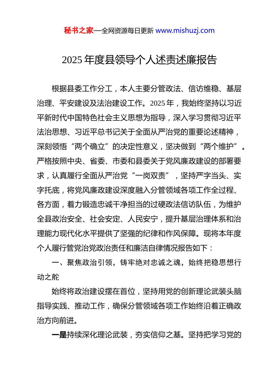 秘书之家—全网资源每日更新 www.mishuzj.com2025 年度县领导个人述责述廉报告 根据县委工作分工,本人主要分管政法、信访维稳、基层治理、平安建设及法治建设工作。2025 年,我始终坚持以习近平新时代中国特色社会主义思想为指导,深入学习贯彻习近平法治思想、习近平总书记关于全面从严治党的重要论述精神,深刻领悟“两个确立”的决定性意义,坚决做到“两个维护”。严格按照中央、省委、市委和县委关于党风廉政建设的部署要求,认真履行全面从严治党“一岗双责”,坚持严字当头、实字托底,将党风廉政建设深度融入分管领域各项工作全过程、各方面,着力锻造忠诚干净担当的过硬政法信访队伍,为维护全县政治安全、社会安定、人民安宁,提升基层治理体系和治理能力现代化水平提供了坚强的纪律和作风保障。现将本年度个人履行管党治党政治责任和廉洁自律情况报告如下:一、聚焦政治引领,铸牢绝对忠诚之魂,始终把稳思想行动之舵始终将政治建设摆在首位,坚持用党的创新理论武装头脑指导实践、推动工作,确保分管领域各项工作始终沿着正确政治方向前进。一是持续深化理论武装,夯实信仰之基。坚持把学习党的秘书之家—全网资源每日更新 www.mishuzj.com创新理论作为首要政治任务和终身课题。积极参加县委理论学习中心组学习、专题读书班、研讨交流会等,原原本本、逐字逐句学习党的二十大及二十届三中、四中全会精神,系统研读《习近平著作选读》《习近平新时代中国特色社会主义思想学习纲要》等重要文献,重点深学细悟习近平法治思想、总体国家安全观以及关于政法工作、信访工作、基层治理的重要论述。全年参加中心组学习 22 次,专题研讨 8 次,撰写学习心得体会、理论文章 15 篇,完成《关于新时代“枫桥经验”本地化实践的思考》等专题调研报告 4 篇。通过学习,不断增进对党的创新理论的政治认同、思想认同、理论认同、情感认同,切实增强政治敏锐性和政治鉴别力,自觉做党的创新理论的坚定信仰者和忠实实践者。二是扎实开展政治轮训,锤炼忠诚品格。高度重视分管部门党员干部的思想政治建设,将政治忠诚教育贯穿始终。牵头制定并组织实施政法信访系统年度政治轮训计划,将学习贯彻习近平新时代中国特色社会主义思想、党章党规党纪、政法工作条例、信访工作条例等作为核心内容。全年组织举办覆盖政法委机关、法院、检察院、公安局、司法局、信访局班子成员及中层骨干、乡镇(街道)政法委员、综治中心主任的政治轮训班 8 期,累计培训 1200 余人次。通过专家辅导、集中授课、秘书之家—全网资源每日更新 www.mishuzj.com案例教学、交流研讨、实地观摩等多种形式,教育引导广大干警和信访干部深刻认识政法机关、信访部门的政治属性,永葆对党忠诚的政治本色,确保“刀把子”牢牢掌握在党和人民手中。三是坚决贯彻上级部署,确保政令畅通。牢固树立“一盘棋”思想,对党中央及省委、市委、县委作出的关于平安建设、法治建设、信访工作现代化、基层社会治理创新等一系列重大决策部署,第一时间组织传达学习,深入研究谋划,结合分管领域实际,制定具体落实方案、明确责任分工、划定时间节点。全年主持召开专题部署会、推进会、协调会 35 次,建立重点工作台账,实行清单化管理、项目化推进。坚持每月至少安排一周时间,采取“四不两直”方式,带队深入乡镇(街道)、村(社区)、基层政法单位、信访接待场所开展实地督导检查 40余次,现场办公解决难点堵点问题 28 个。特别是在全国两会、党的二十届四中全会、国庆等重要敏感节点,提前进行风险研判,周密制定安保维稳工作方案和应急预案,加强值班备勤和应急处突演练,确保了我县在此期间社会大局持续和谐稳定,未发生有影响的重大案事件和群体性事件。二、聚焦主责主业,扛牢管党治党之责,纵深推进党风廉政建设秘书之家—全网资源每日更新 www.mishuzj.com坚决扛起全面从严治党政治责任,认真履行“一岗双责”坚持党风廉政建设与业务工作同部署、同落实、同检查、同考核,推动分管领域政治生态持续向好。一是压实主体责任链条。年初即主持召开分管部门党风廉政建设专题会议,分析形势,部署任务,与...