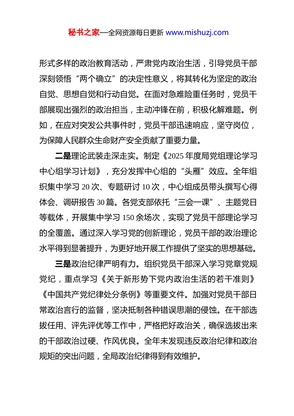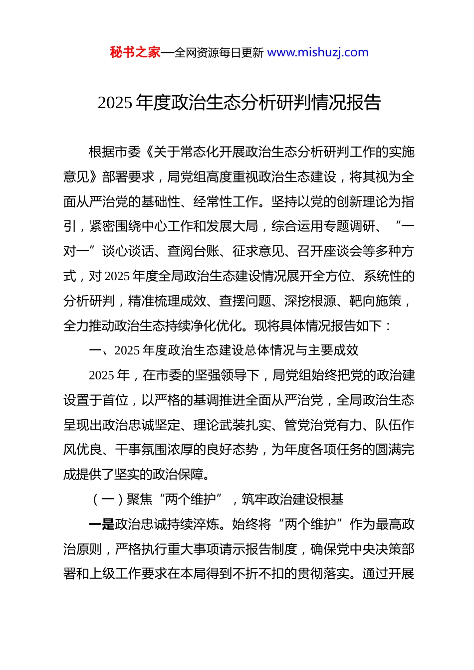 秘书之家—全网资源每日更新 www.mishuzj.com2025 年度政治生态分析研判情况报告 根据市委《关于常态化开展政治生态分析研判工作的实施意见》部署要求,局党组高度重视政治生态建设,将其视为全面从严治党的基础性、经常性工作。坚持以党的创新理论为指引,紧密围绕中心工作和发展大局,综合运用专题调研、“一对一”谈心谈话、查阅台账、征求意见、召开座谈会等多种方式,对 2025 年度全局政治生态建设情况展开全方位、系统性的分析研判,精准梳理成效、查摆问题、深挖根源、靶向施策,全力推动政治生态持续净化优化。现将具体情况报告如下:一、2025 年度政治生态建设总体情况与主要成效2025 年,在市委的坚强领导下,局党组始终把党的政治建设置于首位,以严格的基调推进全面从严治党,全局政治生态呈现出政治忠诚坚定、理论武装扎实、管党治党有力、队伍作风优良、干事氛围浓厚的良好态势,为年度各项任务的圆满完成提供了坚实的政治保障。(一)聚焦“两个维护”,筑牢政治建设根基一是政治忠诚持续淬炼。始终将“两个维护”作为最高政治原则,严格执行重大事项请示报告制度,确保党中央决策部署和上级工作要求在本局得到不折不扣的贯彻落实。通过开展秘书之家—全网资源每日更新 www.mishuzj.com形式多样的政治教育活动,严肃党内政治生活,引导党员干部深刻领悟“两个确立”的决定性意义,将其转化为坚定的政治自觉、思想自觉和行动自觉。在面对急难险重任务时,党员干部展现出强烈的政治担当,主动冲锋在前,积极化解难题。例如,在应对突发公共事件时,党员干部迅速响应,坚守岗位,为保障人民群众生命财产安全贡献了重要力量。二是理论武装走深走实。制定《2025 年度局党组理论学习中心组学习计划》,充分发挥中心组的“头雁”效应。全年组织集中学习 20 次、专题研讨 10 次,中心组成员带头撰写心得体会、调研报告 30 篇。各党支部依托“三会一课”、主题党日等载体,开展集中学习 150 余场次,实现了党员干部理论学习的全覆盖。通过深入学习党的创新理论,党员干部的政治理论水平得到显著提升,为更好地开展工作提供了坚实的思想基础。三是政治纪律严明有力。组织党员干部深入学习党章党规党纪,重点学习《关于新形势下党内政治生活的若干准则》《中国共产党纪律处分条例》等重要文件。加强对党员干部日常政治言行的监督,坚决抵制各种错误思潮的侵蚀。在干部选拔任用、评先评优等工作中,严格把好政治关,确保选拔出来的干部政治过硬、作风优良。全年未发现违反政治纪律和政治规矩的突出问题,全局政治纪律得到有效维护。秘书之家—全网资源每日更新 www.mishuzj.com(二)聚焦“两个责任”,营造管党治党浓厚氛围一是主体责任压实落细。年初专题部署全面从严治党工作,印发《局党组及其成员落实全面从严治党主体责任清单》,细化任务 70 项,明确责任分工和完成时限。党组书记与班子成员、班子成员与分管科室(单位)负责人逐级签订党风廉政建设责任书,形成了“明责、履责、督责、问责”的闭环体系。全年召开全面从严治党专题会议 8 次,听取班子成员“一岗双责”履职汇报 6 次,及时研究解决管党治党中存在的问题,确保主体责任落到实处。二是监督执纪精准有效。全力支持纪检监察机构履职,聚焦权力运行关键点、内部管理薄弱点,开展专项监督检查 15 次,发现并整改问题 40 个。精准运用监督执纪“四种形态”,全年开展提醒谈话、批评教育 50 人次,让“红脸出汗”成为常态。保持惩治腐败的高压态势,严肃查处违规违纪问题,形成了有力震慑。通过加强监督执纪,有效规范了权力运行,防止了腐败问题的发生。(三)聚焦干部队伍建设,打造忠诚干净担当队伍一是选人用人导向鲜明。坚持德才兼备、以德为先、五湖四海、任人唯贤的选人用人标准,严格执行干部选拔任用工作程序。2025 年,选拔任用了一批政治素质高、工作能力强、群秘书之家—全网资源每日更新 www.mishuzj.com众口碑好的干部,为全局事业发展注入了新的活力。在干部选拔任用过程中,注重考察干部的政治表现、工作业绩和廉洁自律情况,确保选拔出来的干部能够胜任工作岗...