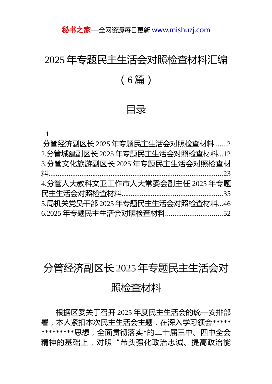 秘书之家—全网资源每日更新 www.mishuzj.com2025 年专题民主生活会对照检查材料汇编(6 篇)目录1.分管经济副区长 2025 年专题民主生活会对照检查材料.......22.分管城建副区长 2025 年专题民主生活会对照检查材料...123.分管文化旅游副区长 2025 年专题民主生活会对照检查材料...............................................................................................234.分管人大教科文卫工作市人大常委会副主任 2025 年专题民主生活会对照检查材料.......................................................355.局机关党员干部 2025 年专题民主生活会对照检查材料...466.2025 年专题民主生活会对照检查材料...............................52分管经济副区长 2025 年专题民主生活会对照检查材料根据区委关于召开 2025 年度民主生活会的统一安排部署,本人紧扣本次民主生活会主题,在深入学习领会**************思想,全面贯彻落实*的二十届三中、四中全会精神的基础上,对照“带头强化政治忠诚、提高政治能秘书之家—全网资源每日更新 www.mishuzj.com力”“带头固本培元、增强*性”“带头敬畏人民、敬畏组织、敬畏法纪”“带头干事创业、担当作为”“带头坚决扛起管*治*责任”等五个方面,深入开展自我剖析,广泛征求意见建议,深刻查摆了自身存在的问题,并对问题根源进行了深入剖析,明确了今后的努力方向和整改措施。现将个人对照检查情况报告如下。一、存在的主要问题(一)在带头强化政治忠诚、提高政治能力方面。一是理论学习成果向实践转化存在“温差”。虽然能够坚持参加集体学习和个人自学,对“两个确立”的决定性意义有深刻认识,但在将*的创新理论转化为推动 x 区经济高质量发展的具体实践上,还存在一定的滞后性。例如,在学习中央关于发展“新质生产力”的系列重要论述时,有时满足于理解概念、记住话语,但在如何结合我区传统白酒产业链升级和新兴航空航天装备制造产业培育的实际,拿出系统性、创造性的落地举措方面,思考得不够深、谋划得不够实,导致一些前瞻性政策的本地化、具体化进程不够快。二是应对复杂经济形势的战略定力有待加强。面对当前复杂多变的宏观经济环境和日益激烈的区域竞争态势虽然能够坚决贯彻*中央决策部署,保持对 x 区发展前景的信心,但在具体工作中,有时会因短期经济指标的波动而产生焦虑情绪。在推动 2025 年一季度部分重点工业项目建设过程中,面对供应链不畅、资金紧张等突发困难,一度将主要精力放在了应急处置和“头痛医头、脚痛医脚”上对于如何从根本上增强我区产业链韧性和抗风险能力,进行前瞻性、系统性的战略布局思考不足,未能完全做到“任凭风浪起,稳坐钓鱼船”。三是政治判断力、政治领悟力、政治执行力的贯通运用不够圆融。在执行上级决策部署时,能够做到不折不扣、令行禁止,但在深刻领悟上级战略意图、并结合分管领域工作进行创造性落实方面,有时还存在机械化、简单化的问题。比如,在落实能耗秘书之家—全网资源每日更新 www.mishuzj.com“双控”向碳排放“双控”转变的政策过程中,初期简单地将指标压力分解到重点企业,方法较为单一,未能第一时间从优化能源结构、推动绿色技术创新、发展循环经济等更高维度,去系统谋划符合 x 区长远利益的执行路径,反映出在将政治要求转化为专业化经济治理能力的水平上还有提升空间。(二)在带头固本培元、增强*性方面。一是*性锤炼的主动性和经常性有所减弱。随着工作事务日益繁忙,尤其是在招商引资和项目建设的攻坚期,有时会不自觉地将经济工作摆在首位,认为抓好经济发展就是最大的*性体现。因此,投入到*史、*章*规 dj 的系统性、常态化学习时间被挤占,参加所在*支部的组织生活有时也存在“事务性”参与多、思想性交流少的现象,通过严格的*内政治生活来净化思想、锤炼*性的自觉性有所松懈,对世界观、人生观、价值观这个“总开关”的日常校准不够及时。二是在传承和发扬艰苦奋斗精神上存在不足。虽然能够严格遵守廉洁自律各项规定,但在思想深处,随着工作条件的改善,艰苦朴素、勤俭节约的意识有所淡化。例如,在组织...