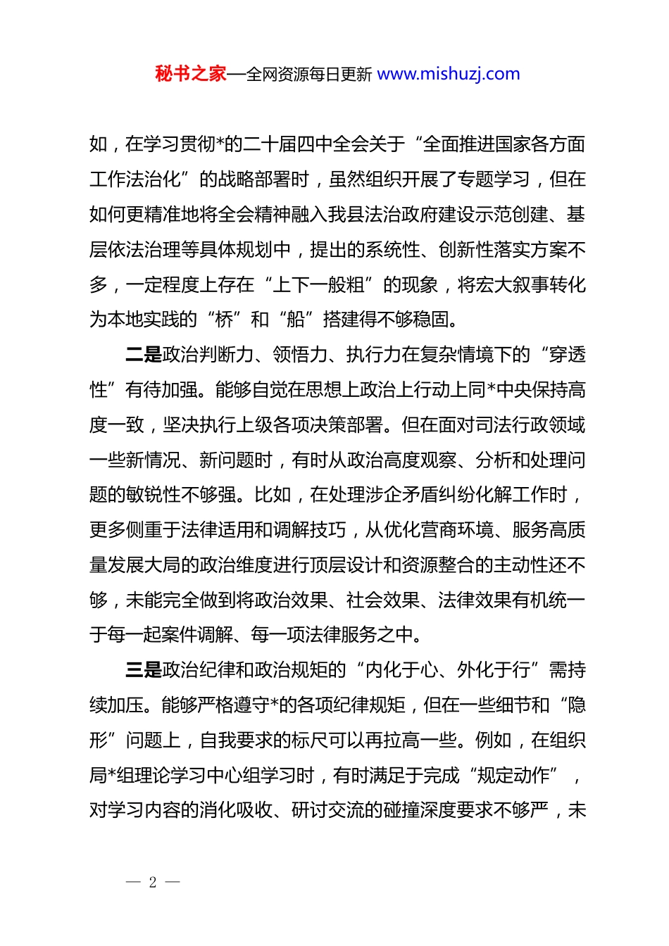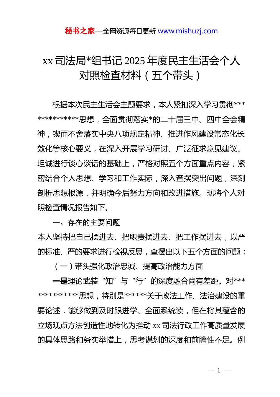 秘书之家—全网资源每日更新 www.mishuzj.comxx 司法局*组书记 2025 年度民主生活会个人对照检查材料(五个带头)根据本次民主生活会主题要求,本人紧扣深入学习贯彻**************思想,全面贯彻落实*的二十届三中、四中全会精神,锲而不舍落实中央八项规定精神、推进作风建设常态化长效化等核心要义,在深入开展学习研讨、广泛征求意见建议、坦诚进行谈心谈话的基础上,严格对照五个方面重点内容,紧密结合个人思想、学习和工作实际,深入查摆突出问题,深刻剖析思想根源,并明确今后努力方向和改进措施。现将个人对照检查情况报告如下。一、存在的主要问题本人坚持把自己摆进去、把职责摆进去、把工作摆进去,以严的标准、严的要求进行检视反思,查摆出以下五个方面的问题:(一)带头强化政治忠诚、提高政治能力方面一是理论武装“知”与“行”的深度融合尚有差距。对**************思想,特别是******关于政法工作、法治建设的重要论述,能够做到及时跟进学、全面系统读,但在将其蕴含的立场观点方法创造性地转化为推动 xx 司法行政工作高质量发展的具体思路和务实举措上,思考谋划的深度和前瞻性不足。例— 1 —秘书之家—全网资源每日更新 www.mishuzj.com如,在学习贯彻*的二十届四中全会关于“全面推进国家各方面工作法治化”的战略部署时,虽然组织开展了专题学习,但在如何更精准地将全会精神融入我县法治政府建设示范创建、基层依法治理等具体规划中,提出的系统性、创新性落实方案不多,一定程度上存在“上下一般粗”的现象,将宏大叙事转化为本地实践的“桥”和“船”搭建得不够稳固。二是政治判断力、领悟力、执行力在复杂情境下的“穿透性”有待加强。能够自觉在思想上政治上行动上同*中央保持高度一致,坚决执行上级各项决策部署。但在面对司法行政领域一些新情况、新问题时,有时从政治高度观察、分析和处理问题的敏锐性不够强。比如,在处理涉企矛盾纠纷化解工作时,更多侧重于法律适用和调解技巧,从优化营商环境、服务高质量发展大局的政治维度进行顶层设计和资源整合的主动性还不够,未能完全做到将政治效果、社会效果、法律效果有机统一于每一起案件调解、每一项法律服务之中。三是政治纪律和政治规矩的“内化于心、外化于行”需持续加压。能够严格遵守*的各项纪律规矩,但在一些细节和“隐形”问题上,自我要求的标尺可以再拉高一些。例如,在组织局*组理论学习中心组学习时,有时满足于完成“规定动作”,对学习内容的消化吸收、研讨交流的碰撞深度要求不够严,未— 2 —秘书之家—全网资源每日更新 www.mishuzj.com能始终以“刨根问底”的精神去探究理论背后的政治逻辑和实践要求,将学习成果转化为班子成员共同政治素养和政治能力的效率有待提升。(二)带头固本培元、增强*性方面一是理想信念教育的“感染力”和“渗透力”需创新提升。坚持把政治修养摆在首位,持续用*的创新理论武装头脑。但在组织带动全局*员干部深化*性锤炼、筑牢信仰之基的方式方法上,传统宣讲、文件学习仍占较大比重,利用本地红色资源开展沉浸式、体验式教学不够充分,运用新媒体技术增强*性教育时代感和吸引力的探索不足。例如,在筹划年度*员教育培训时,虽然安排了*章*规 dj 学习,但如何让抽象的理论条文与司法行政干警的日常工作、内心世界产生更深层次的共鸣,设计的载体和路径还不够鲜活生动。二是*性原则指导“修身律己”的日常化、具体化尚有空间。能够自觉用*性原则约束言行,但在“吾日三省吾身”的自觉性和彻底性上还有提升余地。有时将主要精力放在了业务工作的推进上,反躬自省、主动检视思想“灰尘”、行为“瑕疵”的频次和深度不够。比如,在听取分管领域工作汇报时,有时更关注任务进度和结果,对工作过程中干部思想动态、作风表现的细微变化捕捉不够及时,运用谈心谈话等方式进行*性“体— 3 —秘书之家—全网资源每日更新 www.mishuzj.com检”和“保健”的主动性有待加强。三是“精神追求”与“岗位奉献”的融合转化链条需进一步拧紧。深知共产*人的精神追求最终要落脚于为民奉献、干事创业。但在将崇高的精神追求转化为日常工作中“时时...
