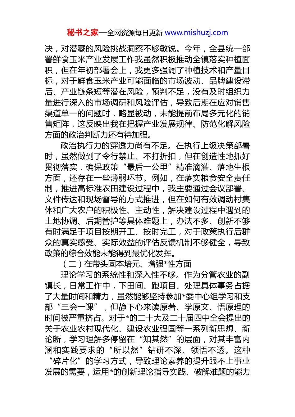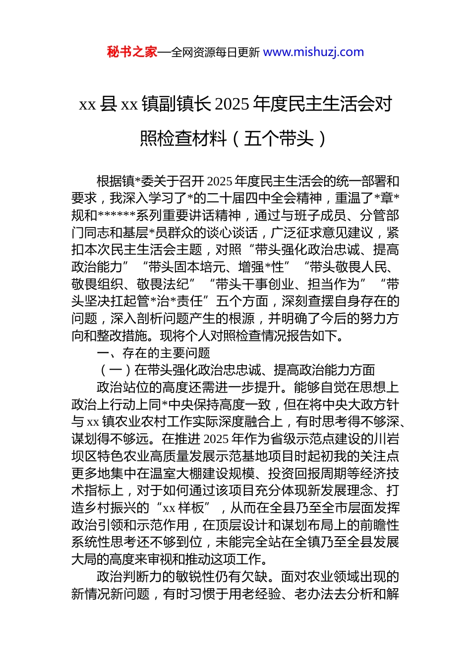 秘书之家—全网资源每日更新 www.mishuzj.comxx 县 xx 镇副镇长 2025 年度民主生活会对照检查材料(五个带头)根据镇*委关于召开 2025 年度民主生活会的统一部署和要求,我深入学习了*的二十届四中全会精神,重温了*章*规和******系列重要讲话精神,通过与班子成员、分管部门同志和基层*员群众的谈心谈话,广泛征求意见建议,紧扣本次民主生活会主题,对照“带头强化政治忠诚、提高政治能力”“带头固本培元、增强*性”“带头敬畏人民、敬畏组织、敬畏法纪”“带头干事创业、担当作为”“带头坚决扛起管*治*责任”五个方面,深刻查摆自身存在的问题,深入剖析问题产生的根源,并明确了今后的努力方向和整改措施。现将个人对照检查情况报告如下。一、存在的主要问题(一)在带头强化政治忠忠诚、提高政治能力方面政治站位的高度还需进一步提升。能够自觉在思想上政治上行动上同*中央保持高度一致,但在将中央大政方针与 xx 镇农业农村工作实际深度融合上,有时思考得不够深、谋划得不够远。在推进 2025 年作为省级示范点建设的川岩坝区特色农业高质量发展示范基地项目时起初我的关注点更多地集中在温室大棚建设规模、投资回报周期等经济技术指标上,对于如何通过该项目充分体现新发展理念、打造乡村振兴的“xx 样板”,从而在全县乃至全市层面发挥政治引领和示范作用,在顶层设计和谋划布局上的前瞻性系统性思考还不够到位,未能完全站在全镇乃至全县发展大局的高度来审视和推动这项工作。政治判断力的敏锐性仍有欠缺。面对农业领域出现的新情况新问题,有时习惯于用老经验、老办法去分析和解秘书之家—全网资源每日更新 www.mishuzj.com决,对潜藏的风险挑战洞察不够敏锐。今年,全县统一部署鲜食玉米产业发展工作我虽然积极推动全镇落实种植面积,但在年初部署会上,我更多强调了种植技术和产量目标,对于鲜食玉米产业可能面临的市场波动、品牌建设滞后、产业链条短等潜在风险,预判不足,没有及时组织力量进行深入的市场调研和风险评估,导致后期在应对销售渠道单一的问题时,略显被动,未能提前布局多元化的销售矩阵,这反映出我在把握产业发展规律、防范化解风险方面的政治判断力还有待加强。政治执行力的穿透力尚有不足。在执行上级决策部署时,虽然做到了令行禁止、不打折扣,但在创造性地抓好贯彻落实,确保政策“最后一公里”精准滴灌、落地生根方面,还存在一些薄弱环节。例如,在落实粮食安全责任制,推进高标准农田建设过程中,我主要通过会议部署、文件传达和现场督导的方式推进,但在如何有效调动村集体和广大农户的积极性、主动性,解决建设过程中遇到的土地协调、后期管护等具体难题上,办法不多、创新不够有时满足于项目按期开工、按时完工,对于政策执行后群众的真实感受、实际效益的评估反馈机制不够健全,导致政策的综合效能未能得到最优化发挥。(二)在带头固本培元、增强*性方面理论学习的系统性和深入性不够。作为分管农业的副镇长,日常工作中,下田间、跑项目、处理具体事务占据了大量时间和精力,虽然能够坚持参加*委中心组学习和支部“三会一课”,但静下心来读原著、学原文、悟原理的时间被严重挤占。对于*的二十大及二十届四中全会提出的关于农业农村现代化、建设农业强国等一系列新思想、新论断,学习理解多停留在“知其然”的层面,对其丰富内涵和实践要求的“所以然”钻研不深、领悟不透。这种“碎片化”的学习方式,导致理论素养的提升跟不上事业发展的需要,运用*的创新理论指导实践、破解难题的能力秘书之家—全网资源每日更新 www.mishuzj.com有待进一步提高。理想信念的锤炼和巩固有所弱化。在长期和平的执政环境下,面对繁杂的日常工作,有时不自觉地产生了“船到码头车到站”的松懈思想,认为自己受*教育多年,理想信念是坚定的,从而放松了对*性的持续改造和锤炼。在工作中,表现为用事务性工作的繁忙代替了*性锻炼的自觉。例如,在推进“万头肉牛”产业工程时,我将主要精力放在了牛舍选址、品种引进、饲料保障等具体环节,但在如何发挥*员养殖大户的先锋模范作用,通过 dj 引领产业发展,把产业基地打造成巩固拓展脱贫...