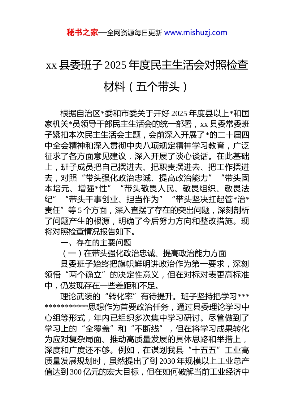 秘书之家—全网资源每日更新 www.mishuzj.comxx 县委班子 2025 年度民主生活会对照检查材料(五个带头)根据自治区*委和市委关于开好 2025 年度县以上*和国家机关*员领导干部民主生活会的统一部署,xx 县委常委班子紧扣本次民主生活会主题,会前深入开展了*的二十届四中全会精神和深入贯彻中央八项规定精神学习教育,广泛征求了各方面意见建议,深入开展了谈心谈话。在此基础上,班子成员把自己摆进去、把职责摆进去、把工作摆进去,对照“带头强化政治忠诚、提高政治能力”“带头固本培元、增强*性”“带头敬畏人民、敬畏组织、敬畏法纪”“带头干事创业、担当作为”“带头坚决扛起管*治*责任”等 5 个方面,深入查摆了存在的突出问题,深刻剖析了问题产生的根源,明确了今后努力方向和整改措施。现将对照检查情况报告如下。一、存在的主要问题(一)在带头强化政治忠诚、提高政治能力方面县委班子始终把旗帜鲜明讲政治作为第一要求,深刻领悟“两个确立”的决定性意义,但在对标对表更高标准中,仍发现存在一些差距和不足。理论武装的“转化率”有待提升。班子坚持把学习**************思想作为首要政治任务,通过县委理论学习中心组等形式,年内已组织多次集中学习研讨。尽管做到了学习上的“全覆盖”和“不断线”,但在将学习成果转化为应对复杂局面、推动高质量发展的具体思路和举措上,深度和广度还不够。例如,在谋划我县“十五五”工业高质量发展规划时,虽然提出了到 2030 年规模以上工业总产值达到 300 亿元的宏大目标,但在如何破解当前工业经济中秘书之家—全网资源每日更新 www.mishuzj.com采矿业占比过高、产业结构单一的深层次矛盾方面,运用新发展理念进行前瞻性、战略性布局的系统思考还不够深入,导致政策举措的创新性和针对性有待进一步加强。贯彻执行的“穿透力”尚有欠缺。对于中央大政方针和自治区*委决策部署,县委班子态度坚决、行动迅速,但在确保政令贯通到底、落地生根的“最后一公里”上,有时存在力度层层递减的现象。在推进“四件大事”、聚力“四个创建”的实践中,宏观层面的部署要求多,但对基层单位如何结合实际创造性地开展工作,所提供的具体指导和有效抓手相对较少。比如,在推动全国民族团结进步模范区创建工作中,虽然开展了形式多样的宣传教育活动但在挖掘和推广能够体现新时代民族团结内涵、具有 xx 特色的典型经验和创新模式方面着力不足,导致创建工作在某些层面还停留在完成“规定动作”上,亮点不够突出。政治风险的“洞察力”需要增强。班子成员普遍具有较强的政治敏锐性,能够有效应对各类显性风险。但在防范化解意识形态、网络安全等领域的潜在风险上,预见性和主动性还需提升。面对网络空间复杂的舆论生态,有时对一些苗头性、倾向性问题未能做到第一时间发现、第一时间研判、第一时间处置,对干部队伍中存在的网络言行不当问题,主要是以事后提醒和批评教育为主,未能建立起一套行之有效的常态化引导和规范机制,在下好先手棋打好主动仗方面存在差距。(二)在带头固本培元、增强*性方面县委班子高度重视*性修养,注重从*的百年奋斗史中汲取智慧和力量,但对照共产*人精神追求,仍感到在某些方面锤炼不够、功夫不深。理想信念的“压舱石”作用发挥不充分。在日常工作中,班子成员能够坚定共产主义远大理想和中国特色社会主义共同理想。但在面对繁重的发展任务和巨大的工作压力时,偶尔会不自觉地将更多精力投入到抓经济指标、推秘书之家—全网资源每日更新 www.mishuzj.com项目建设等具体事务中,例如全力确保地区生产总值同比增长 8%、固定资产投资同比增长 20%等年度预期目标的实现,相对放松了对世界观、人生观、价值观这个“总开关”的经常性审视和改造。这种“重事功、轻内省”的倾向,在一定程度上影响了*性修 ยง 养的持续深化。*内政治生活的“熔炉”作用有待加强。班子严格执行民主生活会、组织生活会等制度,但在开展批评和自我批评时,有时还存在“辣味”不足的现象。自我批评时,谈工作问题多、谈思想根源少;相互批评时,提希望建议多点要害问题少,存在一定的“你好我好大家好”的倾向。...