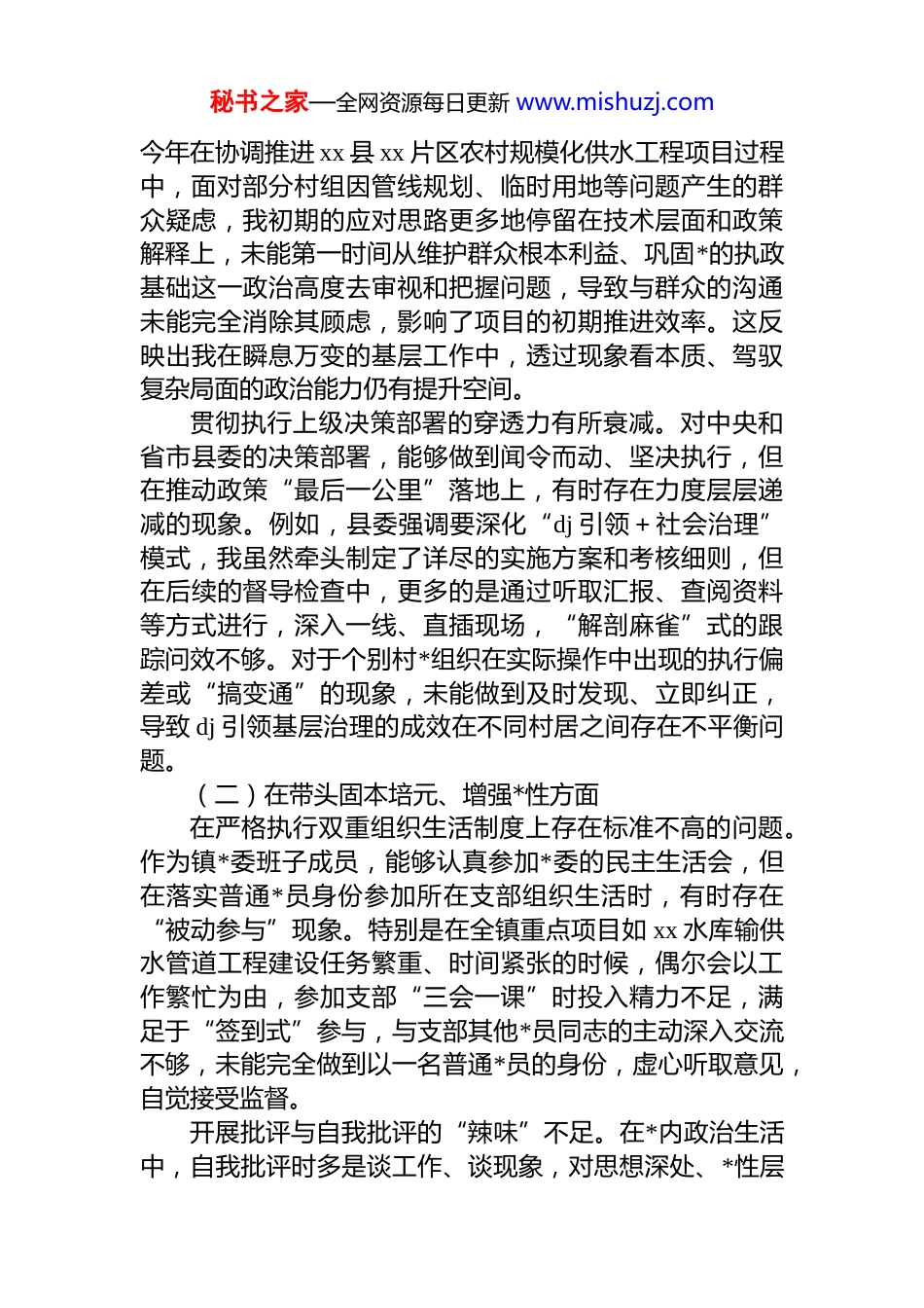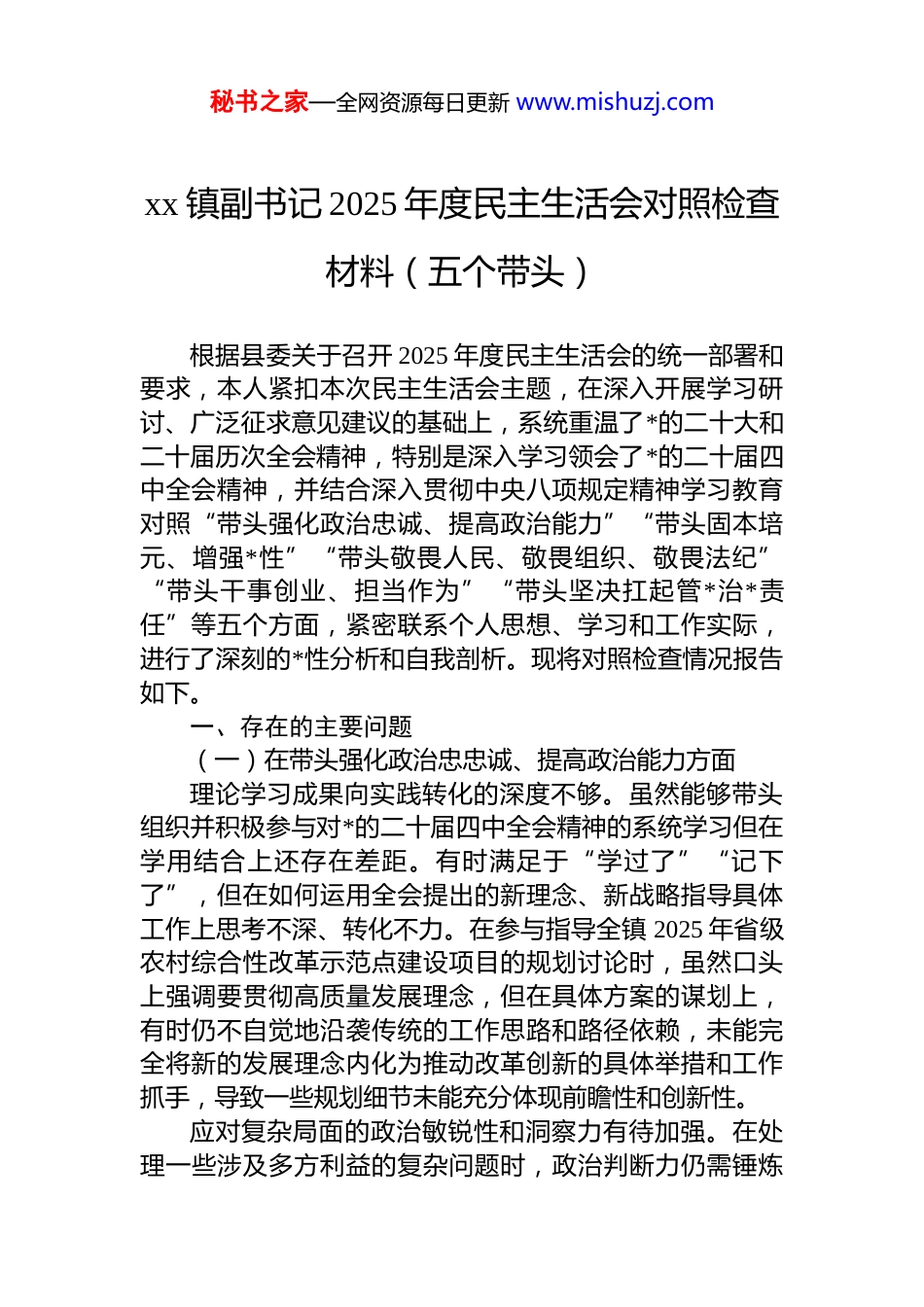 秘书之家—全网资源每日更新 www.mishuzj.comxx 镇副书记 2025 年度民主生活会对照检查材料(五个带头)根据县委关于召开 2025 年度民主生活会的统一部署和要求,本人紧扣本次民主生活会主题,在深入开展学习研讨、广泛征求意见建议的基础上,系统重温了*的二十大和二十届历次全会精神,特别是深入学习领会了*的二十届四中全会精神,并结合深入贯彻中央八项规定精神学习教育对照“带头强化政治忠诚、提高政治能力”“带头固本培元、增强*性”“带头敬畏人民、敬畏组织、敬畏法纪”“带头干事创业、担当作为”“带头坚决扛起管*治*责任”等五个方面,紧密联系个人思想、学习和工作实际,进行了深刻的*性分析和自我剖析。现将对照检查情况报告如下。一、存在的主要问题(一)在带头强化政治忠忠诚、提高政治能力方面理论学习成果向实践转化的深度不够。虽然能够带头组织并积极参与对*的二十届四中全会精神的系统学习但在学用结合上还存在差距。有时满足于“学过了”“记下了”,但在如何运用全会提出的新理念、新战略指导具体工作上思考不深、转化不力。在参与指导全镇 2025 年省级农村综合性改革示范点建设项目的规划讨论时,虽然口头上强调要贯彻高质量发展理念,但在具体方案的谋划上,有时仍不自觉地沿袭传统的工作思路和路径依赖,未能完全将新的发展理念内化为推动改革创新的具体举措和工作抓手,导致一些规划细节未能充分体现前瞻性和创新性。应对复杂局面的政治敏锐性和洞察力有待加强。在处理一些涉及多方利益的复杂问题时,政治判断力仍需锤炼秘书之家—全网资源每日更新 www.mishuzj.com今年在协调推进 xx 县 xx 片区农村规模化供水工程项目过程中,面对部分村组因管线规划、临时用地等问题产生的群众疑虑,我初期的应对思路更多地停留在技术层面和政策解释上,未能第一时间从维护群众根本利益、巩固*的执政基础这一政治高度去审视和把握问题,导致与群众的沟通未能完全消除其顾虑,影响了项目的初期推进效率。这反映出我在瞬息万变的基层工作中,透过现象看本质、驾驭复杂局面的政治能力仍有提升空间。贯彻执行上级决策部署的穿透力有所衰减。对中央和省市县委的决策部署,能够做到闻令而动、坚决执行,但在推动政策“最后一公里”落地上,有时存在力度层层递减的现象。例如,县委强调要深化“dj 引领+社会治理”模式,我虽然牵头制定了详尽的实施方案和考核细则,但在后续的督导检查中,更多的是通过听取汇报、查阅资料等方式进行,深入一线、直插现场,“解剖麻雀”式的跟踪问效不够。对于个别村*组织在实际操作中出现的执行偏差或“搞变通”的现象,未能做到及时发现、立即纠正,导致 dj 引领基层治理的成效在不同村居之间存在不平衡问题。(二)在带头固本培元、增强*性方面在严格执行双重组织生活制度上存在标准不高的问题。作为镇*委班子成员,能够认真参加*委的民主生活会,但在落实普通*员身份参加所在支部组织生活时,有时存在“被动参与”现象。特别是在全镇重点项目如 xx 水库输供水管道工程建设任务繁重、时间紧张的时候,偶尔会以工作繁忙为由,参加支部“三会一课”时投入精力不足,满足于“签到式”参与,与支部其他*员同志的主动深入交流不够,未能完全做到以一名普通*员的身份,虚心听取意见,自觉接受监督。开展批评与自我批评的“辣味”不足。在*内政治生活中,自我批评时多是谈工作、谈现象,对思想深处、*性层秘书之家—全网资源每日更新 www.mishuzj.com面存在的问题剖析不够深刻,有时还存在“闯关”思想。在对同志开展批评时,顾及情面较多,担心影响班子团结与和谐氛围,提出的意见建议多为鼓励性、建议性内容,点问题时比较委婉含蓄,未能真正起到“红脸出汗、排毒治病”的效果,*内政治生活的政治性、原则性、战斗性有所弱化。*性修养的主动锤炼意识有所淡化。日常工作中,抓分管领域的 dj 业务多,抓个人*性修养提升少,把更多的精力投入到了具体的行政事务和项目协调中。习惯于通过集体学习、专题培训等“集中输送”方式接受*性教育,而静下心来读原著、学原文、悟原理的时间被严重挤占,缺乏主动“补钙充电”的紧迫...