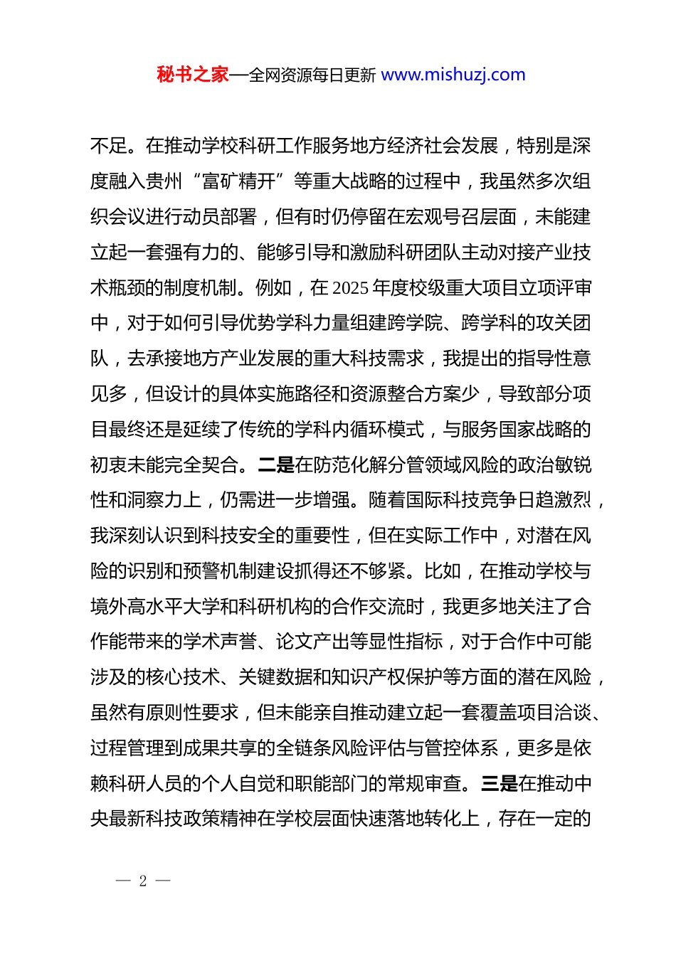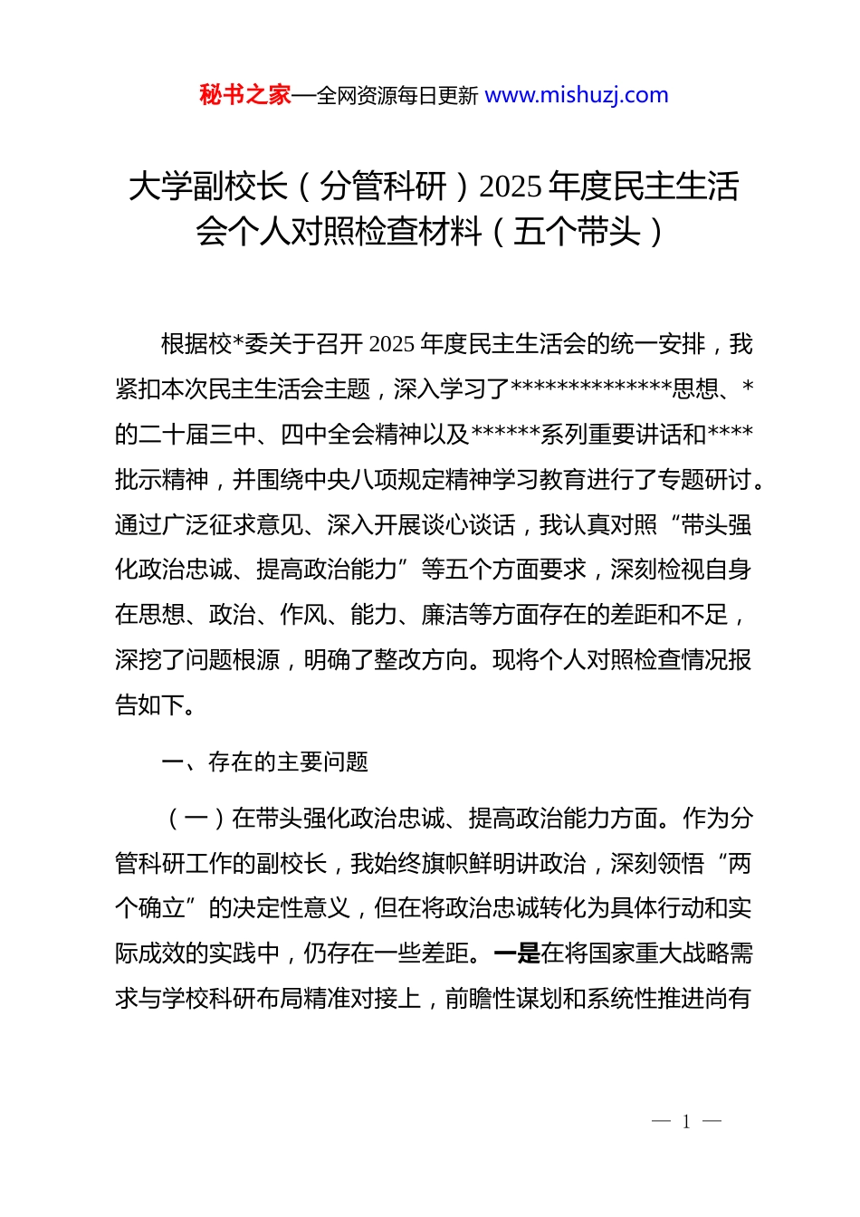 秘书之家—全网资源每日更新 www.mishuzj.com大学副校长(分管科研)2025 年度民主生活会个人对照检查材料(五个带头)根据校*委关于召开 2025 年度民主生活会的统一安排,我紧扣本次民主生活会主题,深入学习了**************思想、*的二十届三中、四中全会精神以及******系列重要讲话和****批示精神,并围绕中央八项规定精神学习教育进行了专题研讨。通过广泛征求意见、深入开展谈心谈话,我认真对照“带头强化政治忠诚、提高政治能力”等五个方面要求,深刻检视自身在思想、政治、作风、能力、廉洁等方面存在的差距和不足,深挖了问题根源,明确了整改方向。现将个人对照检查情况报告如下。一、存在的主要问题(一)在带头强化政治忠诚、提高政治能力方面。作为分管科研工作的副校长,我始终旗帜鲜明讲政治,深刻领悟“两个确立”的决定性意义,但在将政治忠诚转化为具体行动和实际成效的实践中,仍存在一些差距。一是在将国家重大战略需求与学校科研布局精准对接上,前瞻性谋划和系统性推进尚有— 1 —秘书之家—全网资源每日更新 www.mishuzj.com不足。在推动学校科研工作服务地方经济社会发展,特别是深度融入贵州“富矿精开”等重大战略的过程中,我虽然多次组织会议进行动员部署,但有时仍停留在宏观号召层面,未能建立起一套强有力的、能够引导和激励科研团队主动对接产业技术瓶颈的制度机制。例如,在 2025 年度校级重大项目立项评审中,对于如何引导优势学科力量组建跨学院、跨学科的攻关团队,去承接地方产业发展的重大科技需求,我提出的指导性意见多,但设计的具体实施路径和资源整合方案少,导致部分项目最终还是延续了传统的学科内循环模式,与服务国家战略的初衷未能完全契合。二是在防范化解分管领域风险的政治敏锐性和洞察力上,仍需进一步增强。随着国际科技竞争日趋激烈,我深刻认识到科技安全的重要性,但在实际工作中,对潜在风险的识别和预警机制建设抓得还不够紧。比如,在推动学校与境外高水平大学和科研机构的合作交流时,我更多地关注了合作能带来的学术声誉、论文产出等显性指标,对于合作中可能涉及的核心技术、关键数据和知识产权保护等方面的潜在风险,虽然有原则性要求,但未能亲自推动建立起一套覆盖项目洽谈、过程管理到成果共享的全链条风险评估与管控体系,更多是依赖科研人员的个人自觉和职能部门的常规审查。三是在推动中央最新科技政策精神在学校层面快速落地转化上,存在一定的— 2 —秘书之家—全网资源每日更新 www.mishuzj.com“时差”和“温差”。面对国家近年来密集出台的关于深化科技体制改革、完善科研项目和经费管理等一系列新政策新举措,我虽然组织了学习和传达,但在推动学校相关管理制度的“废改立”工作中,有时因追求方案的尽善尽美、力求平衡各方意见,导致文件出台的周期偏长。例如,针对国家提出的科研经费“包干制”改革,我校的具体实施细则在经过多轮征求意见和反复修改后,才于政策发布数月后正式印发,这在一定程度上影响了一线科研人员及时享受改革红利,开展科研活动的灵活性也受到了短暂的束缚。(二)在带头固本培元、增强*性方面。我始终坚持用**************思想凝心铸魂,但在将*性修养内化于心、外化于行的过程中,思想淬炼和政治历练的深度仍有欠缺。一是将思想政治教育融入科研工作的结合点找得不够准,未能实现同频共振。在日常管理中,我习惯于通过召开业务会议、部署科研任务来推动工作,虽然也会在会上传达学习上级精神,但往往是“为学习而学习”,未能将理想信念教育、科学精神和科学家精神培育,与解决科研诚信、学术风气等现实问题紧密结合起来。当学校出现个别科研人员学术不端行为的苗头时我的处理方式更多侧重于依规进行行政处分和通报批评,而对于问题背— 3 —秘书之家—全网资源每日更新 www.mishuzj.com后反映出的部分青年教师和研究生在价值追求、精神世界方面的偏差,未能及时组织力量进行深入的思想根源剖析,开展有针对性的、触及灵魂的警示教育,导致思想政治工作的穿透力和感染力不足。二是在攻坚克难中发扬彻底的自我革命精神不够,面对积弊已久的难题存在畏难情...