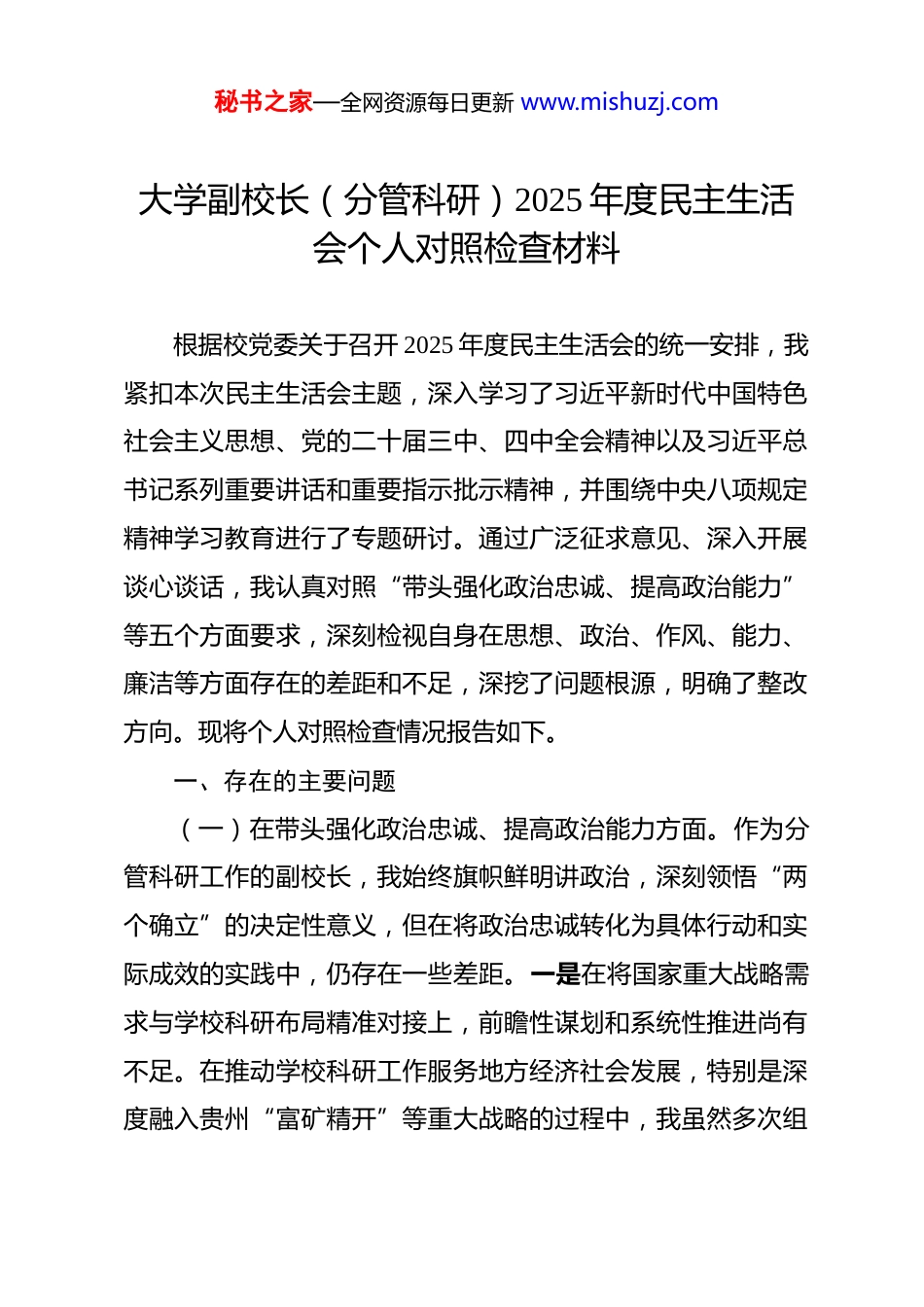 秘书之家—全网资源每日更新 www.mishuzj.com大学副校长(分管科研)2025 年度民主生活会个人对照检查材料 根据校党委关于召开 2025 年度民主生活会的统一安排,我紧扣本次民主生活会主题,深入学习了习近平新时代中国特色社会主义思想、党的二十届三中、四中全会精神以及习近平总书记系列重要讲话和重要指示批示精神,并围绕中央八项规定精神学习教育进行了专题研讨。通过广泛征求意见、深入开展谈心谈话,我认真对照“带头强化政治忠诚、提高政治能力”等五个方面要求,深刻检视自身在思想、政治、作风、能力、廉洁等方面存在的差距和不足,深挖了问题根源,明确了整改方向。现将个人对照检查情况报告如下。一、存在的主要问题(一)在带头强化政治忠诚、提高政治能力方面。作为分管科研工作的副校长,我始终旗帜鲜明讲政治,深刻领悟“两个确立”的决定性意义,但在将政治忠诚转化为具体行动和实际成效的实践中,仍存在一些差距。一是在将国家重大战略需求与学校科研布局精准对接上,前瞻性谋划和系统性推进尚有不足。在推动学校科研工作服务地方经济社会发展,特别是深度融入贵州“富矿精开”等重大战略的过程中,我虽然多次组秘书之家—全网资源每日更新 www.mishuzj.com织会议进行动员部署,但有时仍停留在宏观号召层面,未能建立起一套强有力的、能够引导和激励科研团队主动对接产业技术瓶颈的制度机制。例如,在 2025 年度校级重大项目立项评审中,对于如何引导优势学科力量组建跨学院、跨学科的攻关团队,去承接地方产业发展的重大科技需求,我提出的指导性意见多,但设计的具体实施路径和资源整合方案少,导致部分项目最终还是延续了传统的学科内循环模式,与服务国家战略的初衷未能完全契合。二是在防范化解分管领域风险的政治敏锐性和洞察力上,仍需进一步增强。随着国际科技竞争日趋激烈,我深刻认识到科技安全的重要性,但在实际工作中,对潜在风险的识别和预警机制建设抓得还不够紧。比如,在推动学校与境外高水平大学和科研机构的合作交流时,我更多地关注了合作能带来的学术声誉、论文产出等显性指标,对于合作中可能涉及的核心技术、关键数据和知识产权保护等方面的潜在风险,虽然有原则性要求,但未能亲自推动建立起一套覆盖项目洽谈、过程管理到成果共享的全链条风险评估与管控体系,更多是依赖科研人员的个人自觉和职能部门的常规审查。三是在推动中央最新科技政策精神在学校层面快速落地转化上,存在一定的“时差”和“温差”。面对国家近年来密集出台的关于深化科技体制改革、完善科研项目和经费管理等一系列新政策新举措,秘书之家—全网资源每日更新 www.mishuzj.com我虽然组织了学习和传达,但在推动学校相关管理制度的“废改立”工作中,有时因追求方案的尽善尽美、力求平衡各方意见,导致文件出台的周期偏长。例如,针对国家提出的科研经费“包干制”改革,我校的具体实施细则在经过多轮征求意见和反复修改后,才于政策发布数月后正式印发,这在一定程度上影响了一线科研人员及时享受改革红利,开展科研活动的灵活性也受到了短暂的束缚。(二)在带头固本培元、增强党性方面。我始终坚持用习近平新时代中国特色社会主义思想凝心铸魂,但在将党性修养内化于心、外化于行的过程中,思想淬炼和政治历练的深度仍有欠缺。一是将思想政治教育融入科研工作的结合点找得不够准,未能实现同频共振。在日常管理中,我习惯于通过召开业务会议、部署科研任务来推动工作,虽然也会在会上传达学习上级精神,但往往是“为学习而学习”,未能将理想信念教育、科学精神和科学家精神培育,与解决科研诚信、学术风气等现实问题紧密结合起来。当学校出现个别科研人员学术不端行为的苗头时我的处理方式更多侧重于依规进行行政处分和通报批评,而对于问题背后反映出的部分青年教师和研究生在价值追求、精神世界方面的偏差,未能及时组织力量进行深入的思想根源剖析,开展有针对性的、触及灵魂的警示教育,导致思想秘书之家—全网资源每日更新 www.mishuzj.com政治工作的穿透力和感染力不足。二是在攻坚克难中发扬彻底的自我革命精神不够,面对积弊已久的难题存在畏...