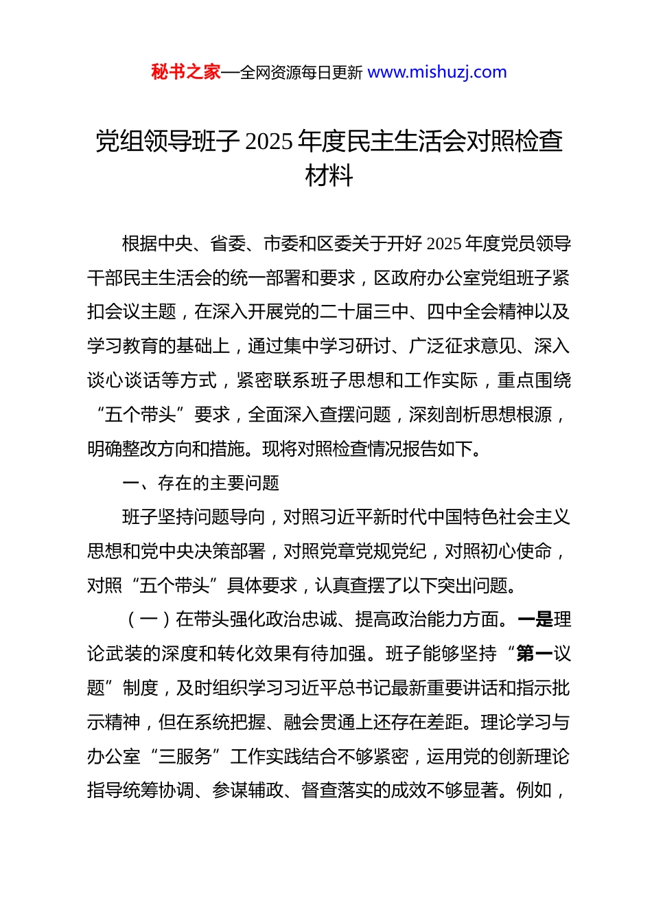 秘书之家—全网资源每日更新 www.mishuzj.com党组领导班子 2025 年度民主生活会对照检查材料 根据中央、省委、市委和区委关于开好 2025 年度党员领导干部民主生活会的统一部署和要求,区政府办公室党组班子紧扣会议主题,在深入开展党的二十届三中、四中全会精神以及学习教育的基础上,通过集中学习研讨、广泛征求意见、深入谈心谈话等方式,紧密联系班子思想和工作实际,重点围绕“五个带头”要求,全面深入查摆问题,深刻剖析思想根源,明确整改方向和措施。现将对照检查情况报告如下。一、存在的主要问题班子坚持问题导向,对照习近平新时代中国特色社会主义思想和党中央决策部署,对照党章党规党纪,对照初心使命,对照“五个带头”具体要求,认真查摆了以下突出问题。(一)在带头强化政治忠诚、提高政治能力方面。一是理论武装的深度和转化效果有待加强。班子能够坚持“第一议题”制度,及时组织学习习近平总书记最新重要讲话和指示批示精神,但在系统把握、融会贯通上还存在差距。理论学习与办公室“三服务”工作实践结合不够紧密,运用党的创新理论指导统筹协调、参谋辅政、督查落实的成效不够显著。例如,秘书之家—全网资源每日更新 www.mishuzj.com在服务区领导围绕“十五五”规划前期调研时,提出的对策建议有时偏重于具体事务层面,从政治高度观察、分析和处理经济社会复杂问题的穿透力不足,未能完全做到将上级精神与区域实际创造性结合,提出具有前瞻性、战略性的决策参考。二是政治判断力、领悟力、执行力需持续提升。班子能够自觉在思想上政治上行动上同党中央保持高度一致,坚决贯彻执行中央大政方针和省委、市委、区委决策部署。但在面对复杂严峻形势和繁重工作任务时,个别班子成员有时存在一定的思维惯性和路径依赖,对决策部署的政治意图、战略考量领悟不够深透,导致在推动落实过程中,有时过于强调程序合规和环节完整,未能完全从政治效果、发展效果、群众效果相统一的角度去优化流程、提升效率。例如,在协调推进某项跨部门重点改革任务时,前期更侧重于会议部署和文件流转,对于改革可能触及的深层次矛盾和潜在风险,进行政治研判和主动预判的敏锐性、主动性有待加强。三是政治纪律和政治规矩的日常监督提醒需更加严格。班子成员能够严守党的政治纪律和政治规矩,但在抓常抓长、落细落小上仍有提升空间。对党员干部的日常教育管理监督中,有时更多关注业务能力和工作完成情况,对干部在非正式场合、网络空间的言行是否符合政治要求,关注和提醒不够及时、不够直接。例如,在组织生活会上开展批评秘书之家—全网资源每日更新 www.mishuzj.com与自我批评时,有时存在“和气”思想,相互提醒涉及政治原则、政治方向的问题不够尖锐、不够具体,“红脸出汗”的效果尚未完全达到。(二)在带头固本培元、增强党性方面。一是党性锤炼的常态化、制度化落实不够均衡。班子能够坚持把政治建设摆在首位,定期开展理论学习中心组学习,但学习形式有时相对单一,研讨交流的深度和思想碰撞的强度有待提升。班子成员以普通党员身份参加所在支部组织生活的主动性、规范性有时不足,与支部党员开展思想交流、接受群众监督的自觉性有待增强。例如,在落实“三会一课”制度过程中,班子成员带头讲党课多侧重于政策解读和工作要求,结合自身思想实际、成长经历进行党性剖析,分享内心感悟、触动思想灵魂的深度还不够。二是理想信念的内化转化需进一步深化。班子成员能够坚定马克思主义信仰和共产主义信念,但在应对长期性、复杂性的工作挑战时,个别同志有时会不自觉地产生畏难情绪或求稳心态,攻坚克难的锐气和斗志有所衰减。世界观、人生观、价值观这个“总开关”拧得不够紧,有时在对待个人名利、进退留转问题上,虽然能顾全大局,但内心深处偶尔仍有细微波动,反映出理想信念的根基需要持续加固。例如,在面对办公室长期存在的“人少事多”结构性矛盾时,有时倾向于通过加班加秘书之家—全网资源每日更新 www.mishuzj.com点等传统方式应对,在如何通过机制创新、流程再造从根本上提升效能方面,主动探索、大胆创新的劲头还显不足。三是宗旨意识践行存在“温差”...