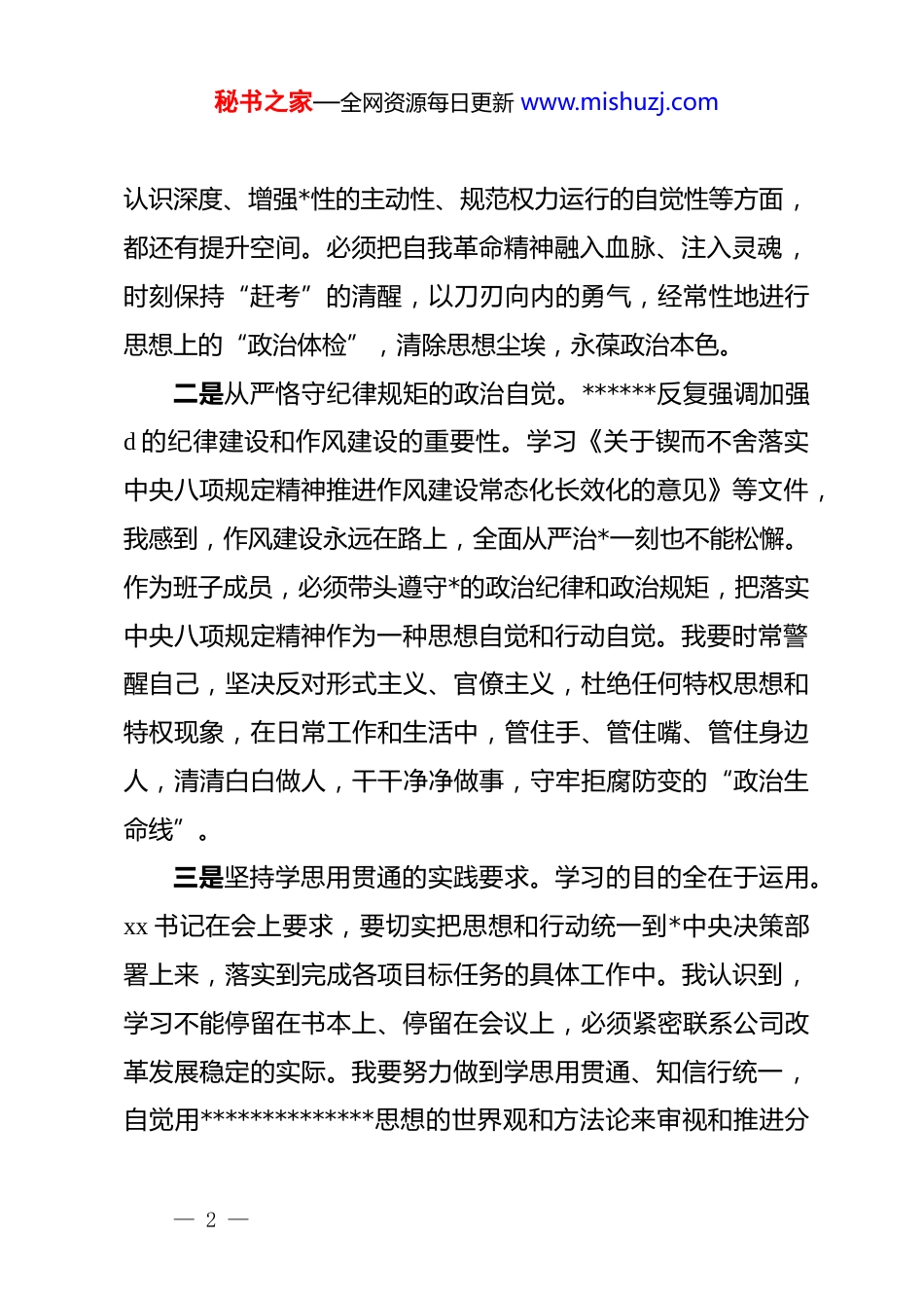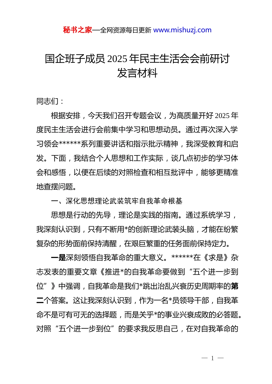 秘书之家—全网资源每日更新 www.mishuzj.com国企班子成员 2025 年民主生活会会前研讨发言材料同志们:根据安排,今天我们召开专题会议,为高质量开好 2025 年度民主生活会进行会前集中学习和思想动员。通过再次深入学习领会******系列重要讲话和指示批示精神,我深受教育和启发。下面,我结合个人思想和工作实际,谈几点初步的学习体会和感悟,以便在后续的对照检查和相互批评中,能够更精准地查摆问题。一、深化思想理论武装筑牢自我革命根基思想是行动的先导,理论是实践的指南。通过系统学习,我深刻认识到,只有不断用*的创新理论武装头脑,才能在纷繁复杂的形势面前保持清醒,在艰巨繁重的任务面前保持定力。一是深刻领悟自我革命的重大意义。******在《求是》杂志发表的重要文章《推进*的自我革命要做到“五个进一步到位”》中强调,自我革命是我们*跳出治乱兴衰历史周期率的第二个答案。这让我深刻认识到,作为一名*员领导干部,自我革命不是可有可无的选择题,而是关乎*的事业兴衰成败的必答题。对照“五个进一步到位”的要求我反思自己,在对自我革命的— 1 —秘书之家—全网资源每日更新 www.mishuzj.com认识深度、增强*性的主动性、规范权力运行的自觉性等方面,都还有提升空间。必须把自我革命精神融入血脉、注入灵魂,时刻保持“赶考”的清醒,以刀刃向内的勇气,经常性地进行思想上的“政治体检”,清除思想尘埃,永葆政治本色。二是从严恪守纪律规矩的政治自觉。******反复强调加强d 的纪律建设和作风建设的重要性。学习《关于锲而不舍落实中央八项规定精神推进作风建设常态化长效化的意见》等文件,我感到,作风建设永远在路上,全面从严治*一刻也不能松懈。作为班子成员,必须带头遵守*的政治纪律和政治规矩,把落实中央八项规定精神作为一种思想自觉和行动自觉。我要时常警醒自己,坚决反对形式主义、官僚主义,杜绝任何特权思想和特权现象,在日常工作和生活中,管住手、管住嘴、管住身边人,清清白白做人,干干净净做事,守牢拒腐防变的“政治生命线”。三是坚持学思用贯通的实践要求。学习的目的全在于运用。xx 书记在会上要求,要切实把思想和行动统一到*中央决策部署上来,落实到完成各项目标任务的具体工作中。我认识到,学习不能停留在书本上、停留在会议上,必须紧密联系公司改革发展稳定的实际。我要努力做到学思用贯通、知信行统一,自觉用**************思想的世界观和方法论来审视和推进分— 2 —秘书之家—全网资源每日更新 www.mishuzj.com管领域的工作,主动在思想观念、工作思路和方式方法上进行自我革新,力求将学习成果转化为破解难题、推动发展的实际能力,避免学用“两张皮”的现象。二、把握战略发展要义强化使命担当作为2026 年是实施“十五五”规划的开局之年,面对新形势、新任务,必须胸怀“国之大者”,精准把握国家和集团的战略意图,才能找准自身定位,更好地履职尽责。一是把握扩大内需战略的时代机遇。******指出,扩大内需是战略之举。2026 年的中央经济工作会议也将扩大内需作为经济工作的首要任务。作为身处基础设施建设领域的企业,这既是重大机遇,更是重大责任。我深刻认识到,自己不能简单地将国家战略看作是宏观政策,而必须深入思考其对行业、对公司的深远影响。尤其是在交通、能源、水利以及新型基础设施等领域,国家正通过“两重”工程等方式加大投资力度。我需要加强对这些政策的研判,思考如何引导分管业务顺应大势,在服务国家战略中实现企业的高质量发展,这对我个人的战略思维和前瞻能力提出了更高的要求。二是坚决贯彻集团战略部署的行动自觉。集团《全面落实“666”战略框架与“545”建设目标暨全面加快高质量发展、建设世界一流企业的总体指导意见》是指导我们未来发展的“作— 3 —秘书之家—全网资源每日更新 www.mishuzj.com战蓝图”。学习之后,我感到使命光荣、责任重大。作为公司领导班子的一员,我必须带头深学细悟,不能满足于一知半解,而是要真正将“666”战略框架和“545”建设目标内化于心、外化于行。我将对照集团的战略要求,认真审视自身在思想格局、能力素质、担当精神等...