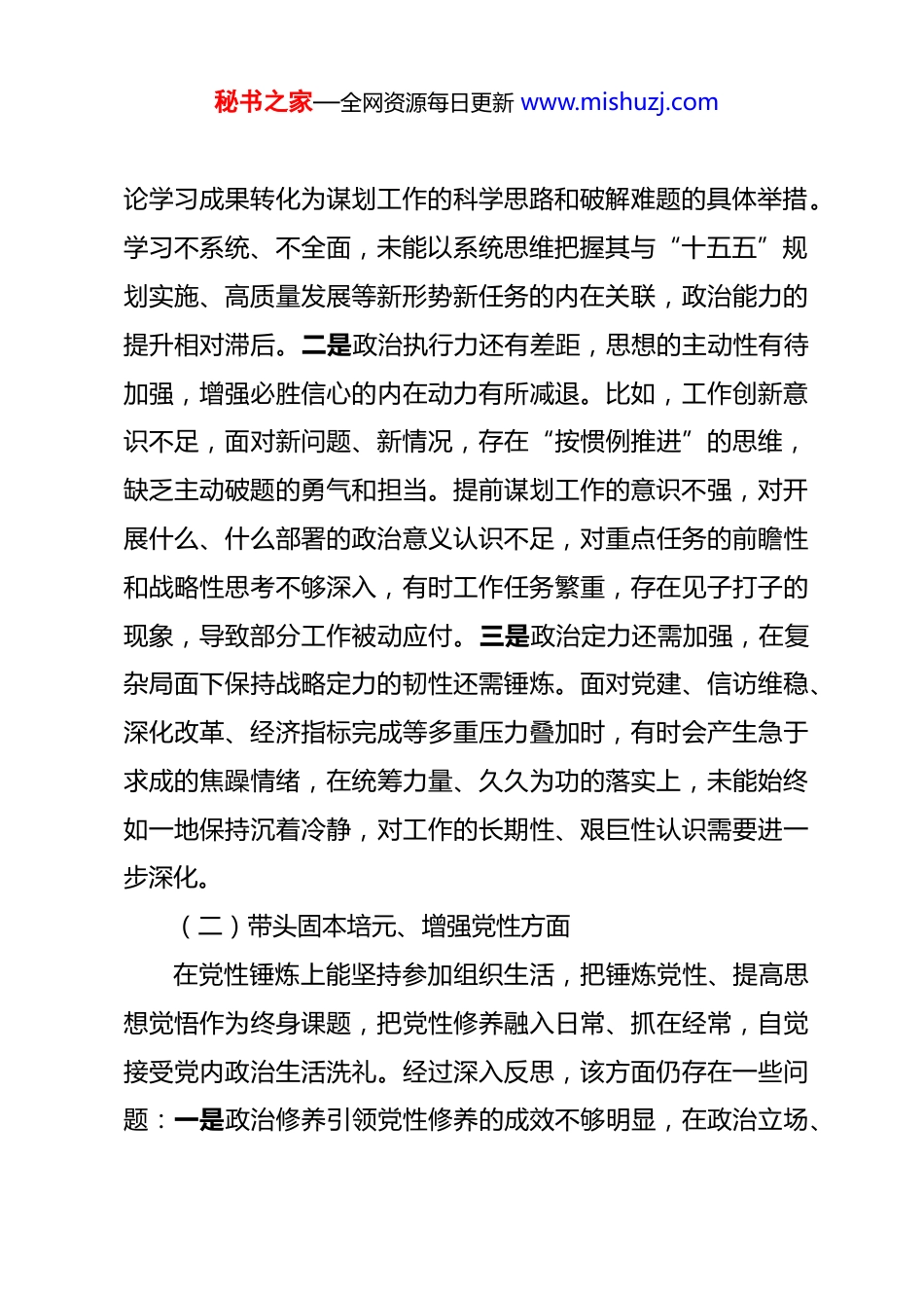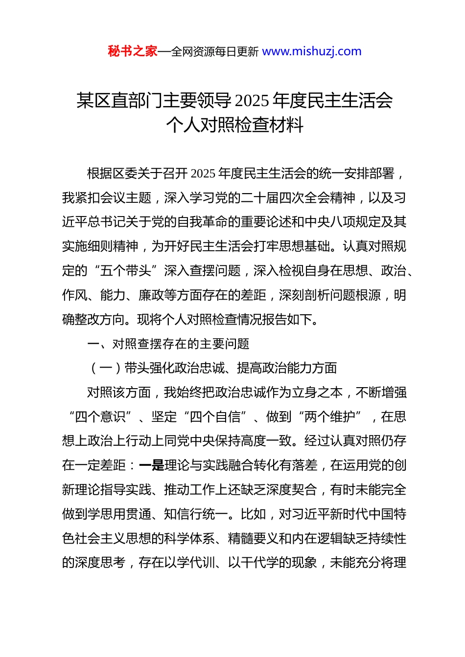 秘书之家—全网资源每日更新 www.mishuzj.com某区直部门主要领导 2025 年度民主生活会个人对照检查材料 根据区委关于召开 2025 年度民主生活会的统一安排部署,我紧扣会议主题,深入学习党的二十届四次全会精神,以及习近平总书记关于党的自我革命的重要论述和中央八项规定及其实施细则精神,为开好民主生活会打牢思想基础。认真对照规定的“五个带头”深入查摆问题,深入检视自身在思想、政治、作风、能力、廉政等方面存在的差距,深刻剖析问题根源,明确整改方向。现将个人对照检查情况报告如下。一、对照查摆存在的主要问题(一)带头强化政治忠诚、提高政治能力方面对照该方面,我始终把政治忠诚作为立身之本,不断增强“四个意识”、坚定“四个自信”、做到“两个维护”,在思想上政治上行动上同党中央保持高度一致。经过认真对照仍存在一定差距:一是理论与实践融合转化有落差,在运用党的创新理论指导实践、推动工作上还缺乏深度契合,有时未能完全做到学思用贯通、知信行统一。比如,对习近平新时代中国特色社会主义思想的科学体系、精髓要义和内在逻辑缺乏持续性的深度思考,存在以学代训、以干代学的现象,未能充分将理秘书之家—全网资源每日更新 www.mishuzj.com论学习成果转化为谋划工作的科学思路和破解难题的具体举措。学习不系统、不全面,未能以系统思维把握其与“十五五”规划实施、高质量发展等新形势新任务的内在关联,政治能力的提升相对滞后。二是政治执行力还有差距,思想的主动性有待加强,增强必胜信心的内在动力有所减退。比如,工作创新意识不足,面对新问题、新情况,存在“按惯例推进”的思维,缺乏主动破题的勇气和担当。提前谋划工作的意识不强,对开展什么、什么部署的政治意义认识不足,对重点任务的前瞻性和战略性思考不够深入,有时工作任务繁重,存在见子打子的现象,导致部分工作被动应付。三是政治定力还需加强,在复杂局面下保持战略定力的韧性还需锤炼。面对党建、信访维稳、深化改革、经济指标完成等多重压力叠加时,有时会产生急于求成的焦躁情绪,在统筹力量、久久为功的落实上,未能始终如一地保持沉着冷静,对工作的长期性、艰巨性认识需要进一步深化。(二)带头固本培元、增强党性方面在党性锤炼上能坚持参加组织生活,把锤炼党性、提高思想觉悟作为终身课题,把党性修养融入日常、抓在经常,自觉接受党内政治生活洗礼。经过深入反思,该方面仍存在一些问题:一是政治修养引领党性修养的成效不够明显,在政治立场、秘书之家—全网资源每日更新 www.mishuzj.com政治方向、政治原则上的深层次把握还不够精准,自我革命要求落实不够到位。比如,在党性修养锤炼中,未能始终把政治修养摆在首位,没有充分意识到政治修养是党性修养的核心和灵魂,导致党性锤炼缺乏鲜明的政治导向。在深入贯彻中央八项规定精神学习教育期间,落实一体推进“学查改”上仍存在“学归学、做归做”现象,未能真正将纪律要求内化为思想自觉和行动自觉。尤其是查的方面,在自查自纠中存在避重就轻、浮于表面的情况,对深层次问题挖掘不够,整改落实缺乏一抓到底的韧劲。二是敢于攻坚克难的斗争精神有所弱化,运用党的创新理论指导实践、破解难题的穿透力尚有不足。比如,学习 2025 年中央经济工作会议提出的“五个必须”要求时,仅停留在文字记忆层面,没有结合什么工作深入分析实践路径,缺乏一定的政治高度和战略考量。对习近平总书记关于“保持战略定力”的重要论述理解不够透彻,在面对什么问题时,思想上出现焦虑情绪,未能从“以苦练内功应对外部挑战”的要求出发谋划长效应对举措。在学习党的二十届四中全会审议通过的“十五五”规划建议时,缺乏联系实际的深度思考,对推动本领域深化改革战略任务、主要举措等要求把握不准,在推进什么改革时举措乏力。三是理论学习深钻细研的主动性不足,对政治理论学习锤炼党性的重要性认识不够,理想信念内化于秘书之家—全网资源每日更新 www.mishuzj.com心、外化于行的标杆作用发挥不够充分。比如,作为主要领导,带头参加组织生活的次数相对来说不够经常,以普通党员身份参与支部组织的交流研讨、现场...