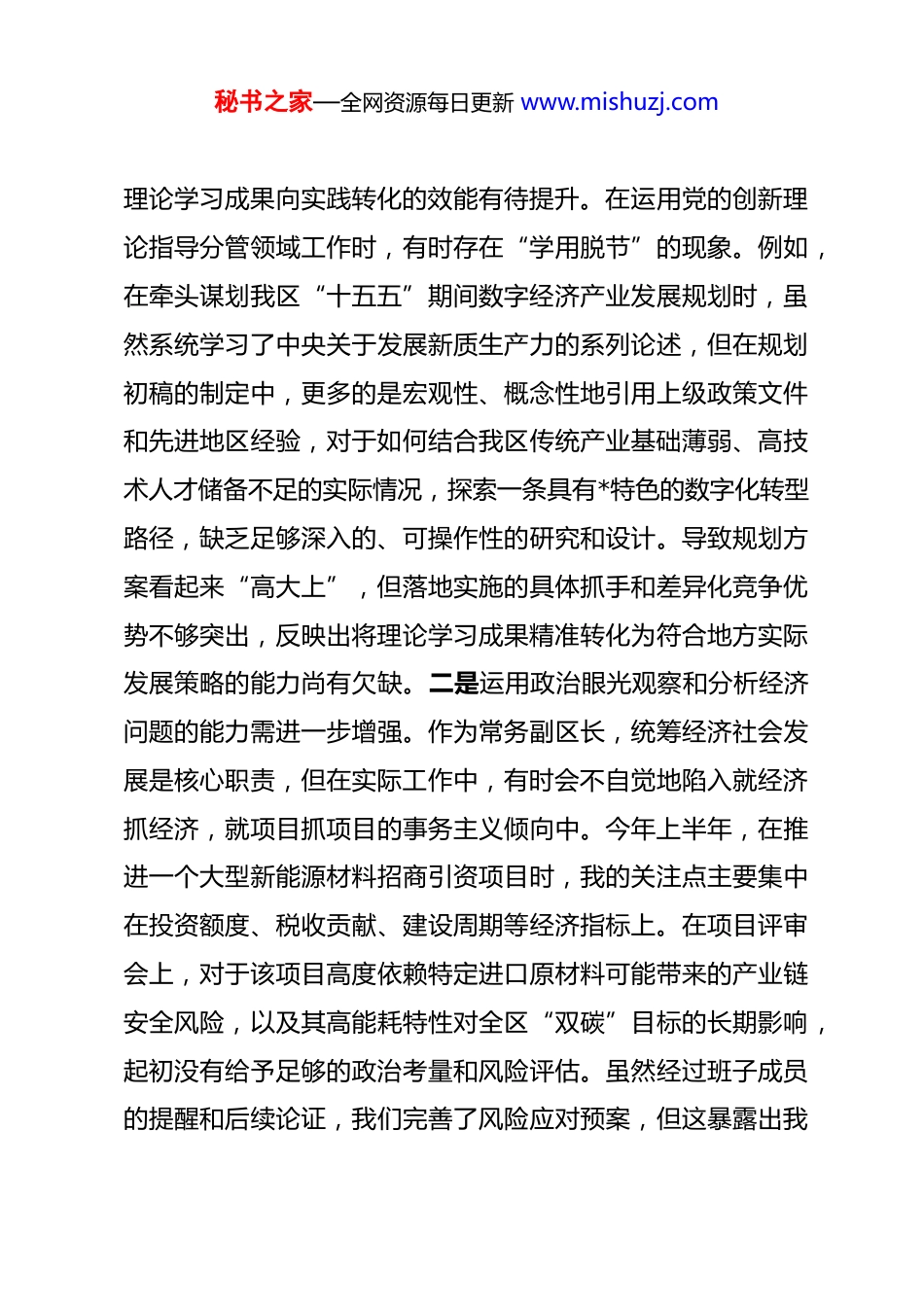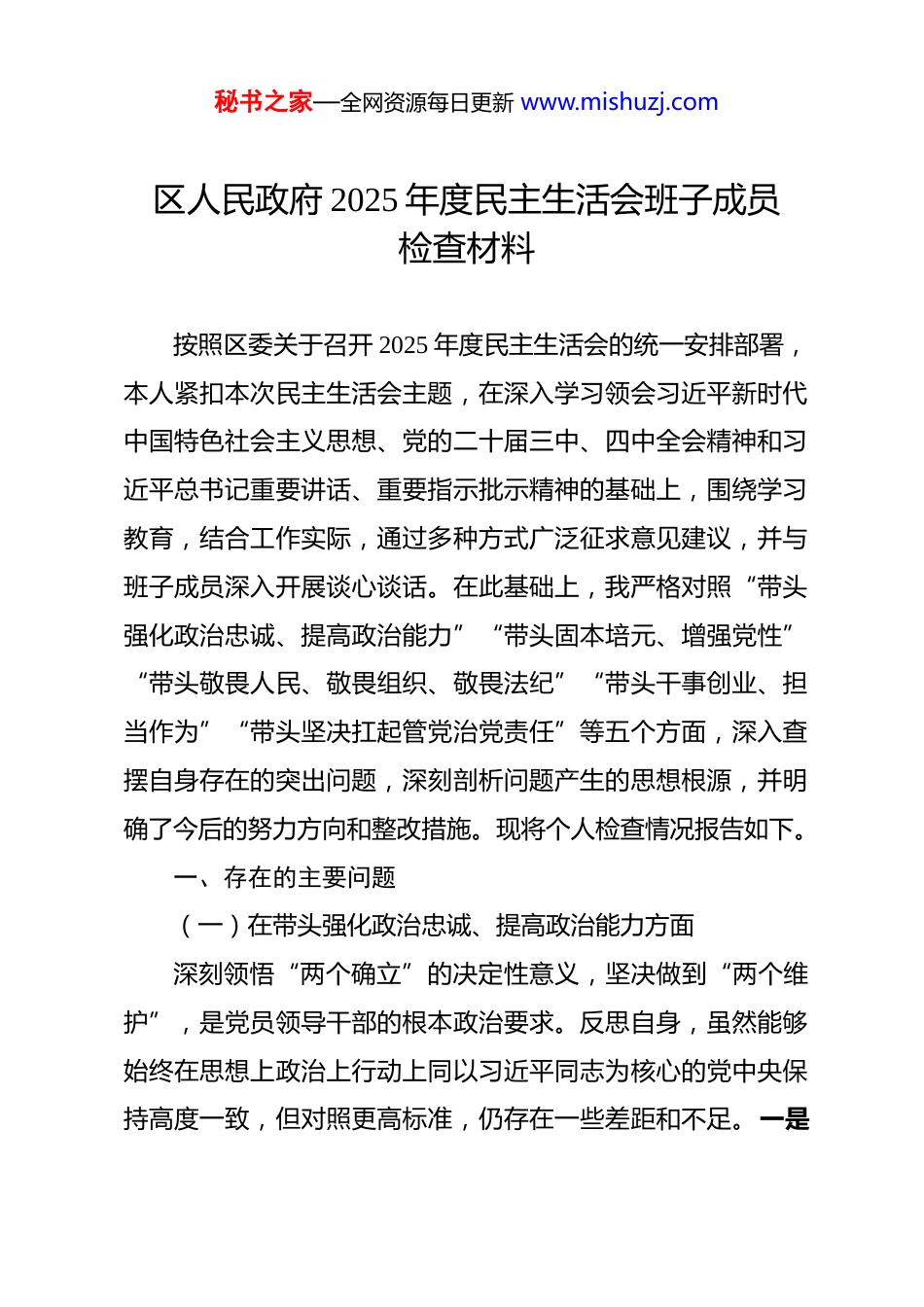 秘书之家—全网资源每日更新 www.mishuzj.com区人民政府 2025 年度民主生活会班子成员检查材料 按照区委关于召开 2025 年度民主生活会的统一安排部署,本人紧扣本次民主生活会主题,在深入学习领会习近平新时代中国特色社会主义思想、党的二十届三中、四中全会精神和习近平总书记重要讲话、重要指示批示精神的基础上,围绕学习教育,结合工作实际,通过多种方式广泛征求意见建议,并与班子成员深入开展谈心谈话。在此基础上,我严格对照“带头强化政治忠诚、提高政治能力”“带头固本培元、增强党性”“带头敬畏人民、敬畏组织、敬畏法纪”“带头干事创业、担当作为”“带头坚决扛起管党治党责任”等五个方面,深入查摆自身存在的突出问题,深刻剖析问题产生的思想根源,并明确了今后的努力方向和整改措施。现将个人检查情况报告如下。一、存在的主要问题(一)在带头强化政治忠诚、提高政治能力方面深刻领悟“两个确立”的决定性意义,坚决做到“两个维护”,是党员领导干部的根本政治要求。反思自身,虽然能够始终在思想上政治上行动上同以习近平同志为核心的党中央保持高度一致,但对照更高标准,仍存在一些差距和不足。一是秘书之家—全网资源每日更新 www.mishuzj.com理论学习成果向实践转化的效能有待提升。在运用党的创新理论指导分管领域工作时,有时存在“学用脱节”的现象。例如,在牵头谋划我区“十五五”期间数字经济产业发展规划时,虽然系统学习了中央关于发展新质生产力的系列论述,但在规划初稿的制定中,更多的是宏观性、概念性地引用上级政策文件和先进地区经验,对于如何结合我区传统产业基础薄弱、高技术人才储备不足的实际情况,探索一条具有*特色的数字化转型路径,缺乏足够深入的、可操作性的研究和设计。导致规划方案看起来“高大上”,但落地实施的具体抓手和差异化竞争优势不够突出,反映出将理论学习成果精准转化为符合地方实际发展策略的能力尚有欠缺。二是运用政治眼光观察和分析经济问题的能力需进一步增强。作为常务副区长,统筹经济社会发展是核心职责,但在实际工作中,有时会不自觉地陷入就经济抓经济,就项目抓项目的事务主义倾向中。今年上半年,在推进一个大型新能源材料招商引资项目时,我的关注点主要集中在投资额度、税收贡献、建设周期等经济指标上。在项目评审会上,对于该项目高度依赖特定进口原材料可能带来的产业链安全风险,以及其高能耗特性对全区“双碳”目标的长期影响,起初没有给予足够的政治考量和风险评估。虽然经过班子成员的提醒和后续论证,我们完善了风险应对预案,但这暴露出我秘书之家—全网资源每日更新 www.mishuzj.com在面对复杂经济决策时,从战略和全局高度洞察潜在风险、保持战略定力的敏锐性和前瞻性还需持续锤炼。三是贯彻落实党中央决策部署的穿透力有待加强。在推动中央重大改革举措在分管领域落地生根的过程中,有时满足于“发文了、开会了、部署了”,但在“一竿子插到底”、确保政策红利直达基层和企业的韧劲上有所不足。例如,党的二十届四中全会强调要健全现代治理体系,我分管的财政和国资管理领域也相应出台了优化预算绩效管理、加强国企内控机制的实施细则。但在推动过程中,我更多的是通过听取汇报、审阅文件来掌握进展,对于基层单位在实际操作中遇到的“数据壁垒”“流程冲突”等深层次问题,主动下沉一线解剖麻雀、推动制度重塑和流程再造的力度不够,导致部分改革举措在“最后一公里”出现了效能衰减的现象。(二)在带头固本培元、增强党性方面始终坚持用习近平新时代中国特色社会主义思想凝心铸魂是共产党人保持先进性和纯洁性的根本保证。我在思想改造和党性锻炼上从未放松,但静心反思,仍感到在“内化于心、外化于行”上做得不够到位。一是在持之以恒的党性淬炼上存在标准不高的问题。作为区政府常务副职,日常工作千头万绪,特别是项目建设、经济运行分析等任务压头时,容易产生“以秘书之家—全网资源每日更新 www.mishuzj.com干代学”的心理,不自觉地放松了对党性修养的持续锤炼。有时参加党组理论学习中心组学习或所在支部的组织生活,虽然能够做到全程参与,但在思想深处...