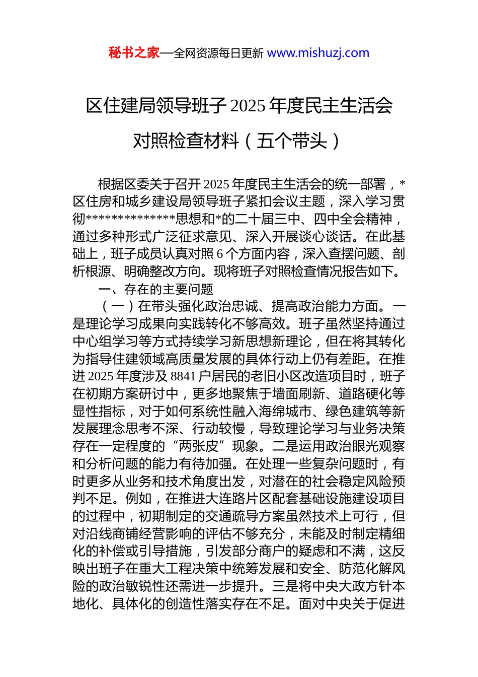 秘书之家—全网资源每日更新 www.mishuzj.com区住建局领导班子 2025 年度民主生活会对照检查材料(五个带头)根据区委关于召开 2025 年度民主生活会的统一部署,*区住房和城乡建设局领导班子紧扣会议主题,深入学习贯彻**************思想和*的二十届三中、四中全会精神,通过多种形式广泛征求意见、深入开展谈心谈话。在此基础上,班子成员认真对照 6 个方面内容,深入查摆问题、剖析根源、明确整改方向。现将班子对照检查情况报告如下。一、存在的主要问题(一)在带头强化政治忠诚、提高政治能力方面。一是理论学习成果向实践转化不够高效。班子虽然坚持通过中心组学习等方式持续学习新思想新理论,但在将其转化为指导住建领域高质量发展的具体行动上仍有差距。在推进 2025 年度涉及 8841 户居民的老旧小区改造项目时,班子在初期方案研讨中,更多地聚焦于墙面刷新、道路硬化等显性指标,对于如何系统性融入海绵城市、绿色建筑等新发展理念思考不深、行动较慢,导致理论学习与业务决策存在一定程度的“两张皮”现象。二是运用政治眼光观察和分析问题的能力有待加强。在处理一些复杂问题时,有时更多从业务和技术角度出发,对潜在的社会稳定风险预判不足。例如,在推进大连路片区配套基础设施建设项目的过程中,初期制定的交通疏导方案虽然技术上可行,但对沿线商铺经营影响的评估不够充分,未能及时制定精细化的补偿或引导措施,引发部分商户的疑虑和不满,这反映出班子在重大工程决策中统筹发展和安全、防范化解风险的政治敏锐性还需进一步提升。三是将中央大政方针本地化、具体化的创造性落实存在不足。面对中央关于促进秘书之家—全网资源每日更新 www.mishuzj.com房地产市场平稳健康发展的决策部署,班子虽然及时组织了学习传达,但在结合*区实际,研究出台具有针对性、创新性的政策工具包方面略显迟缓。在市场下行压力加大的背景下,班子更多的是执行上级普适性政策,主动作为、靠前服务,为企业纾困解难、提振市场信心的创新举措不多,未能完全将中央精神转化为推动本地房地产市场企稳回暖的有力抓手。(二)在带头固本培元、增强*性方面。一是在急难险重任务中锤炼*性的自觉性不高。班子成员能够身先士卒、靠前指挥,但在繁重的业务工作中,有时会将工作等同于*性锻炼,忽视了在攻坚克难中主动进行思想淬炼。在 2025年城镇老旧小区改造 7325 套的年度任务推进过程中,班子会议和日常调度多集中于工程进度、资金拨付等具体事务较少组织专题讨论,深入挖掘项目背后所蕴含的“人民城市人民建”的深刻内涵,未能将项目一线真正打造成为锤炼*性、践行初心使命的“大熔炉”。二是开展批评与自我批评的“辣味”尚显不足。在民主生活会或组织生活会上班子成员间的相互批评有时还停留在“提希望”“提建议”的层面,存在以工作建议代替思想交锋的现象。在复盘一些工程质量监管不到位的问题时,批评意见往往点到为止,未能深挖背后是否存在“老好人”思想或是不愿得罪人的心态,自我批评也偶有避重就轻、对深层次思想问题触及不深的情况。三是*性原则在具体决策中的“压舱石”作用发挥不充分。面对一些两难抉择时,有时会不自觉地以实用主义代替*性原则。在一次为确保老旧小区加装36 台电梯的年度任务按时完成的供应商选择中,班子曾倾向于一家报价较低、承诺工期最短但过往社区协调经验相对欠缺的企业。这种重效率轻群众工作的思维倾向,反映出在具体决策中,以人民为中心的根本立场和*性原则的衡量标尺树得还不够牢固。(三)在带头敬畏人民、敬畏组织、敬畏法纪方面。秘书之家—全网资源每日更新 www.mishuzj.com一是“四下基层”制度落实得不够深入。虽然班子成员经常下到项目工地和社区,但有时存在“被安排”调研的现象,未能完全做到“身入”更“心入”。在部分老旧小区改造项目启动前的意见征询环节,虽然召开了居民代表会但会议议程偏向于政策解读和方案通报,对居民提出的施工噪音、建筑垃圾清运等个性化、细节化问题未能当场给予充分回应和吸纳,导致后续施工中仍出现了不可避免的群众投诉,说明深入基层听真话、察实情的功夫还不到家二是民主集中制执...
